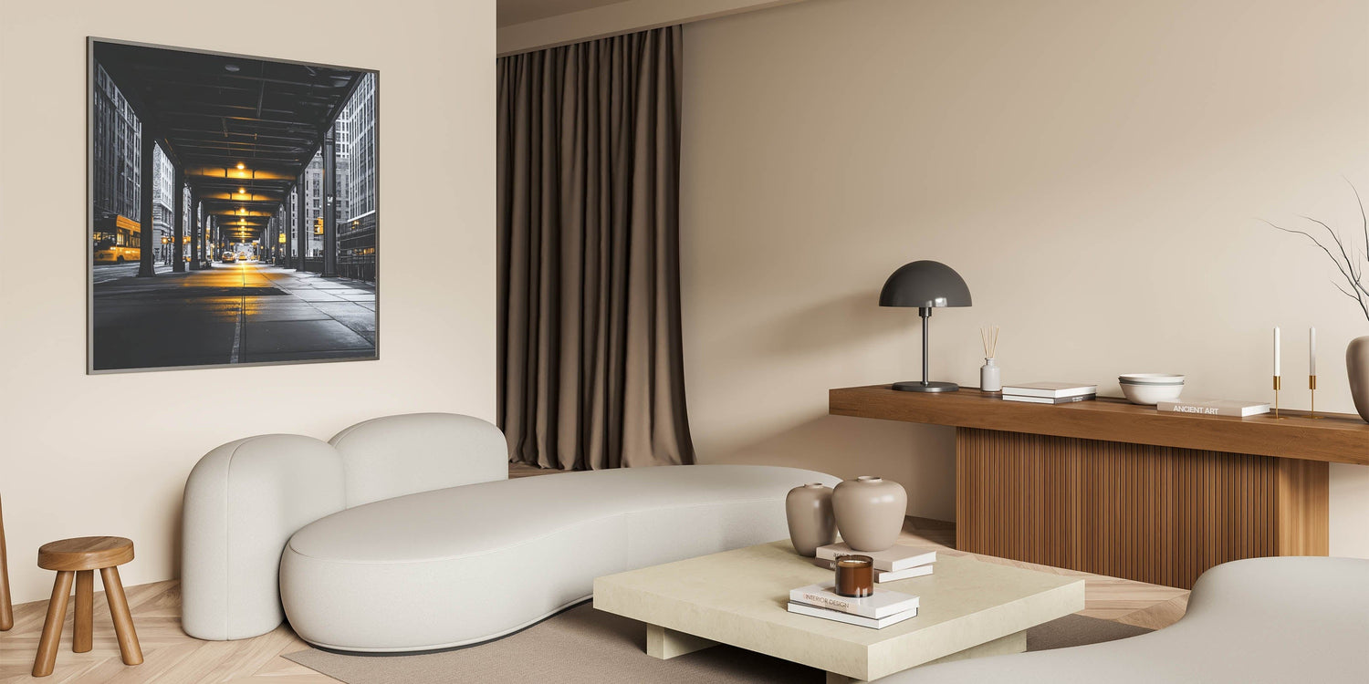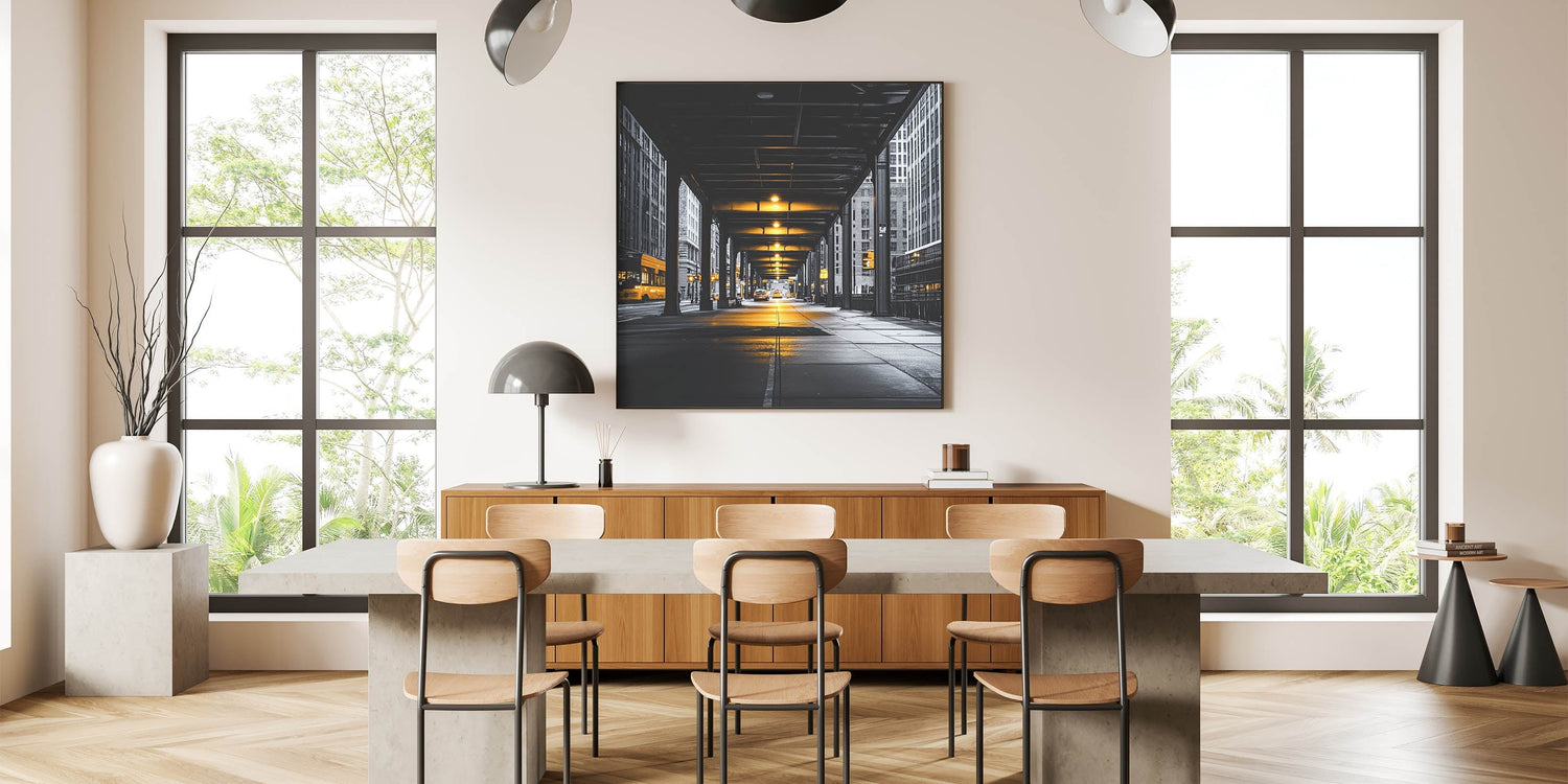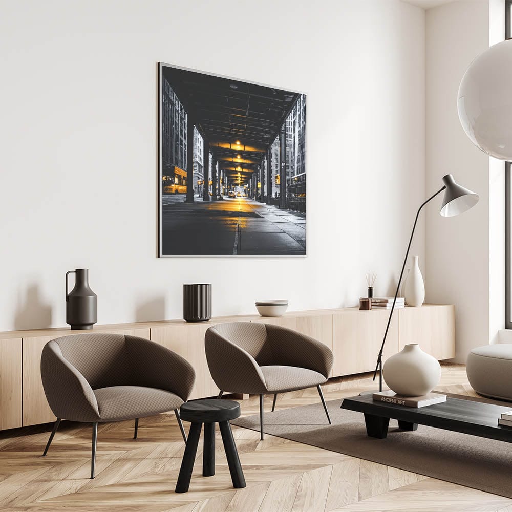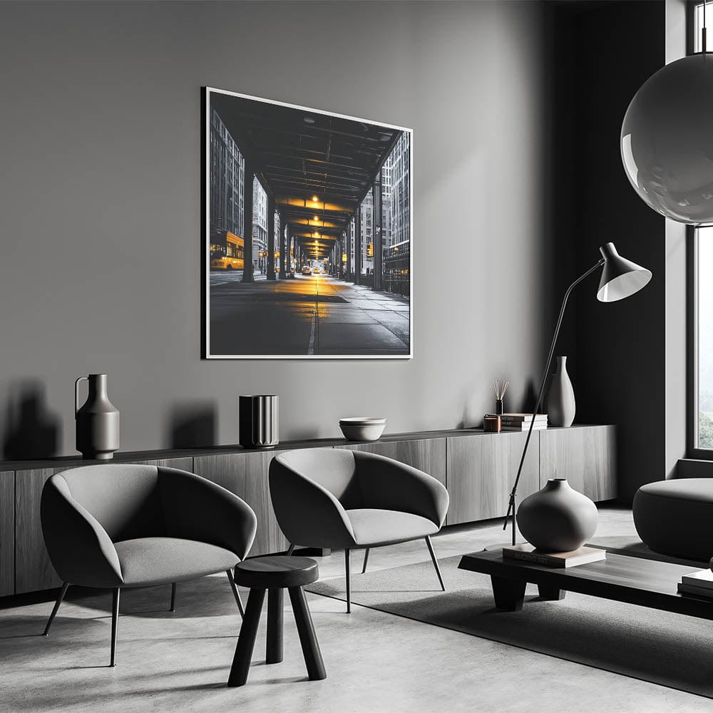 Immerse yourself in the energy of the city with this modern cityscape wall art. Featuring a striking perspective of an urban underpass lined with glowing streetlights and surrounded by towering skyscrapers, this urban skyline canvas print brings the vibrancy of metropolitan life into your space. The contrast of warm artificial lights against cool city tones makes this piece a must-have for urban decor lovers.