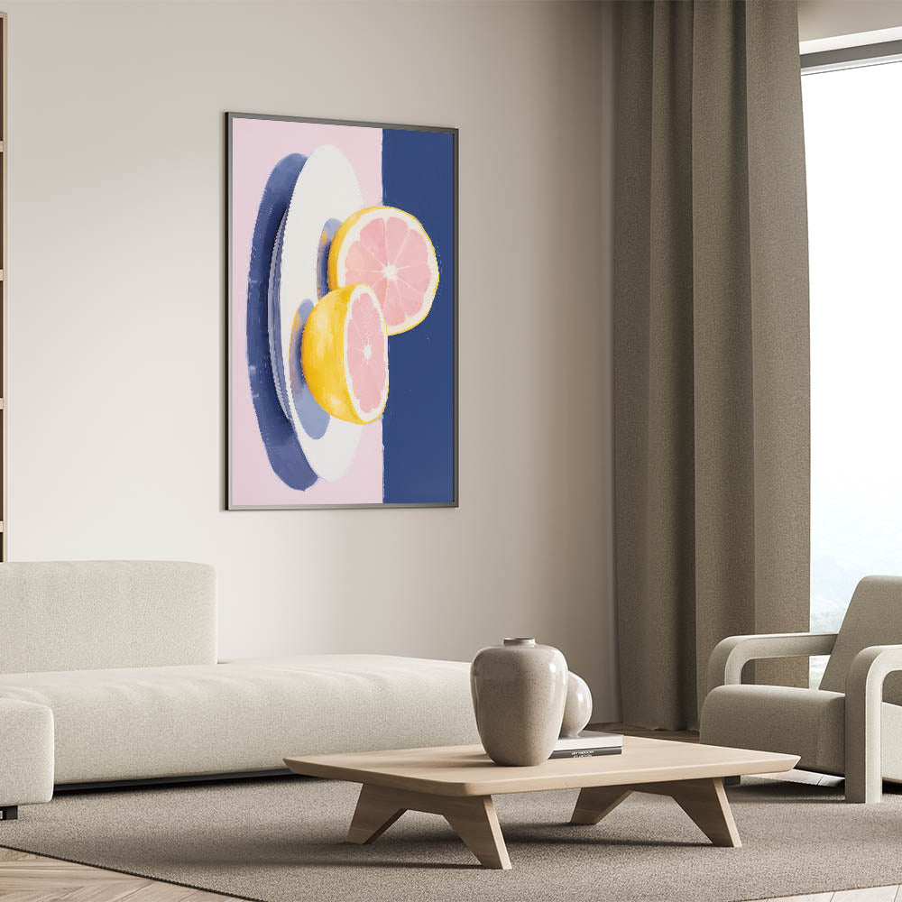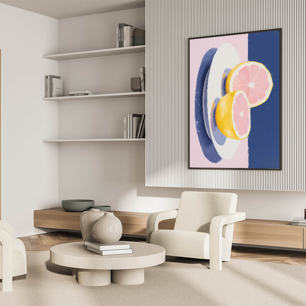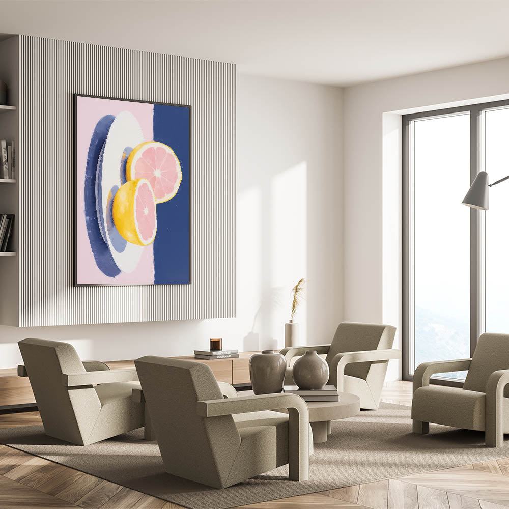 Brighten up your space with this striking electric-themed citrus artwork. Featuring bold yellow citrus fruits against a clean, minimalist background, this piece brings a pop of color and freshness to any room. The blend of soft pink, crisp white, and deep navy creates a dynamic balance, making this electric art canvas perfect for modern spaces seeking a touch of brightness and creativity.