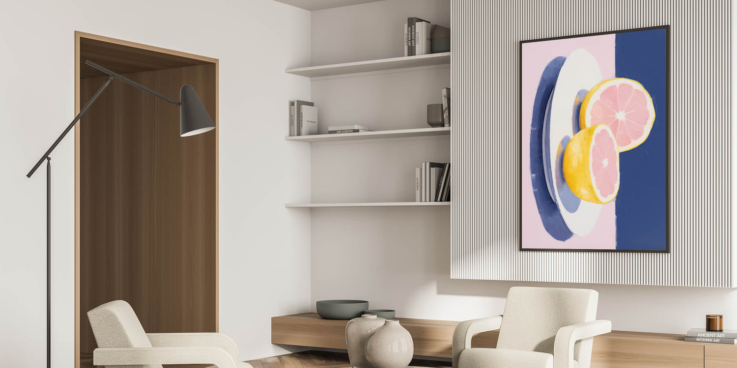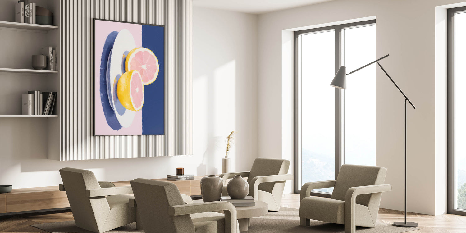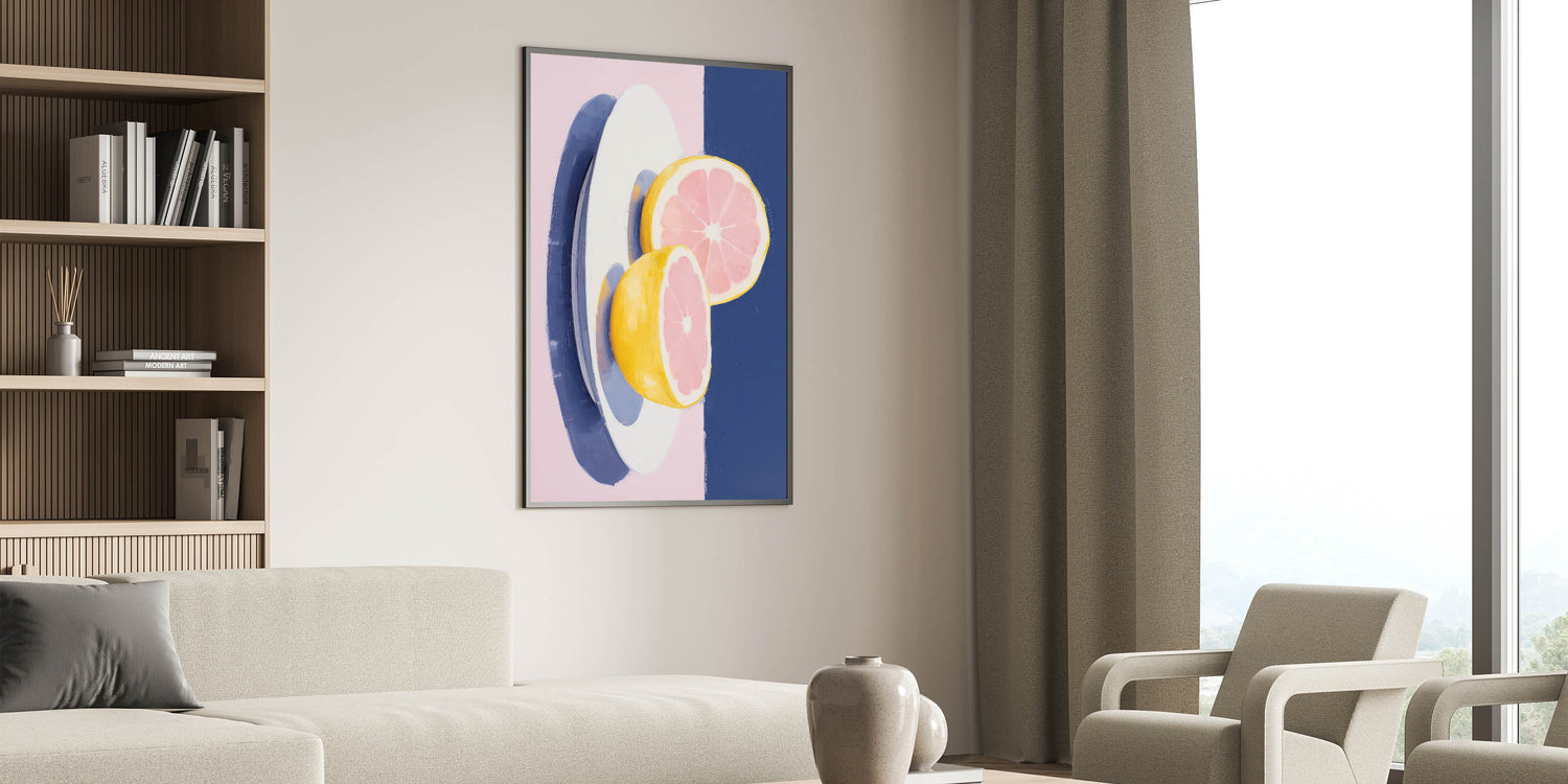 Brighten up your space with this striking electric-themed citrus artwork. Featuring bold yellow citrus fruits against a clean, minimalist background, this piece brings a pop of color and freshness to any room. The blend of soft pink, crisp white, and deep navy creates a dynamic balance, making this electric art canvas perfect for modern spaces seeking a touch of brightness and creativity.