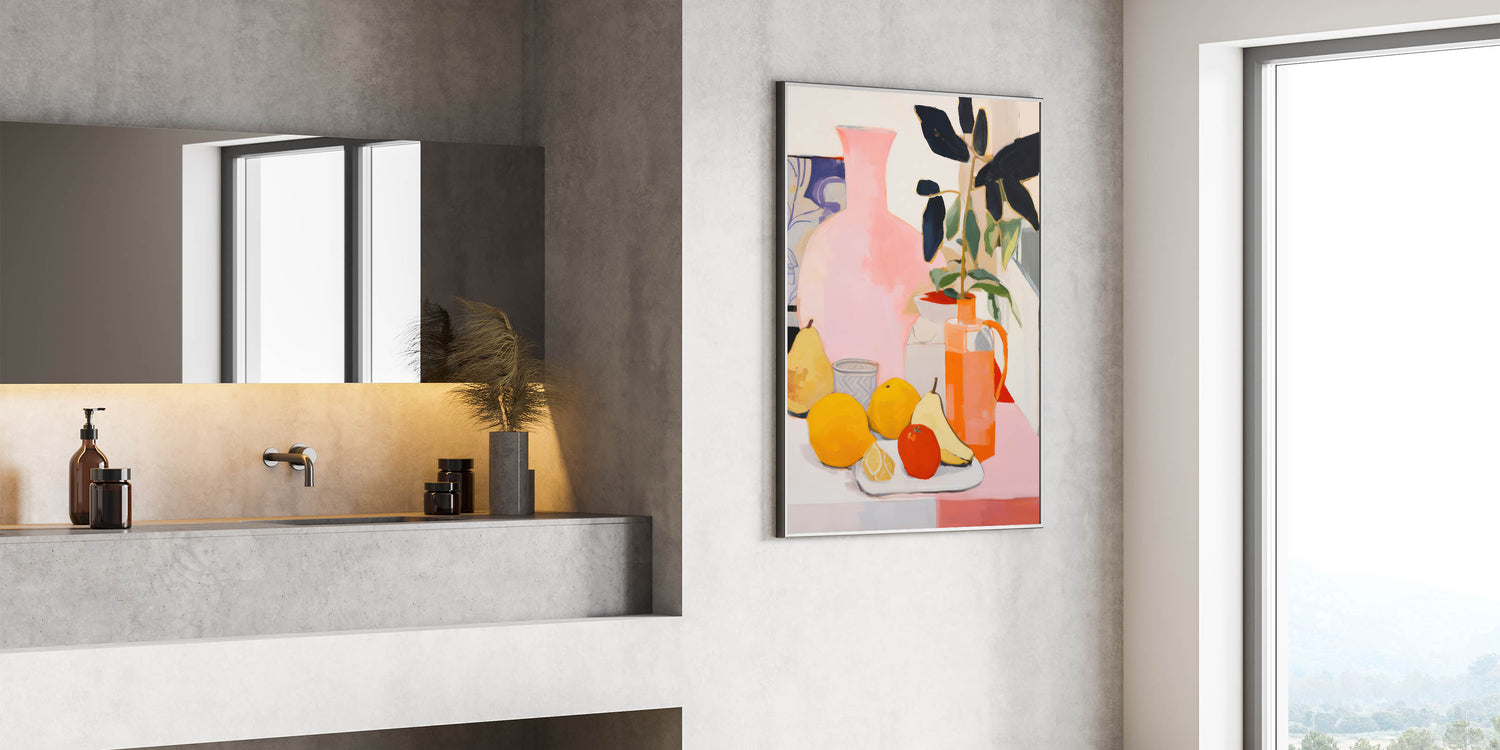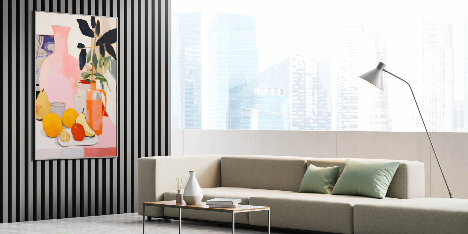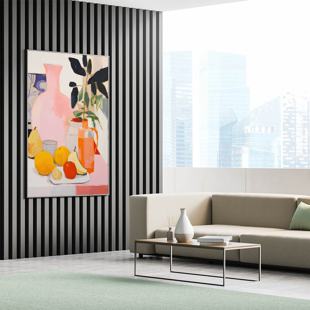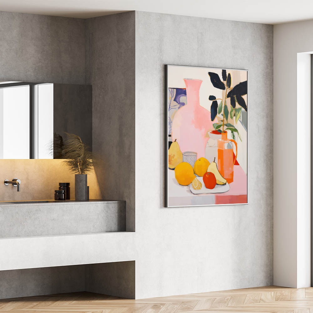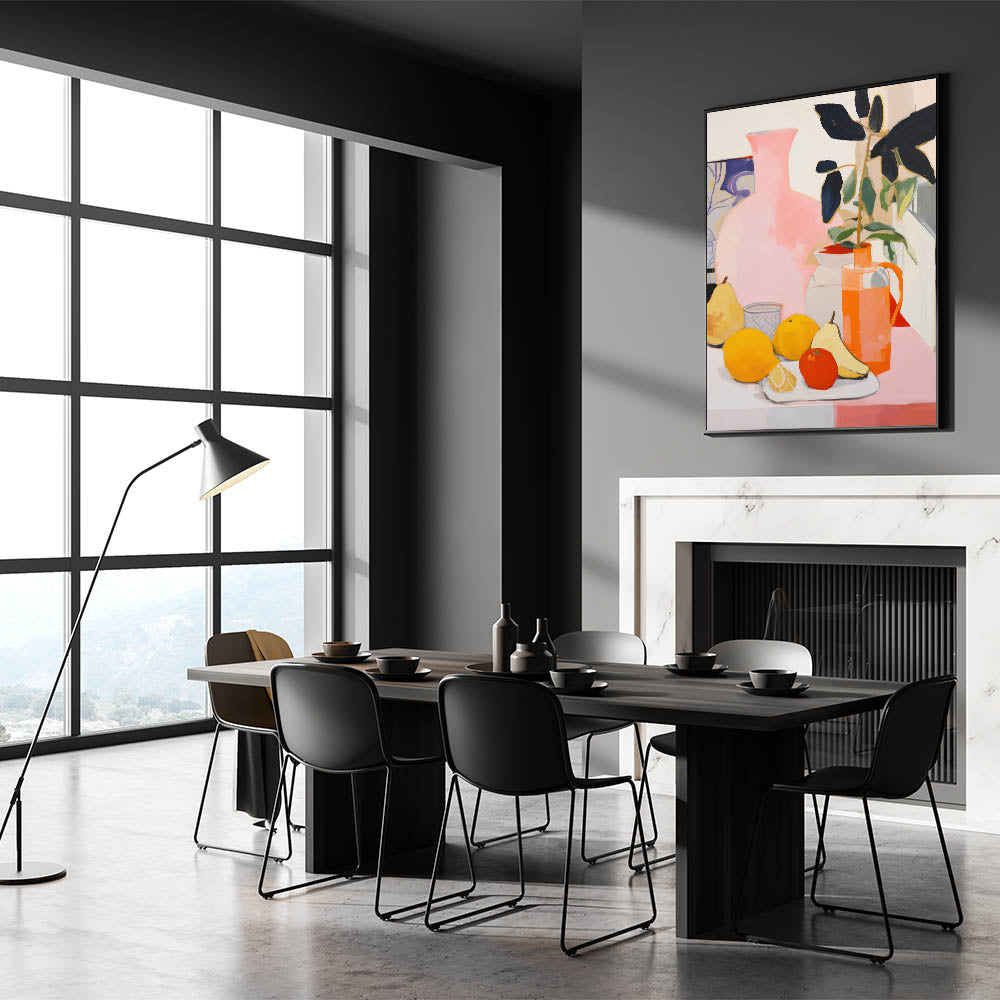 Bring a sense of energy and warmth to your space with this modern electric wall art, featuring a stunning composition of fruit and floral elements. The lively mix of bright yellows, oranges, and soft pinks makes this electric art canvas a vibrant and dynamic addition to any room. The abstract style combined with bold colors creates a visually captivating piece that instantly enhances your decor.