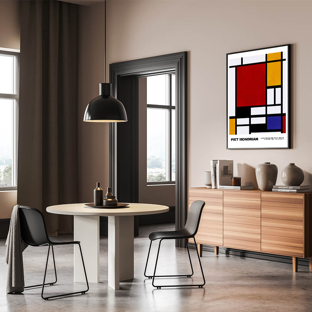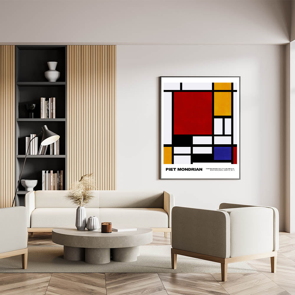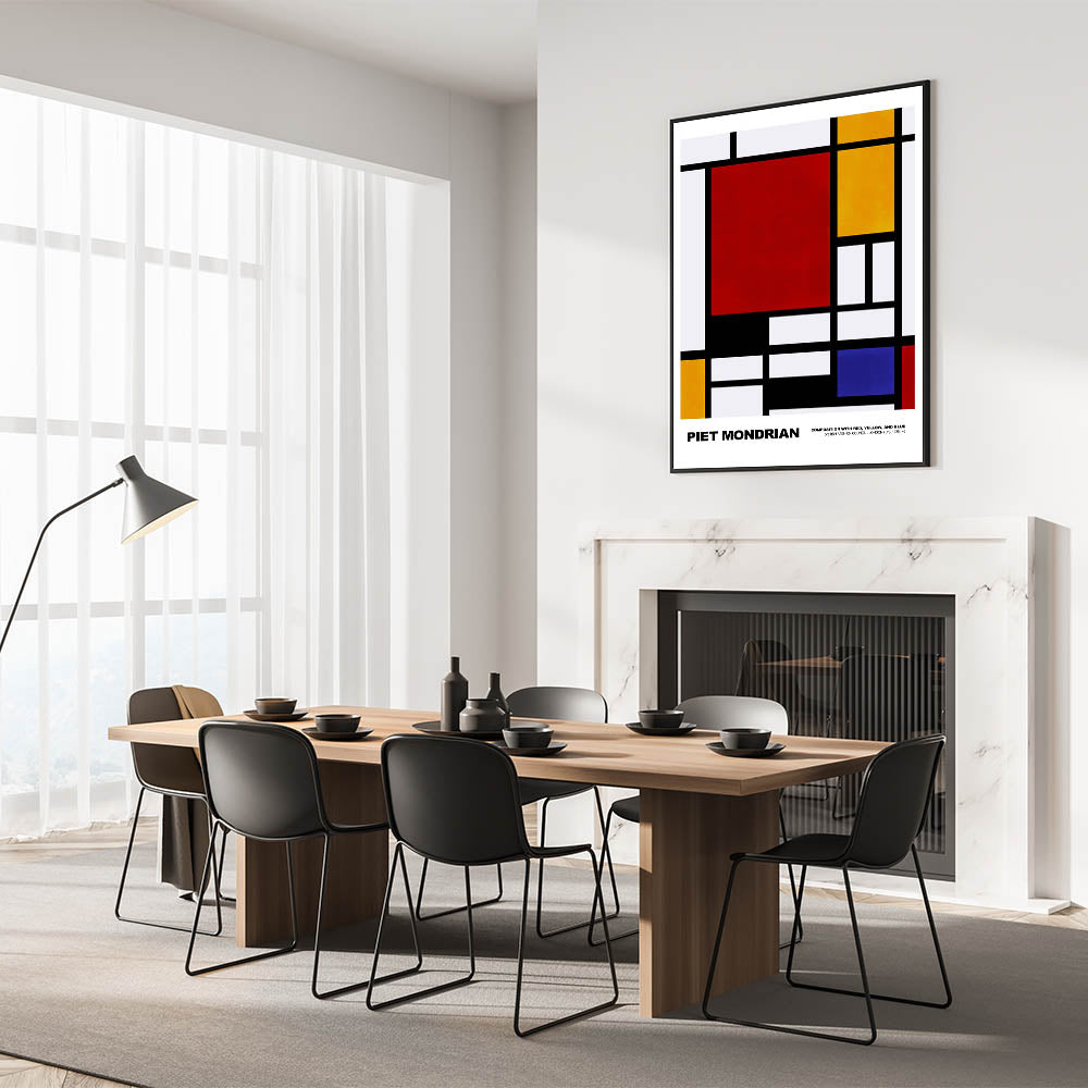 Transform your space with this "Modern Geometric Art" inspired by Piet Mondrian's iconic abstract style. Featuring bold red, yellow, and blue blocks framed by black lines, this artwork captures the essence of modernism and minimalism. The clean geometric composition adds a sophisticated touch to any room, making it an ideal statement piece for contemporary interiors.