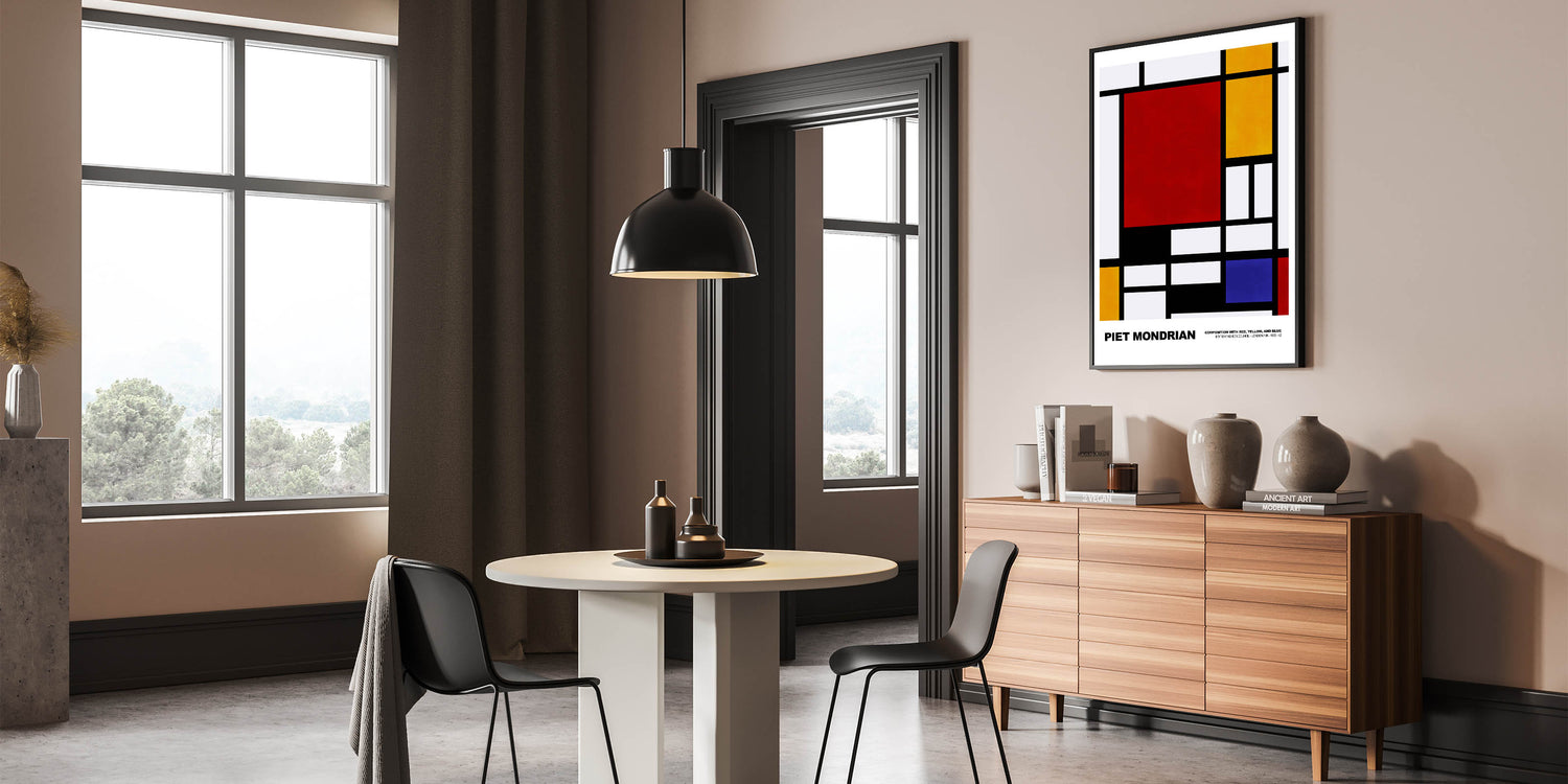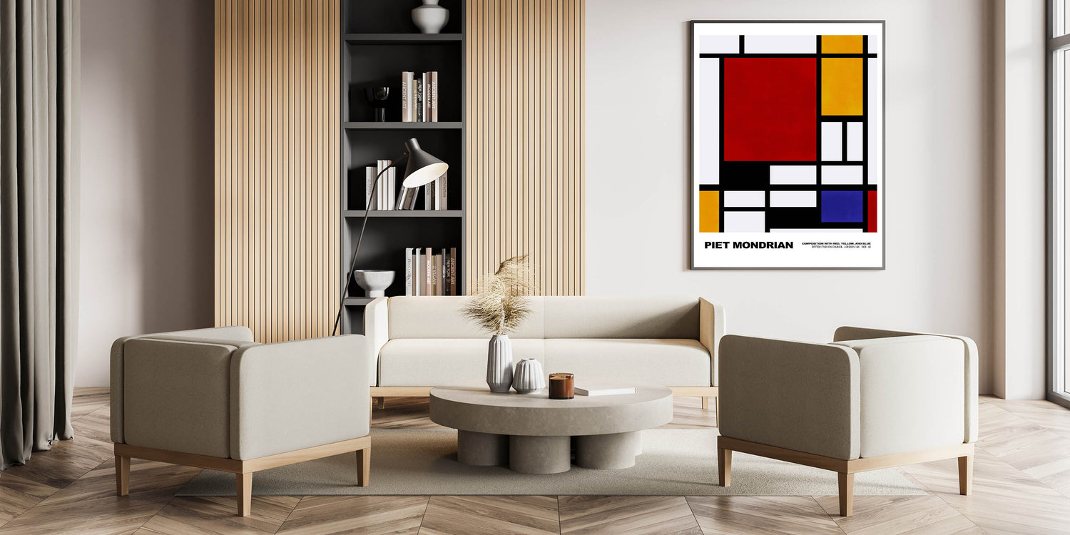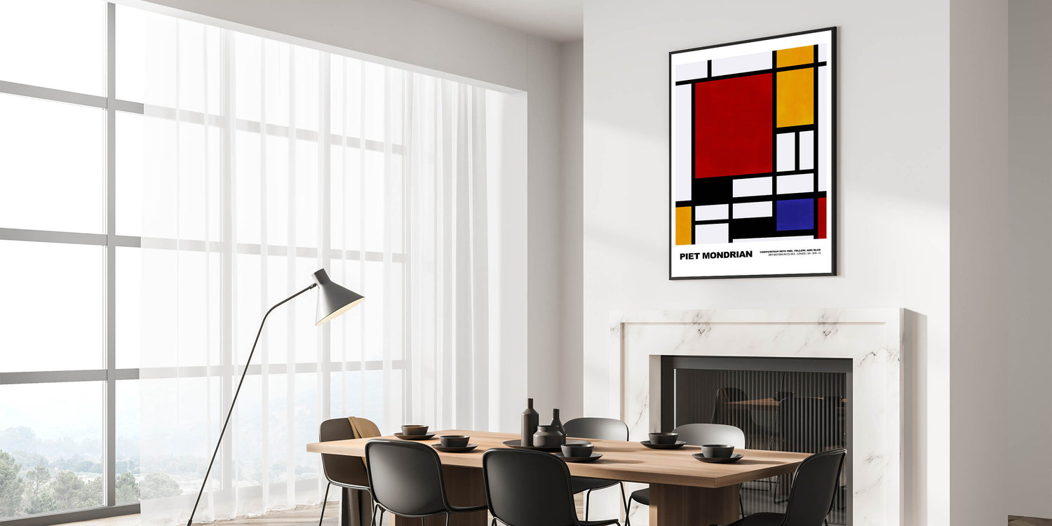 Transform your space with this "Modern Geometric Art" inspired by Piet Mondrian's iconic abstract style. Featuring bold red, yellow, and blue blocks framed by black lines, this artwork captures the essence of modernism and minimalism. The clean geometric composition adds a sophisticated touch to any room, making it an ideal statement piece for contemporary interiors.