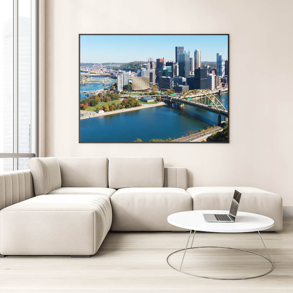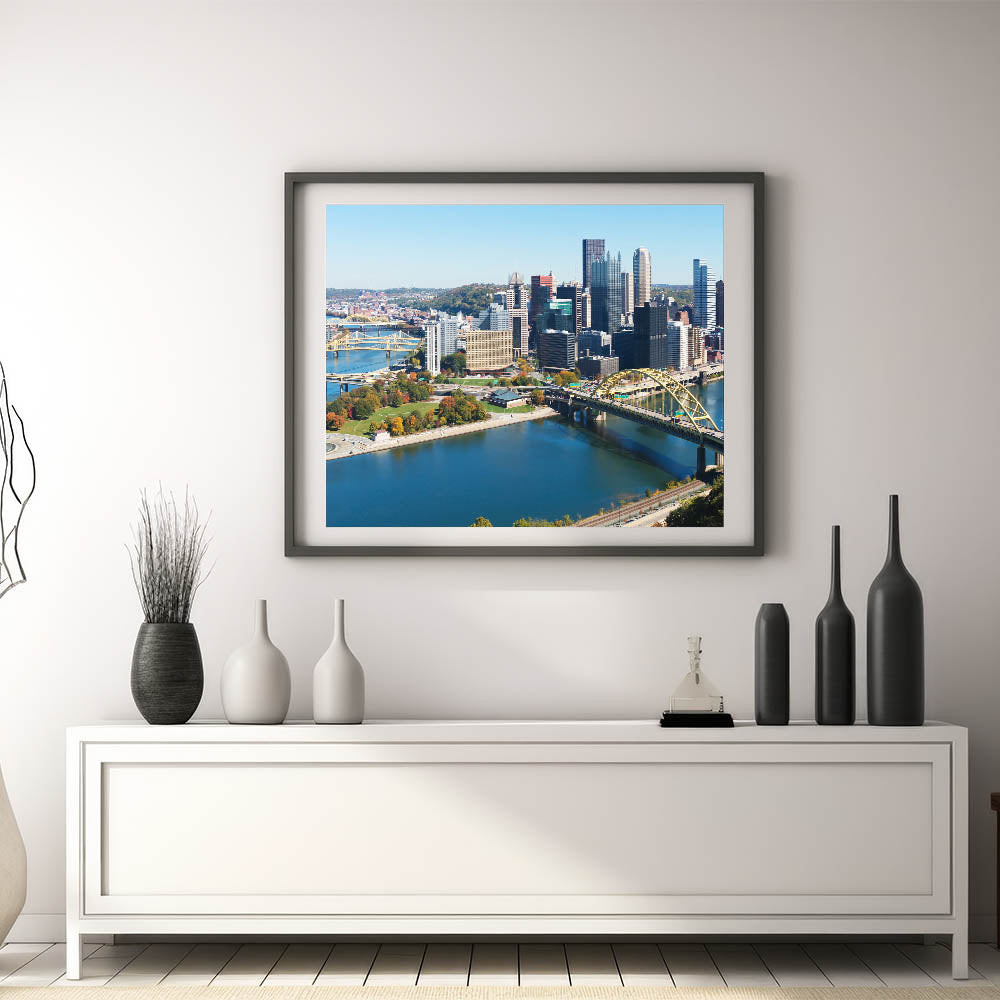 Capture the beauty of Pittsburgh with this stunning view of the city's skyline and rivers. This modern cityscape art features the iconic yellow bridges and the serene water of Pittsburgh's famous Three Rivers. The vibrant downtown area, combined with the natural landscape, creates a harmonious blend of urban and natural elements, making it a perfect piece for anyone who loves Pittsburgh’s unique charm.