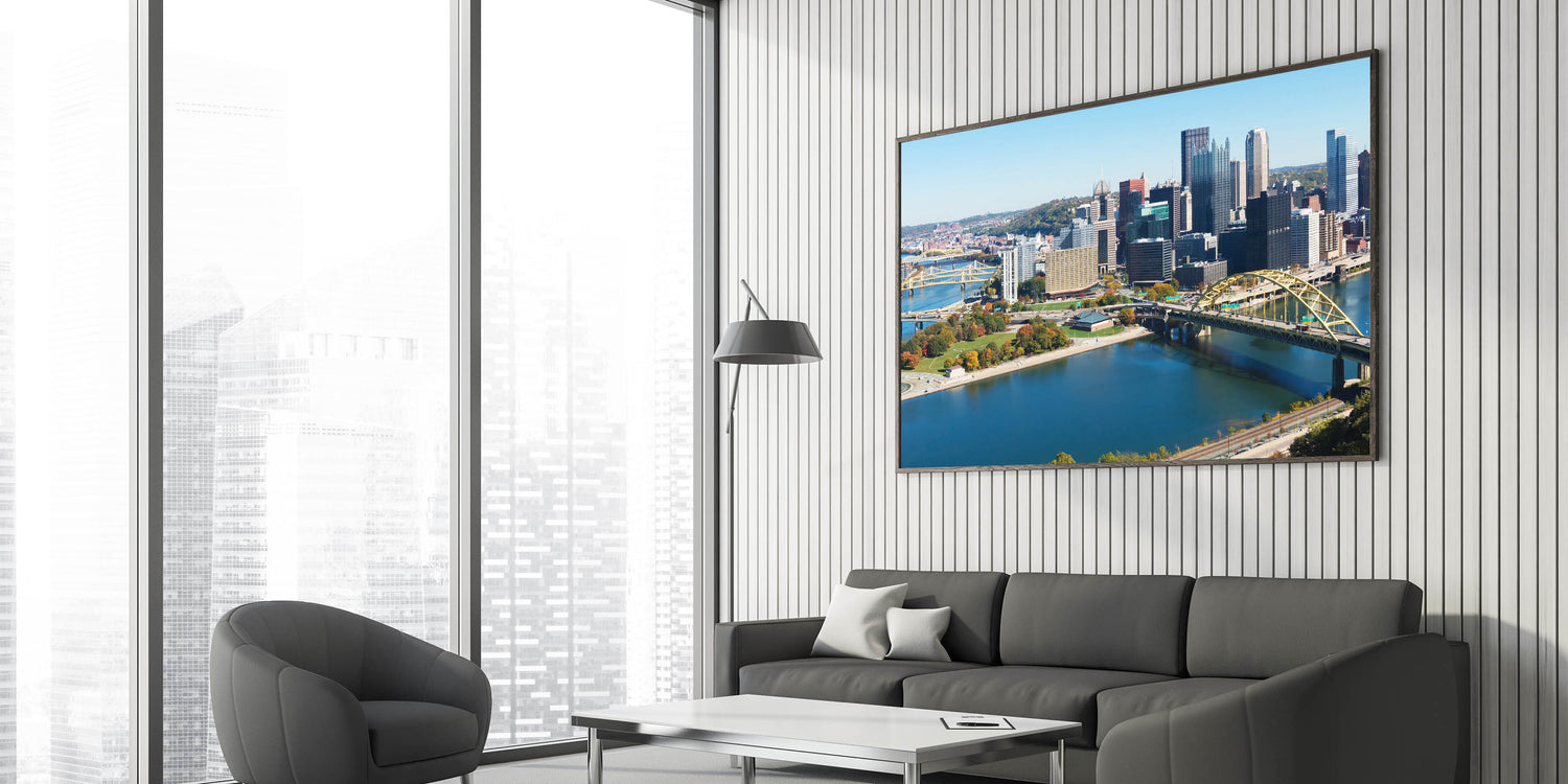 This modern Pittsburgh cityscape art brings the essence of the Steel City into your home. The bold skyline and peaceful water scene create a dynamic yet calming visual, making it a standout addition to any space.