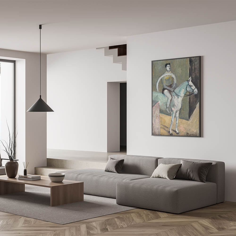 This Stylish Wall Art blends the dynamic energy of a circus scene with a calming color palette, offering a balance of movement and tranquility. Transform your decor with this Unique Modern Art, perfect for adding a touch of narrative and creativity to your home.