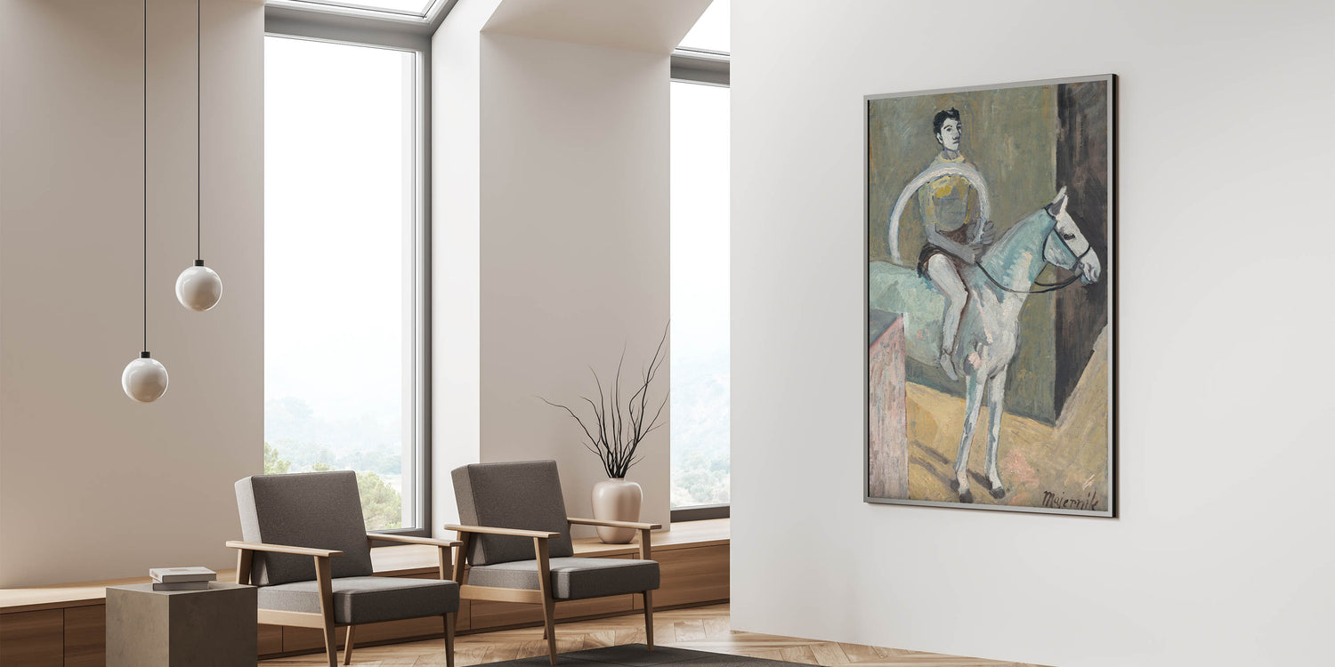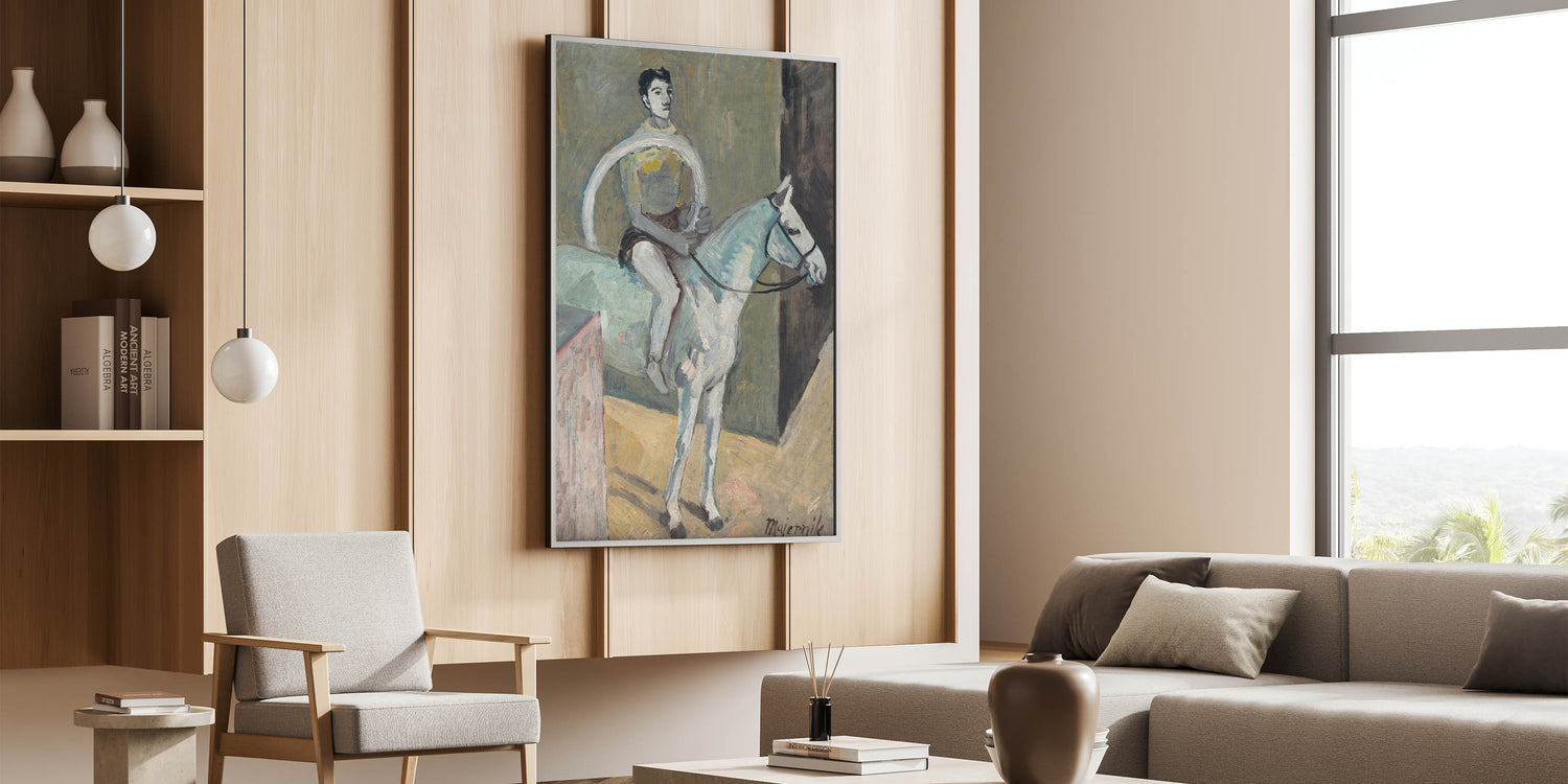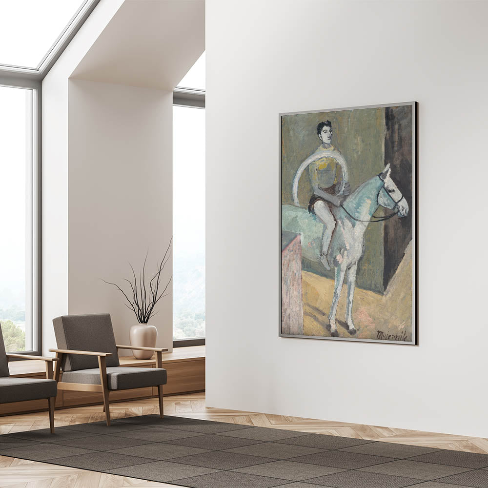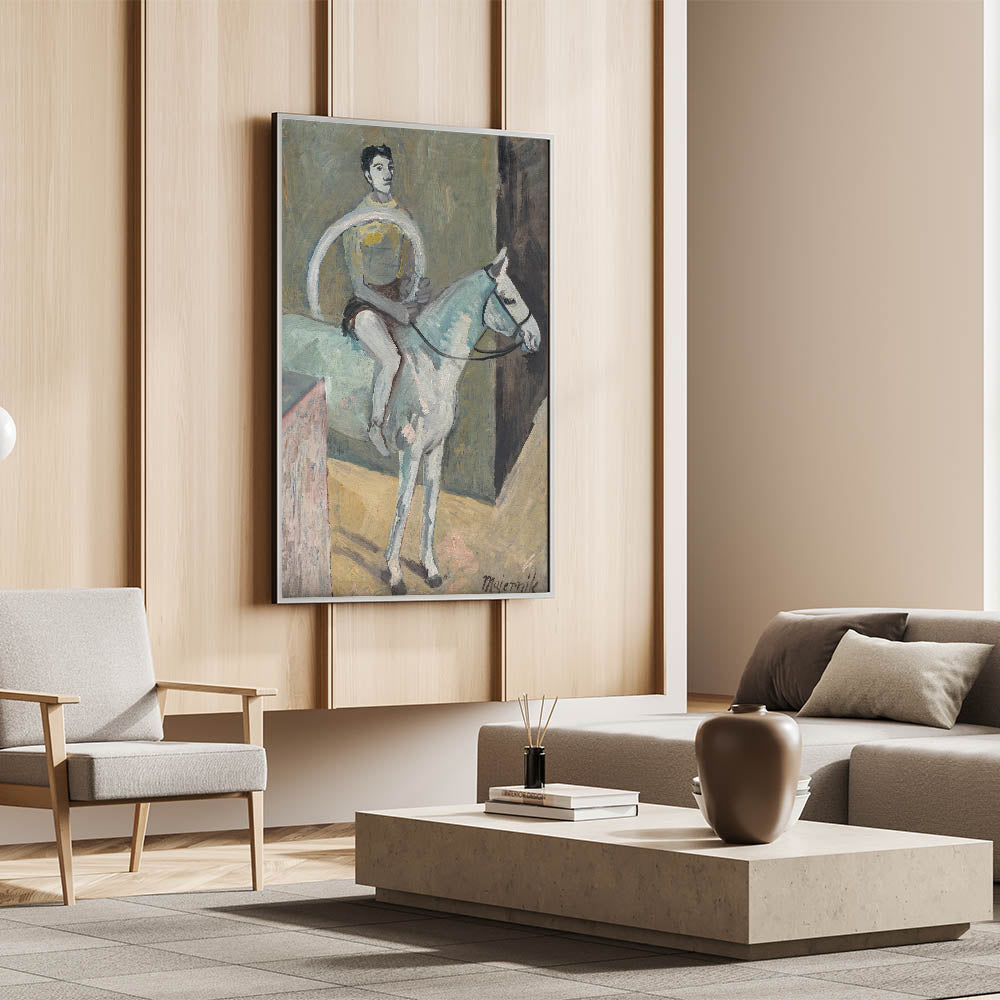 Step into a world of whimsy and artistry with this Modern Wall Art, featuring an abstract depiction of a circus rider. Rendered in a soothing palette of pastel blues, yellows, and grays, this artwork brings a playful yet sophisticated aesthetic to any space. The bold brushstrokes and unique composition evoke the charm of Contemporary Art, making it a standout piece for creative interiors.