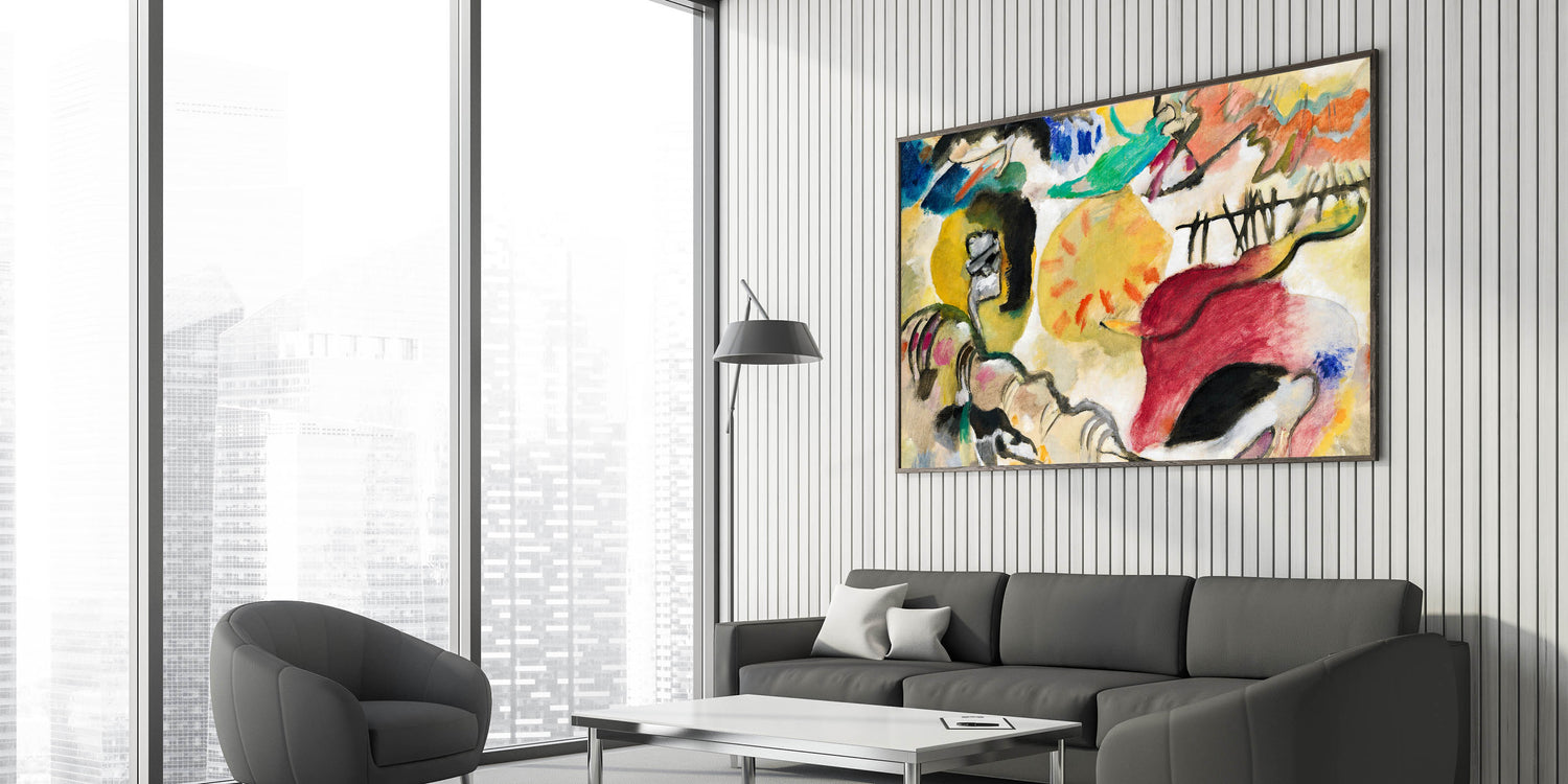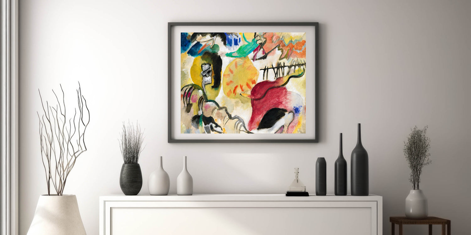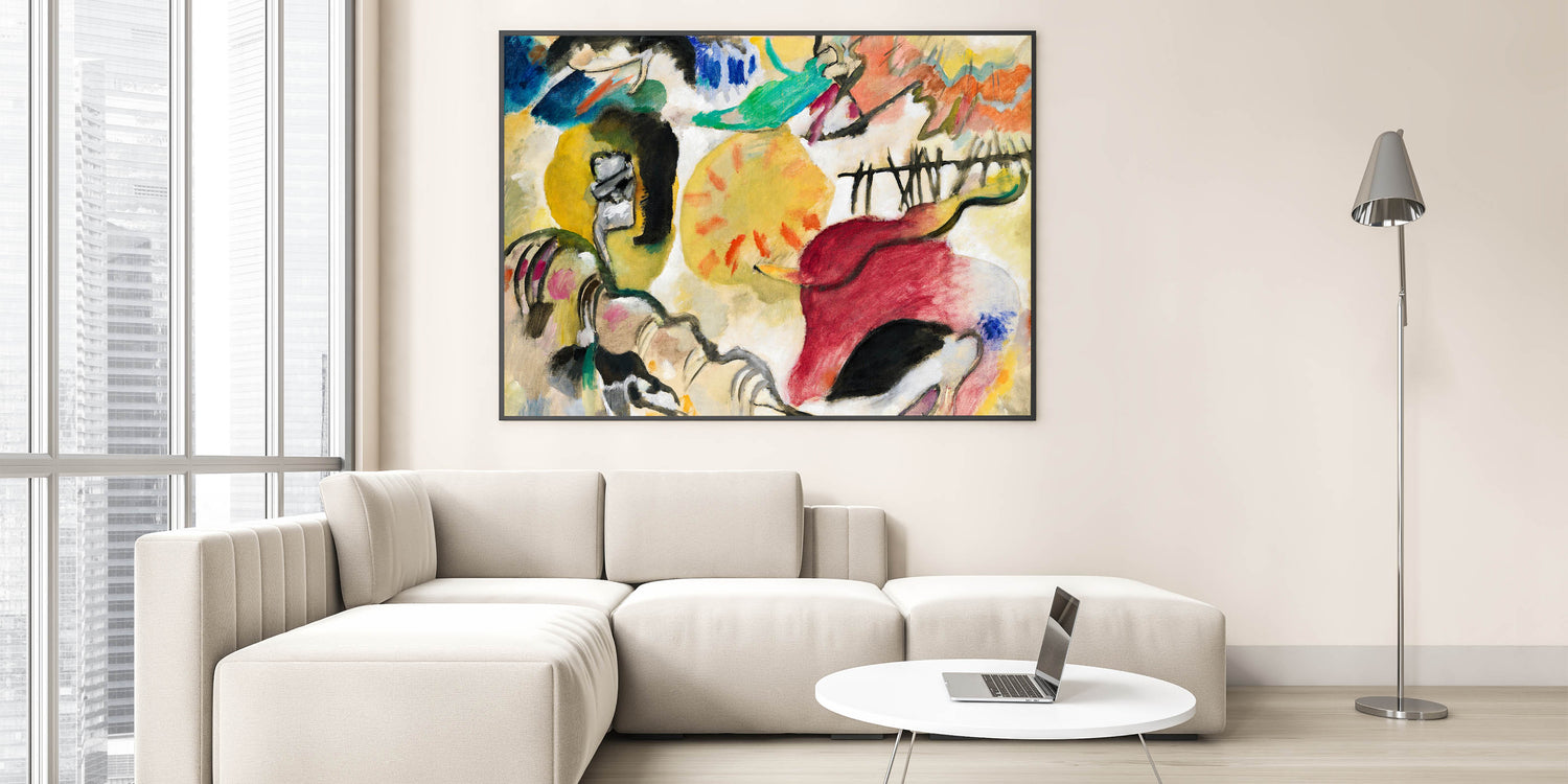 Introduce a burst of color and movement to your space with this captivating piece of Modern Wall Art, inspired by Wassily Kandinsky's "Garden of Love II." This abstract design features a harmonious blend of colors and forms, making it an ideal addition to trendy home decor. The artwork's dynamic composition and vibrant hues offer a modern design element that complements any contemporary setting.