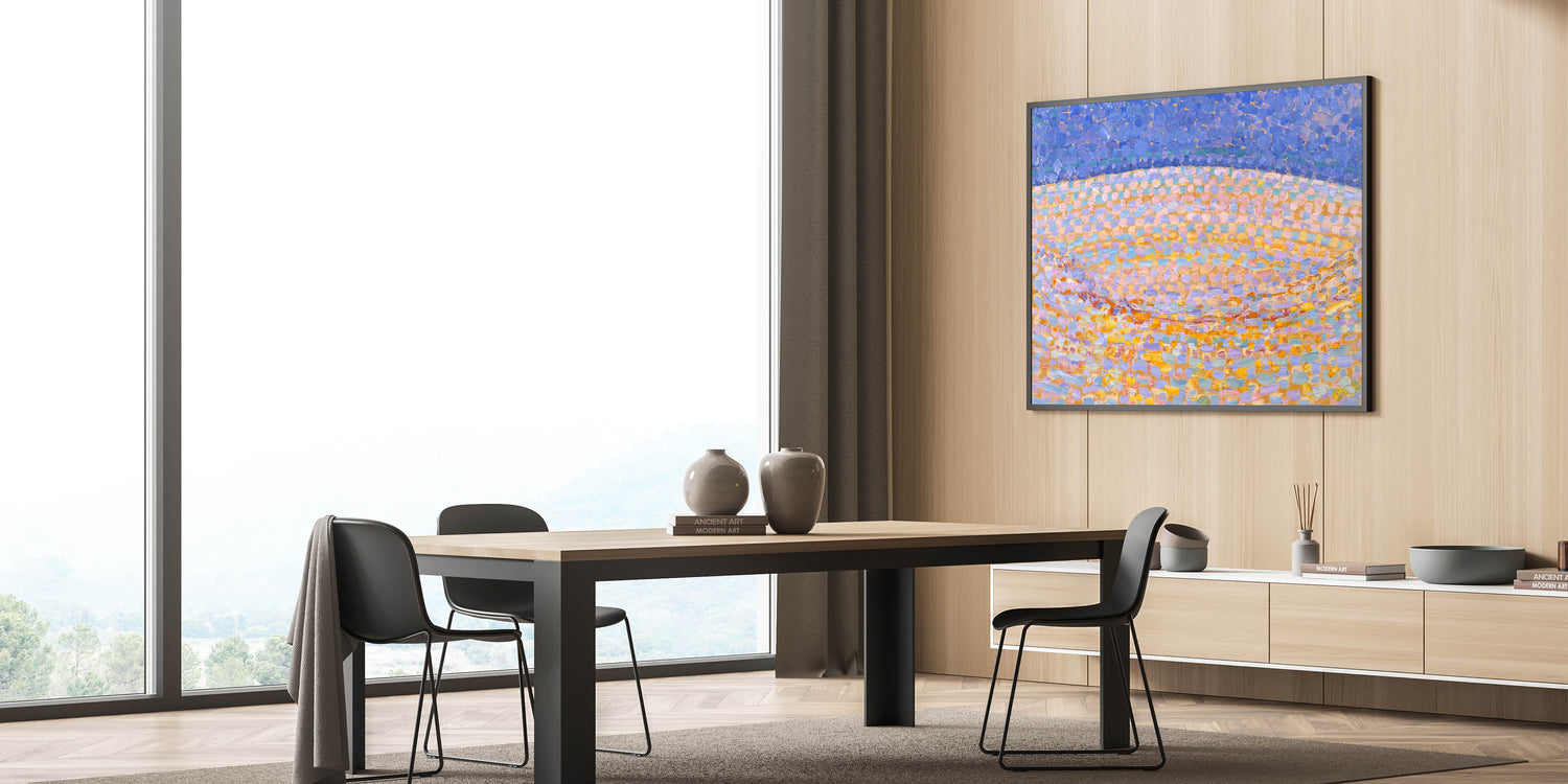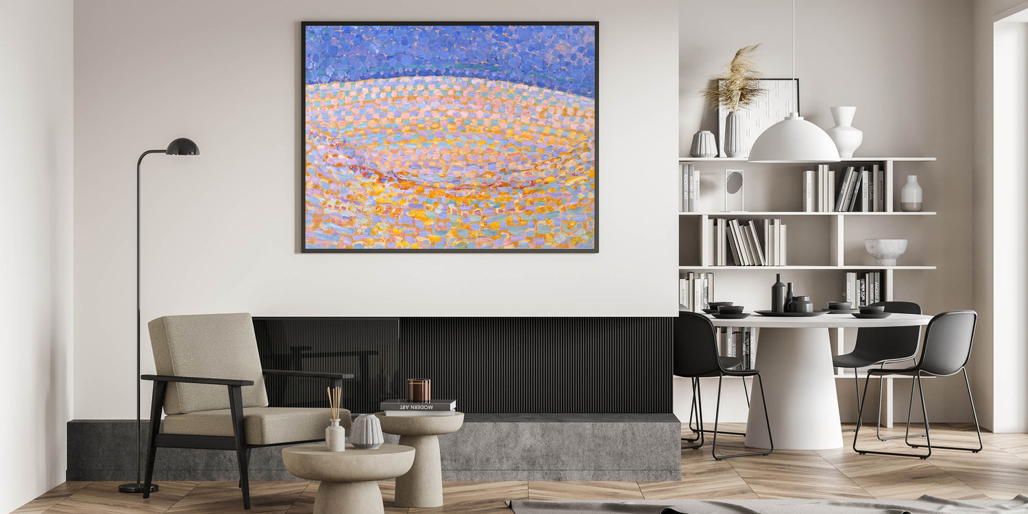 Bring a soft yet vibrant touch to your space with this Modern Wall Art inspired by Piet Mondrian's "Dune III." This piece showcases Mondrian's exploration of color and texture with a pointillist approach, using pastel hues of blue, lavender, peach, and yellow to create a mesmerizing dune landscape. Ideal for art lovers who appreciate subtle yet dynamic decor, this artwork adds a gentle splash of color to any room.