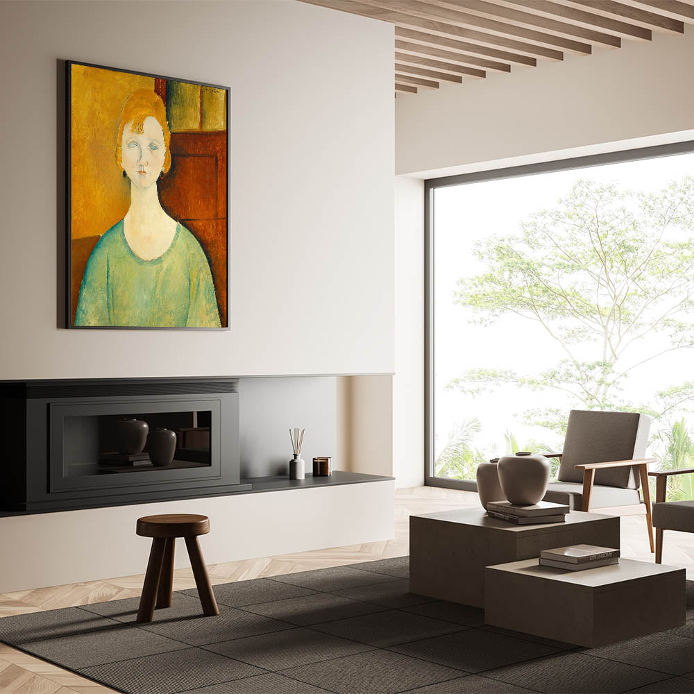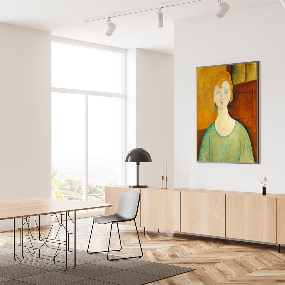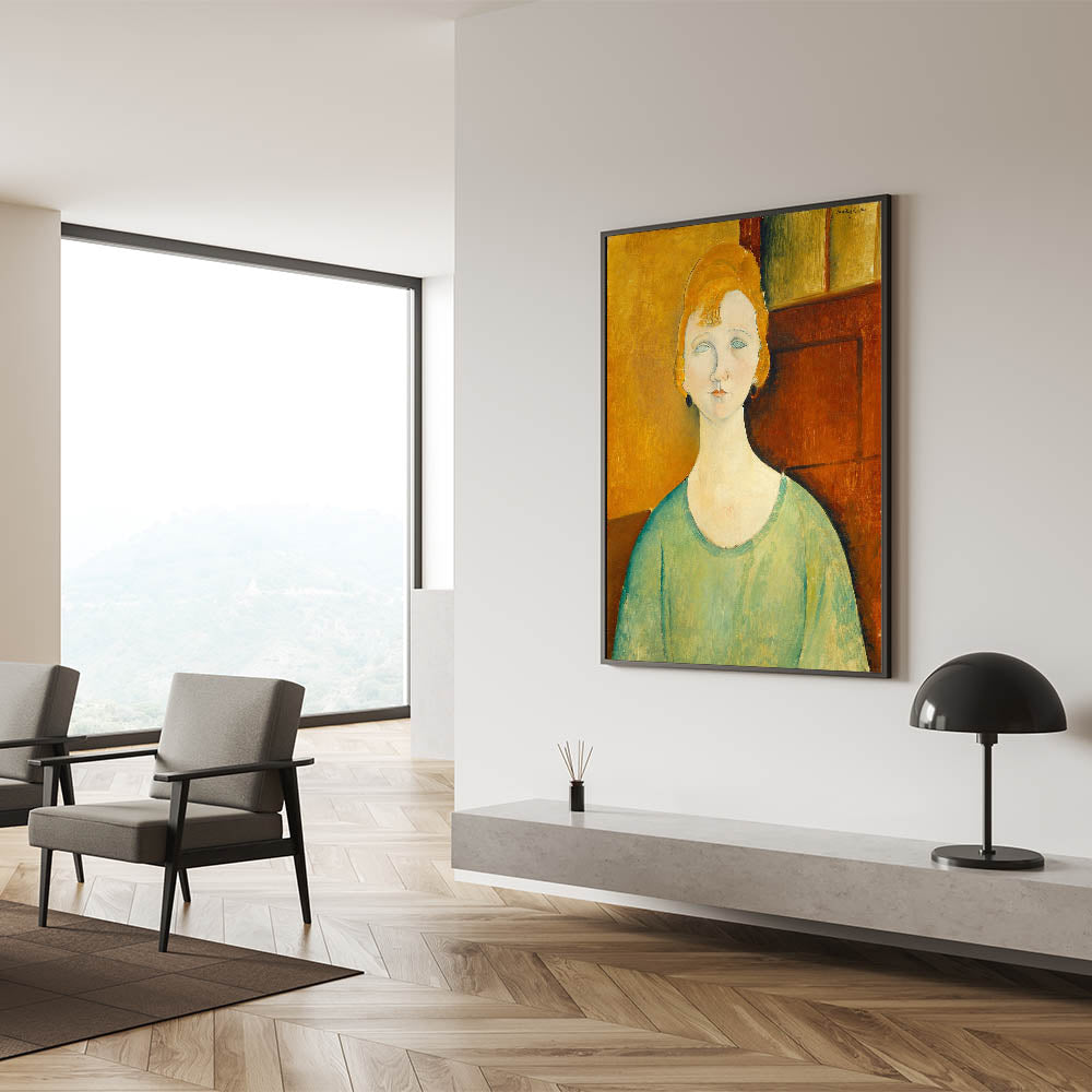 Enhance your decor with the timeless beauty of the "Girl in Green Blouse" Modern Wall Art. This captivating piece, inspired by Amedeo Modigliani's signature style, features soft yet vibrant tones, elongated forms, and subtle expressions. It effortlessly combines elegance with modern design elements, making it a centerpiece for any space.