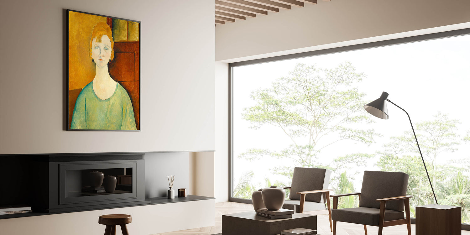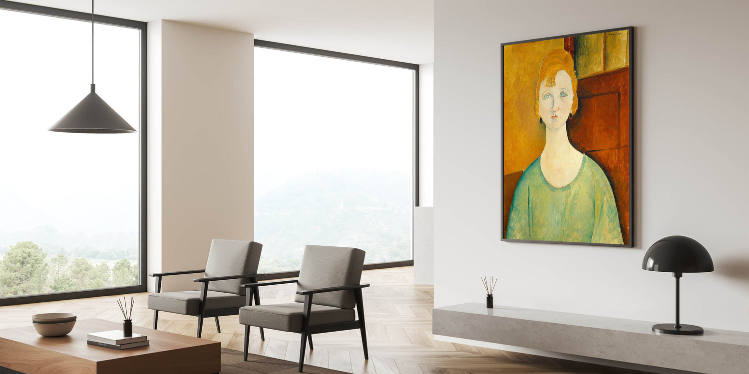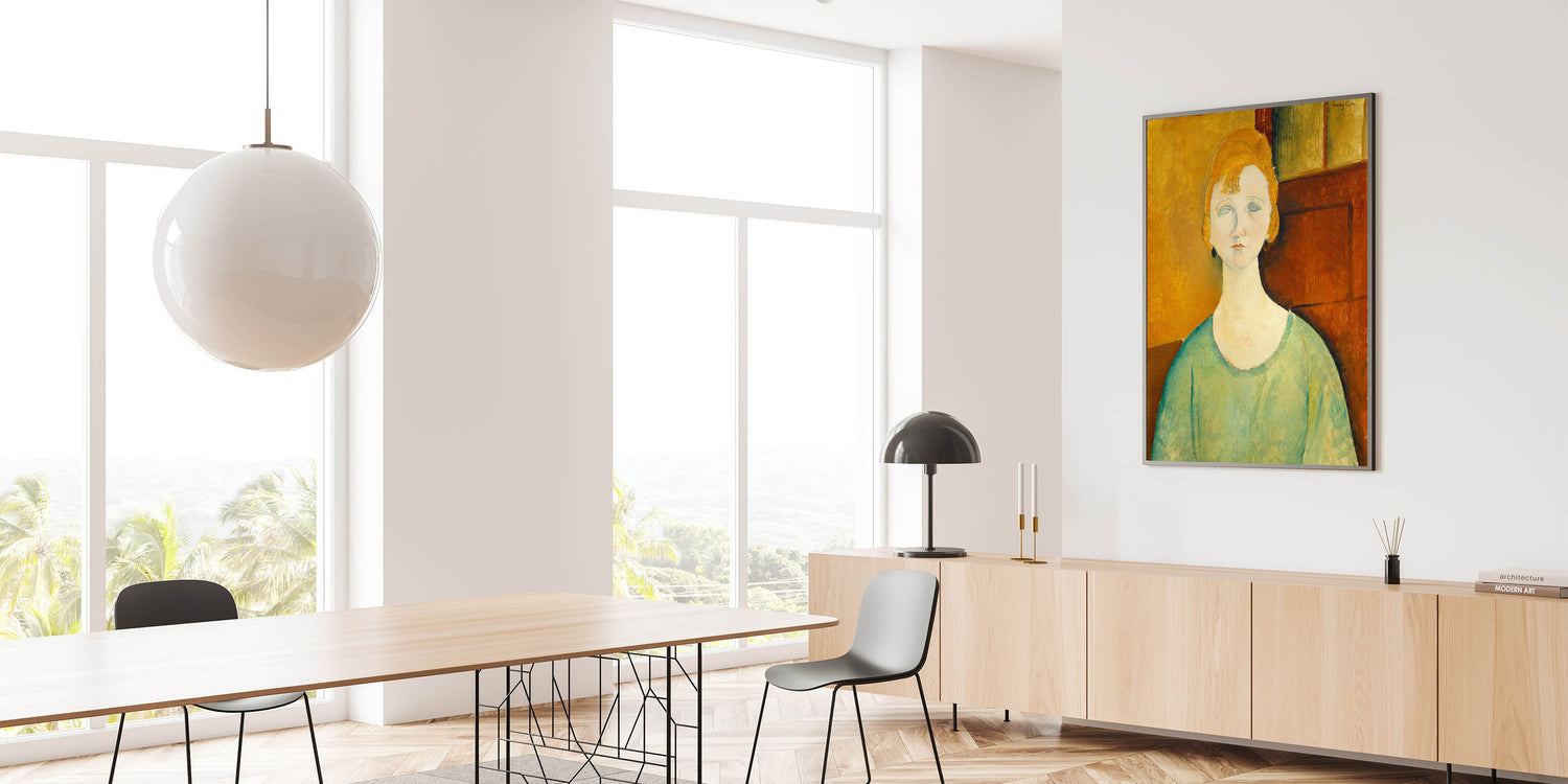 Enhance your decor with the timeless beauty of the "Girl in Green Blouse" Modern Wall Art. This captivating piece, inspired by Amedeo Modigliani's signature style, features soft yet vibrant tones, elongated forms, and subtle expressions. It effortlessly combines elegance with modern design elements, making it a centerpiece for any space.