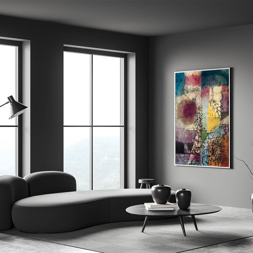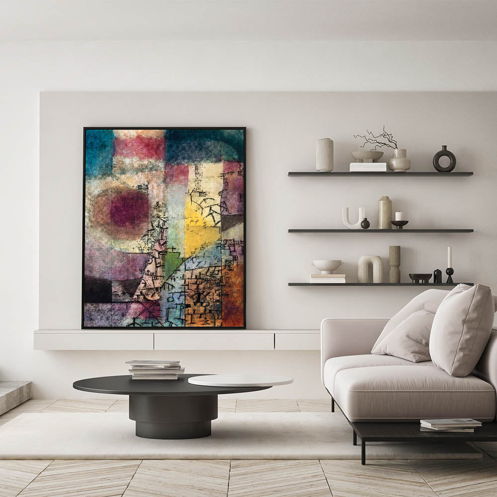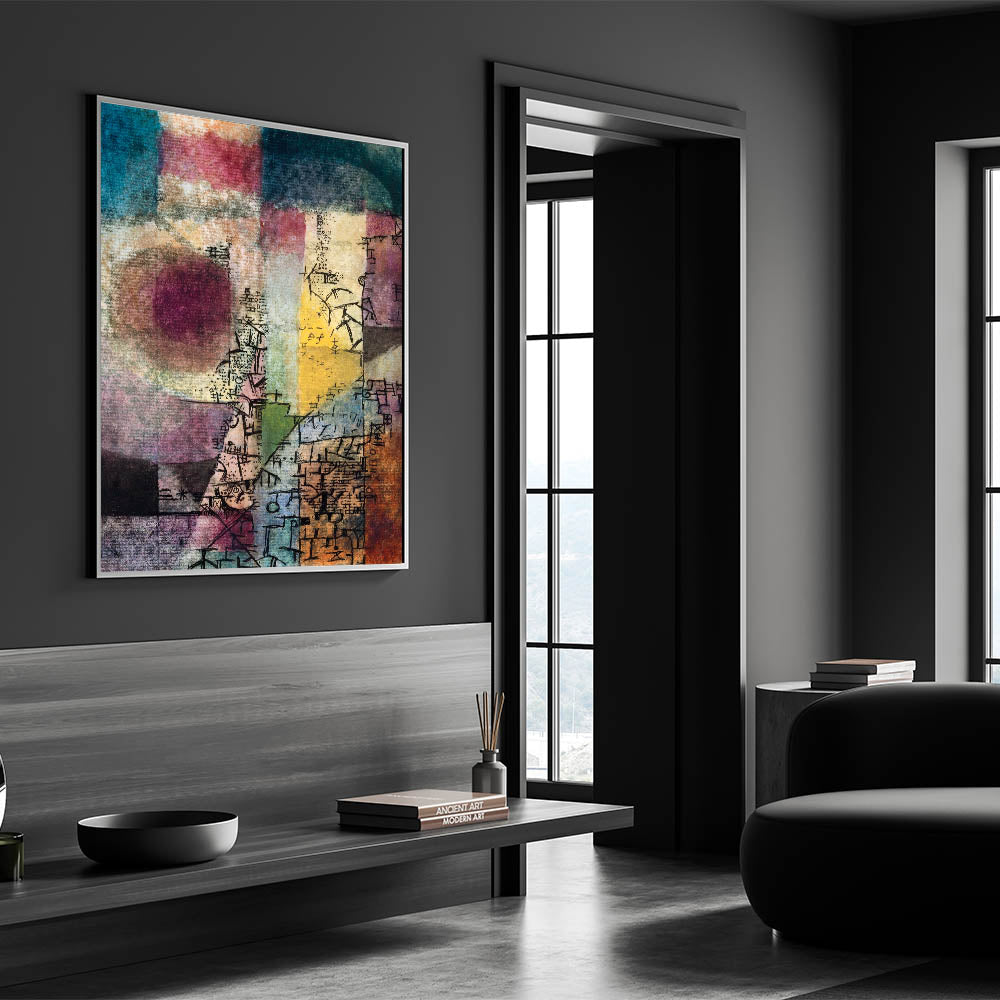 This captivating piece of modern wall art features Paul Klee’s unique abstract style, combining vibrant colors and intricate symbols. Created in 1914, this artwork blends rich tones with complex patterns, inviting viewers to explore its layers of meaning. Klee’s use of geometric forms and mysterious symbols brings a dynamic, thought-provoking quality to any contemporary space, making it perfect for those who appreciate abstract modern decor.