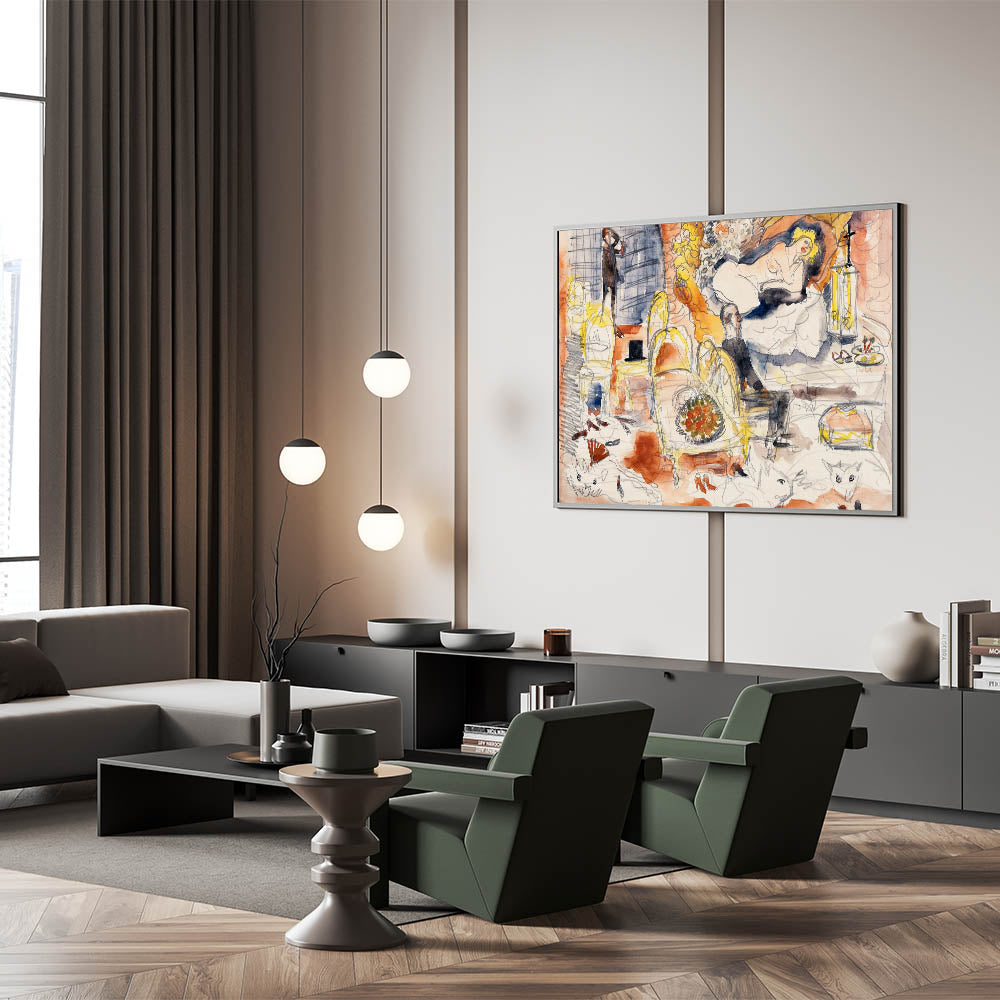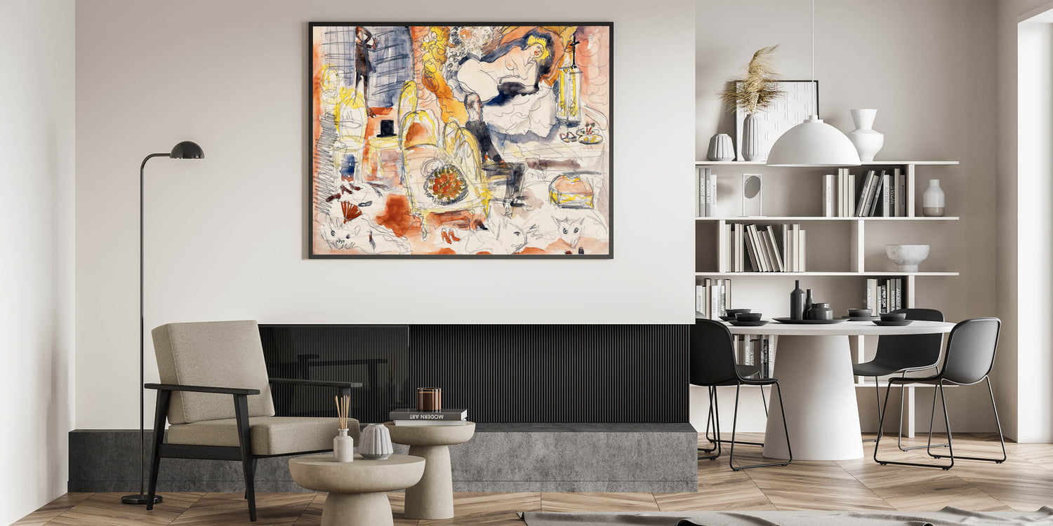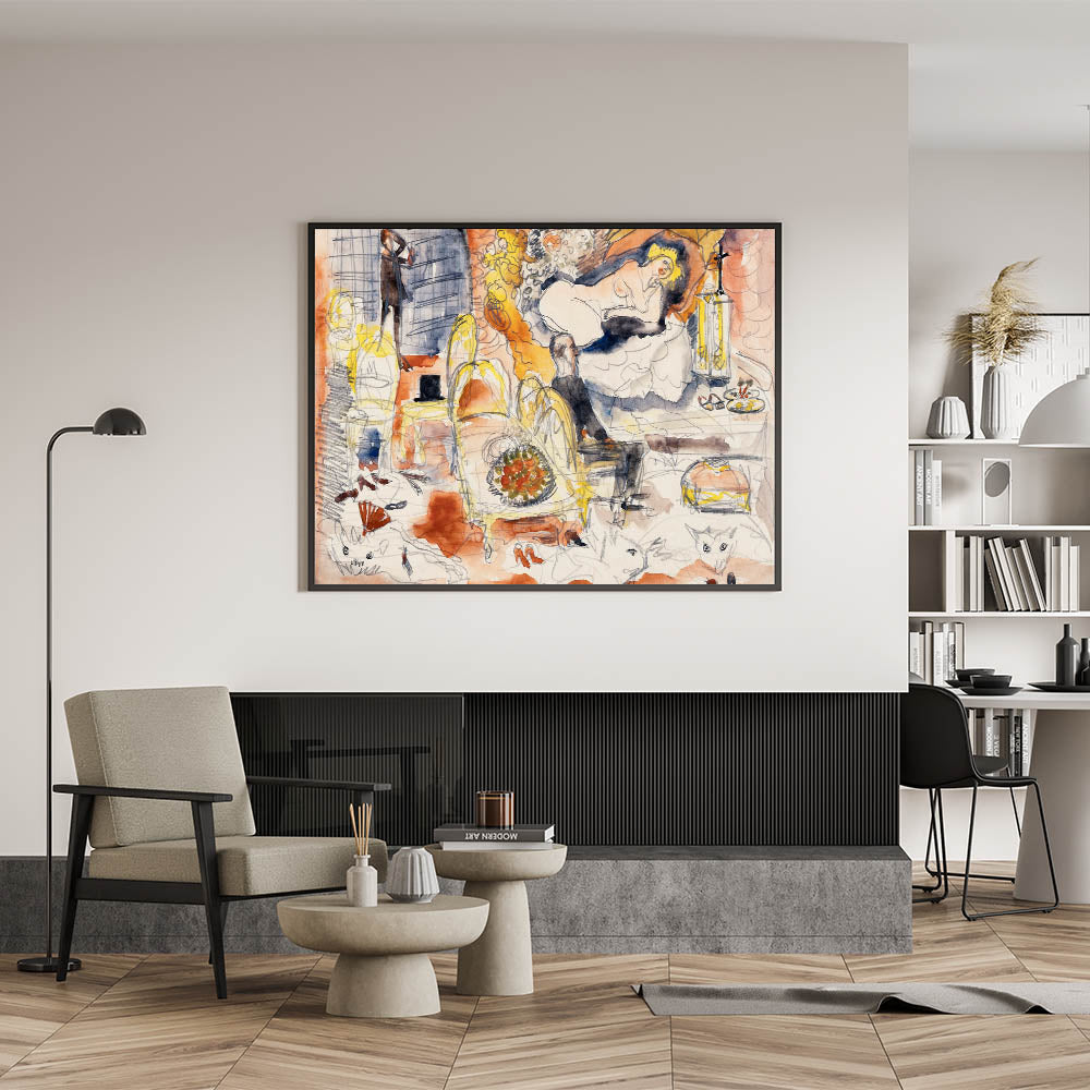Add a whimsical touch to your interior with this lively piece of Modern Wall Art by Charles Demuth. This watercolor composition features an intricate yet playful depiction of a cozy interior scene with figures, vibrant floral arrangements, and expressive lines. Rendered in warm tones of orange, yellow, and soft blues, this artwork effortlessly captures a sense of life and movement, making it a delightful addition to any space.