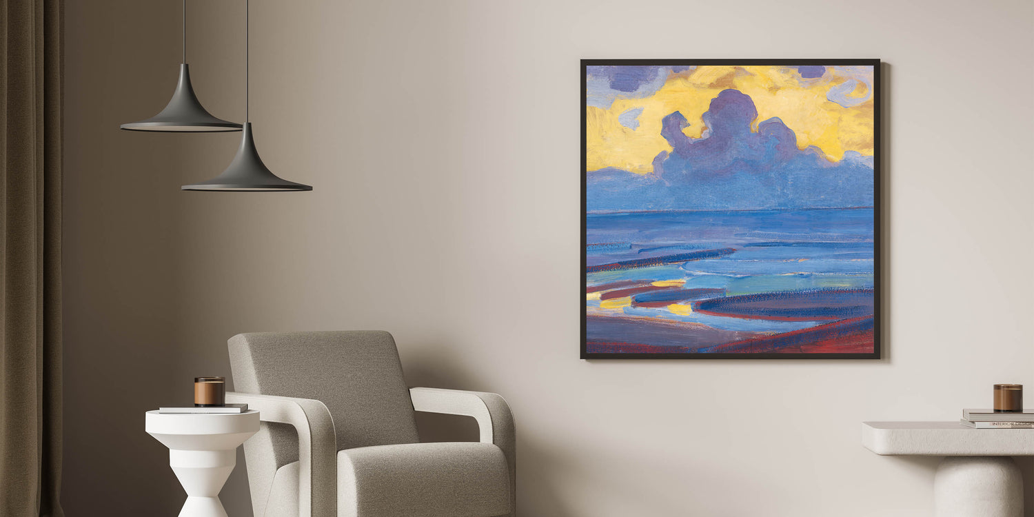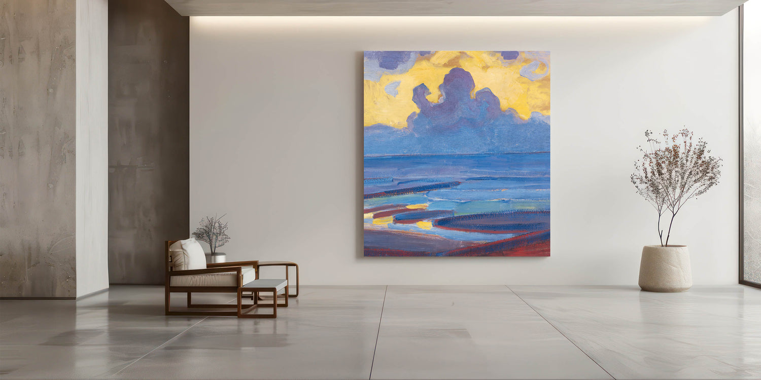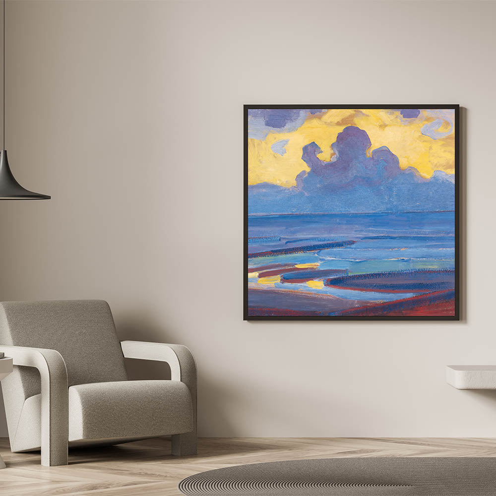 Capture the tranquility of the coast with this Modern Wall Art, showcasing Piet Mondrian's serene seascape By the Sea. Rendered in vibrant blues, warm yellows, and soft lavender, this artwork portrays the gentle interplay of sky and sea. Perfect for lovers of Contemporary Art, it evokes a sense of calm and harmony, making it an ideal addition to modern interiors.