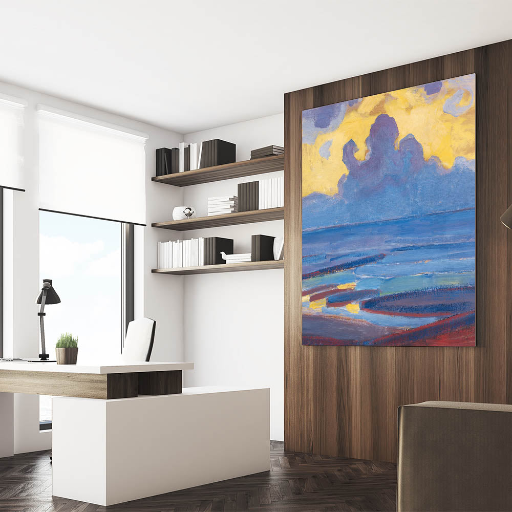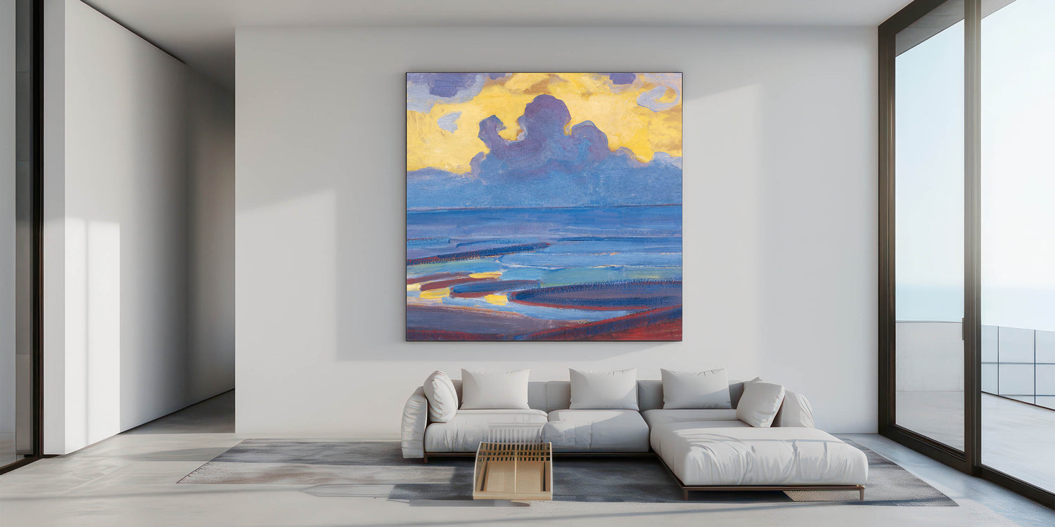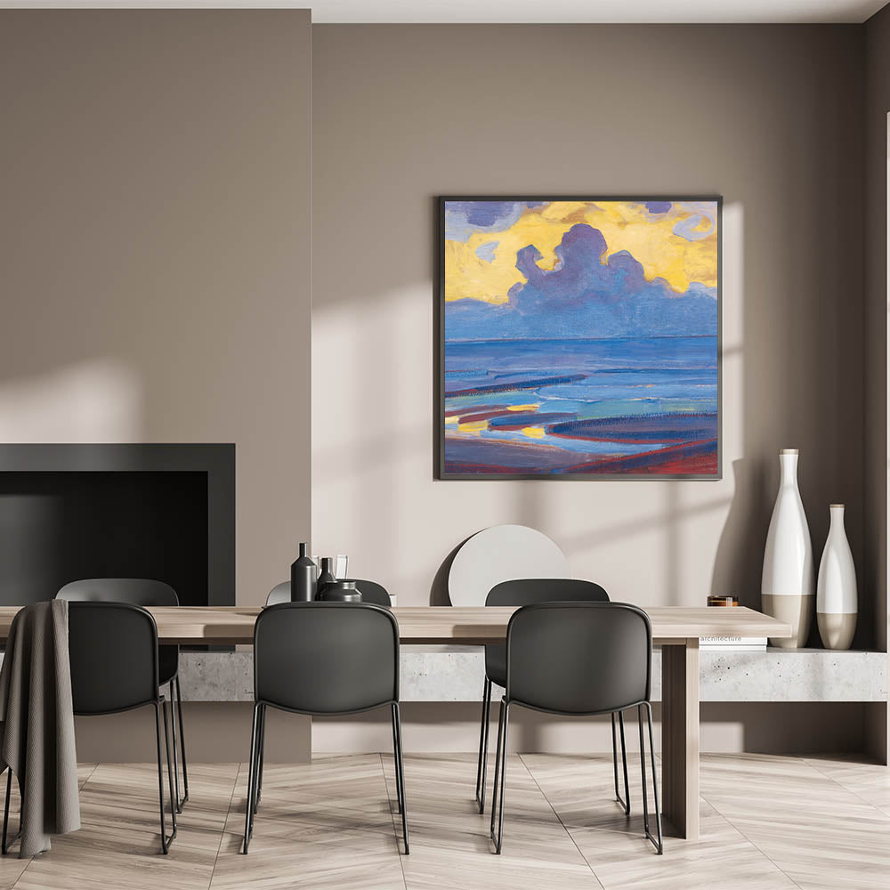 Capture the tranquility of the coast with this Modern Wall Art, showcasing Piet Mondrian's serene seascape By the Sea. Rendered in vibrant blues, warm yellows, and soft lavender, this artwork portrays the gentle interplay of sky and sea. Perfect for lovers of Contemporary Art, it evokes a sense of calm and harmony, making it an ideal addition to modern interiors.