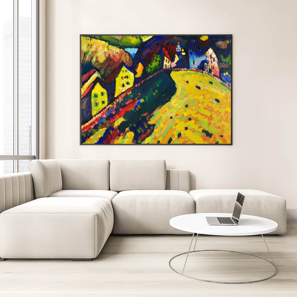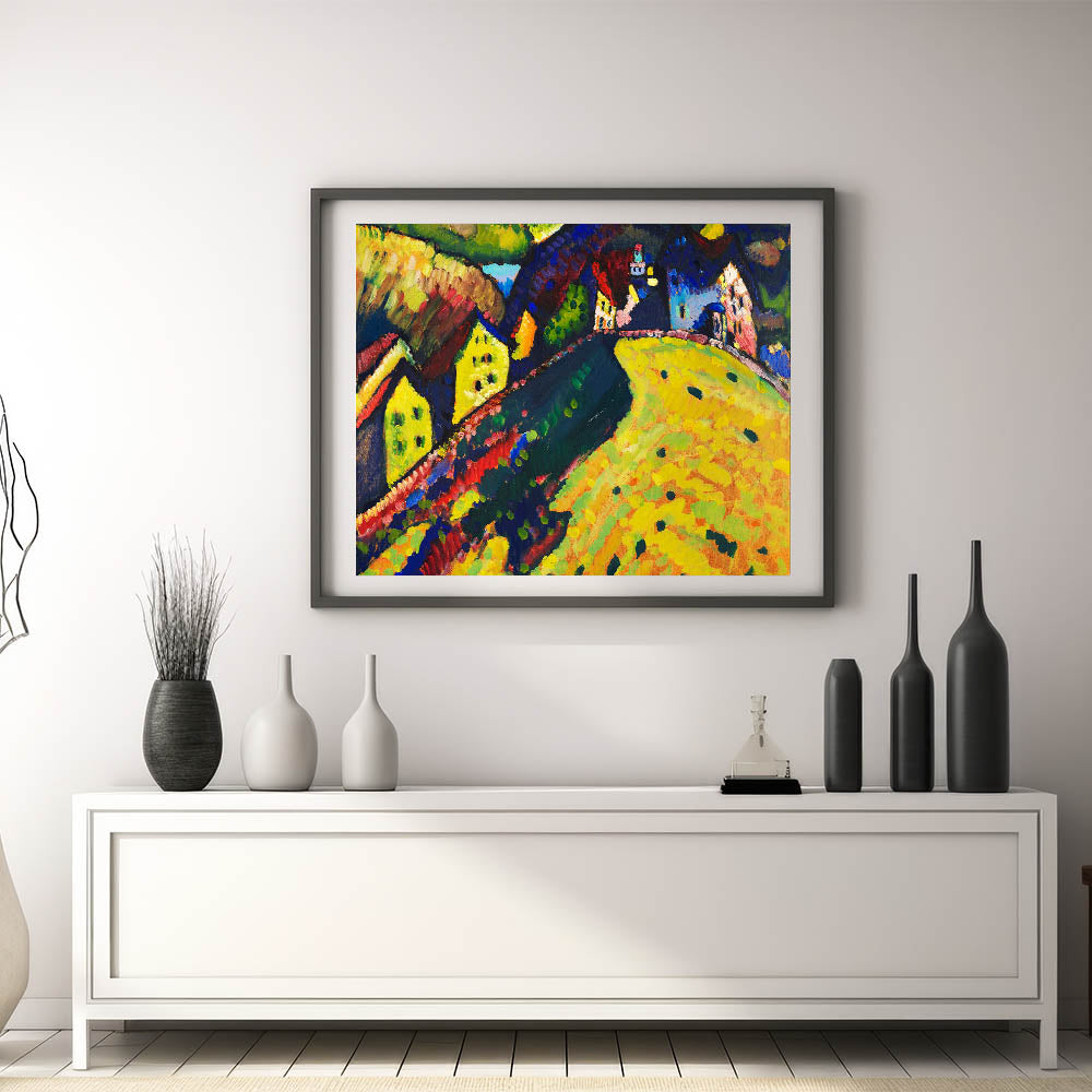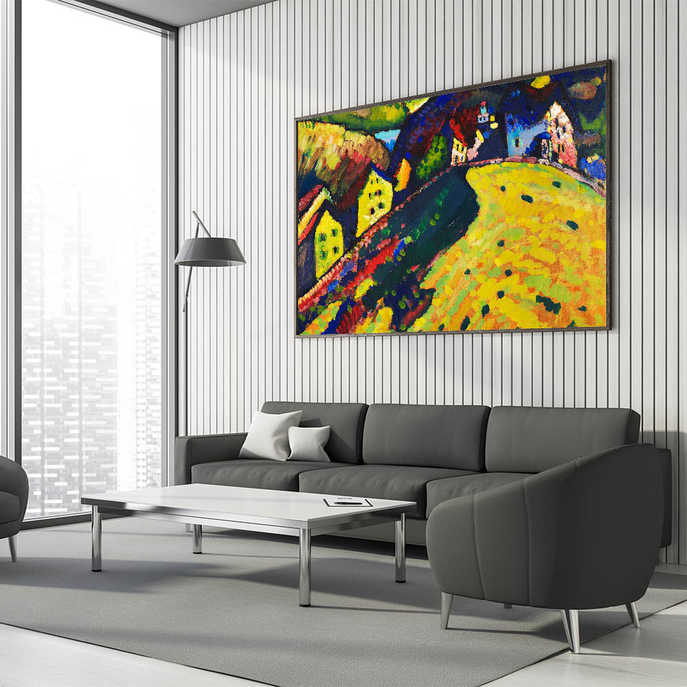 Transform your space with the vibrant energy of Wassily Kandinsky's Houses at Murnau (1909), a masterpiece of modern wall art. This striking composition features bold brushstrokes and a vivid palette of yellow, green, red, and blue, capturing the essence of a lively village nestled in rolling hills. The dynamic forms and expressive colors embody Kandinsky’s pioneering approach to abstract art, making this piece perfect for lovers of contemporary art.