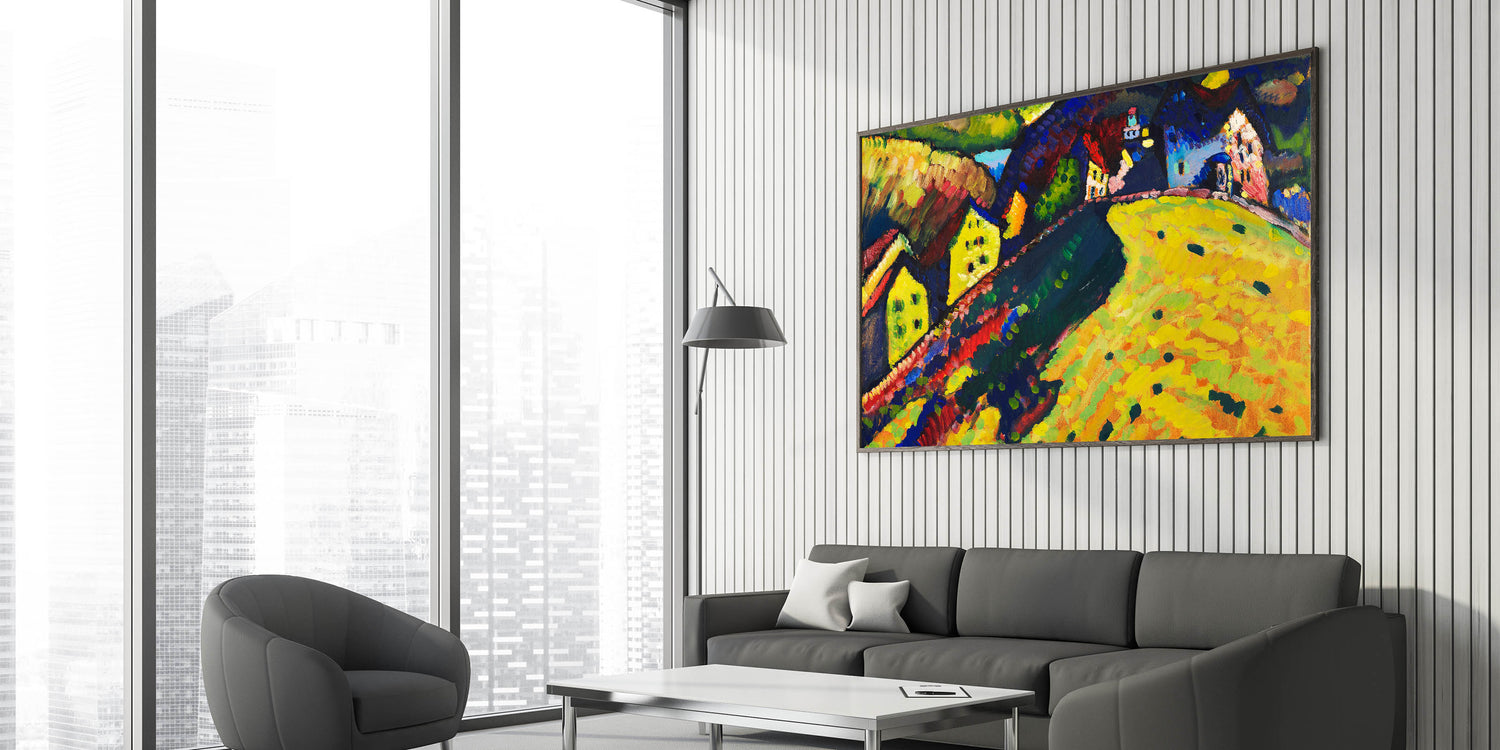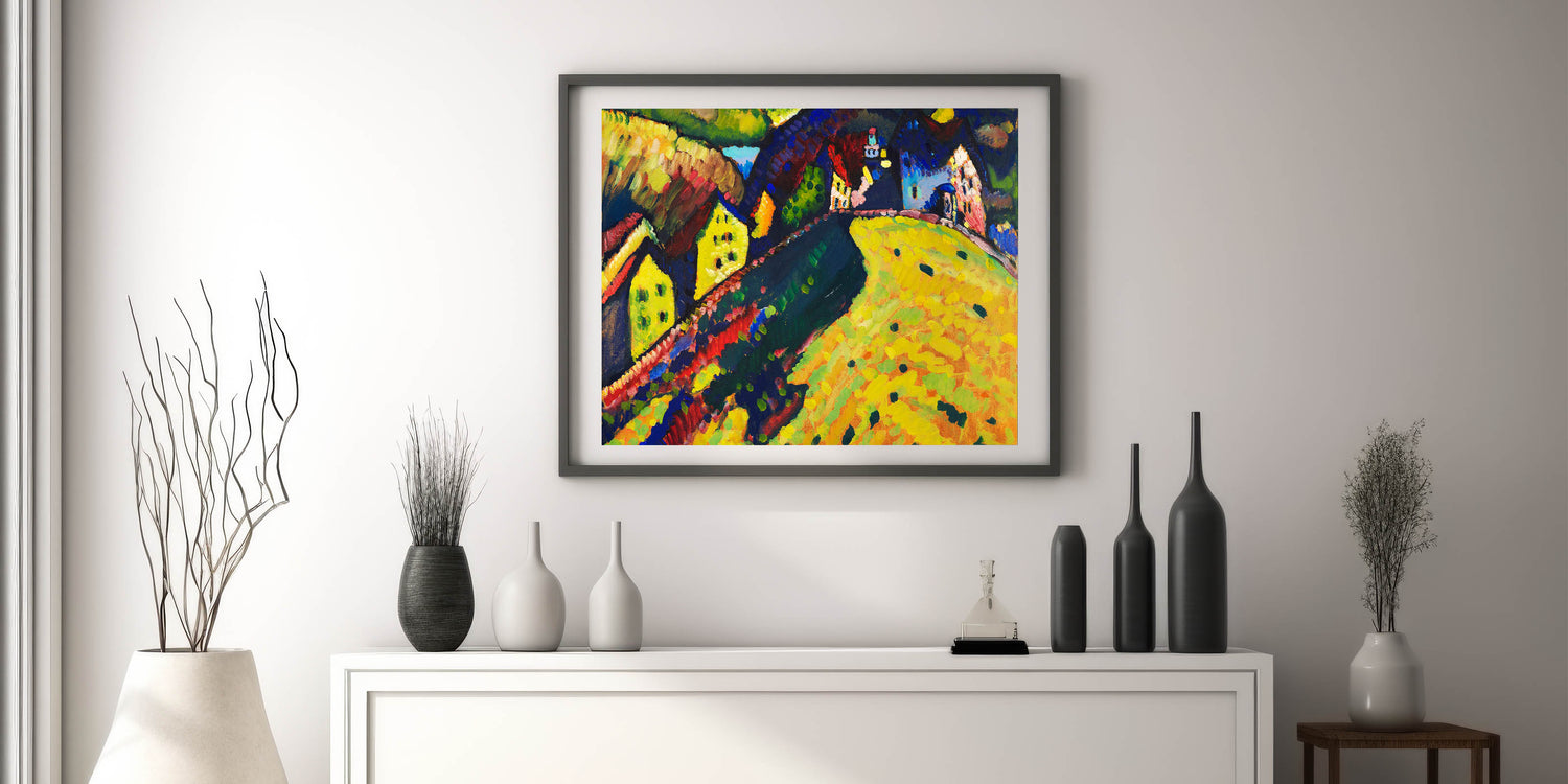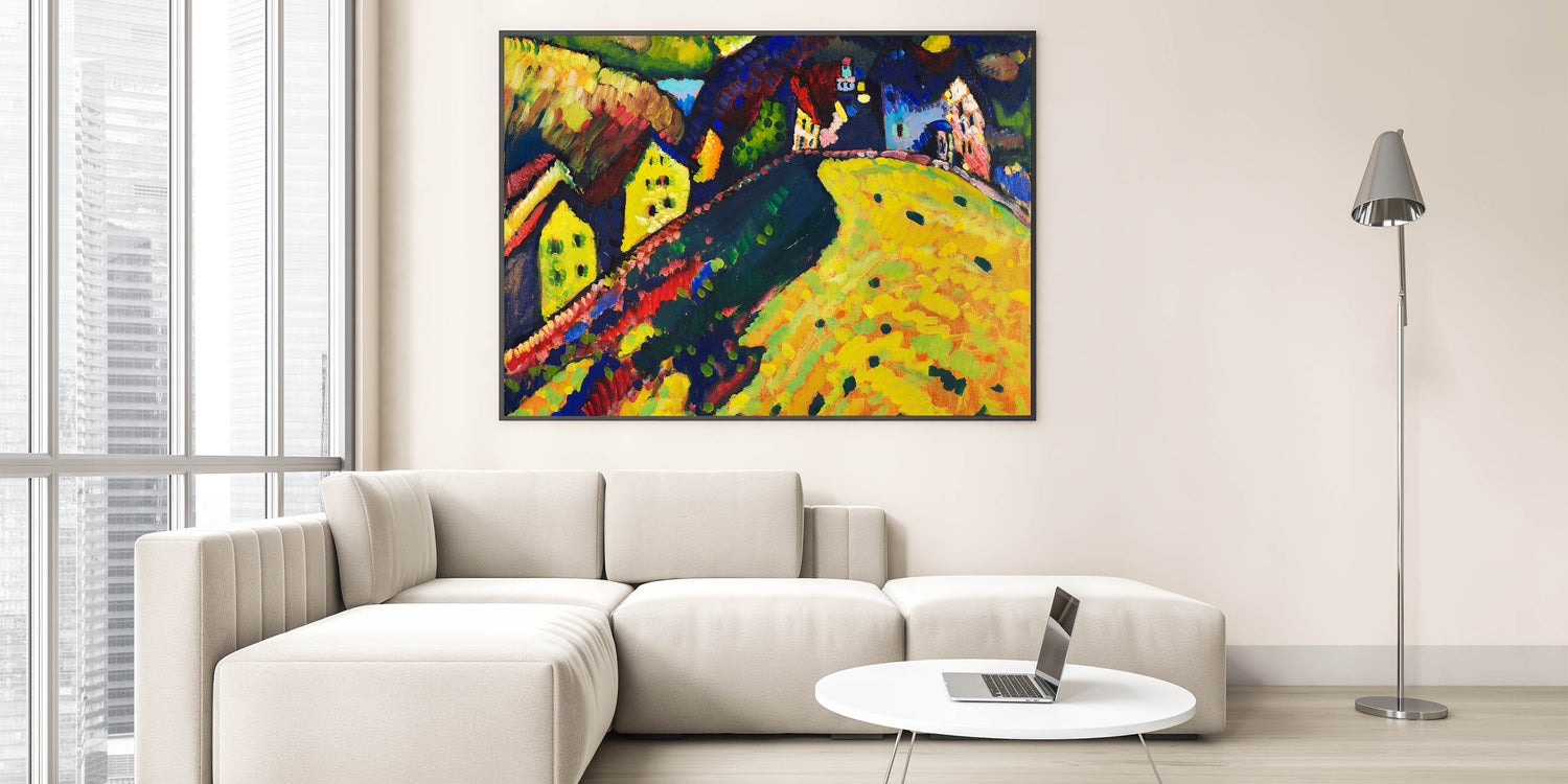 Transform your space with the vibrant energy of Wassily Kandinsky's Houses at Murnau (1909), a masterpiece of modern wall art. This striking composition features bold brushstrokes and a vivid palette of yellow, green, red, and blue, capturing the essence of a lively village nestled in rolling hills. The dynamic forms and expressive colors embody Kandinsky’s pioneering approach to abstract art, making this piece perfect for lovers of contemporary art.