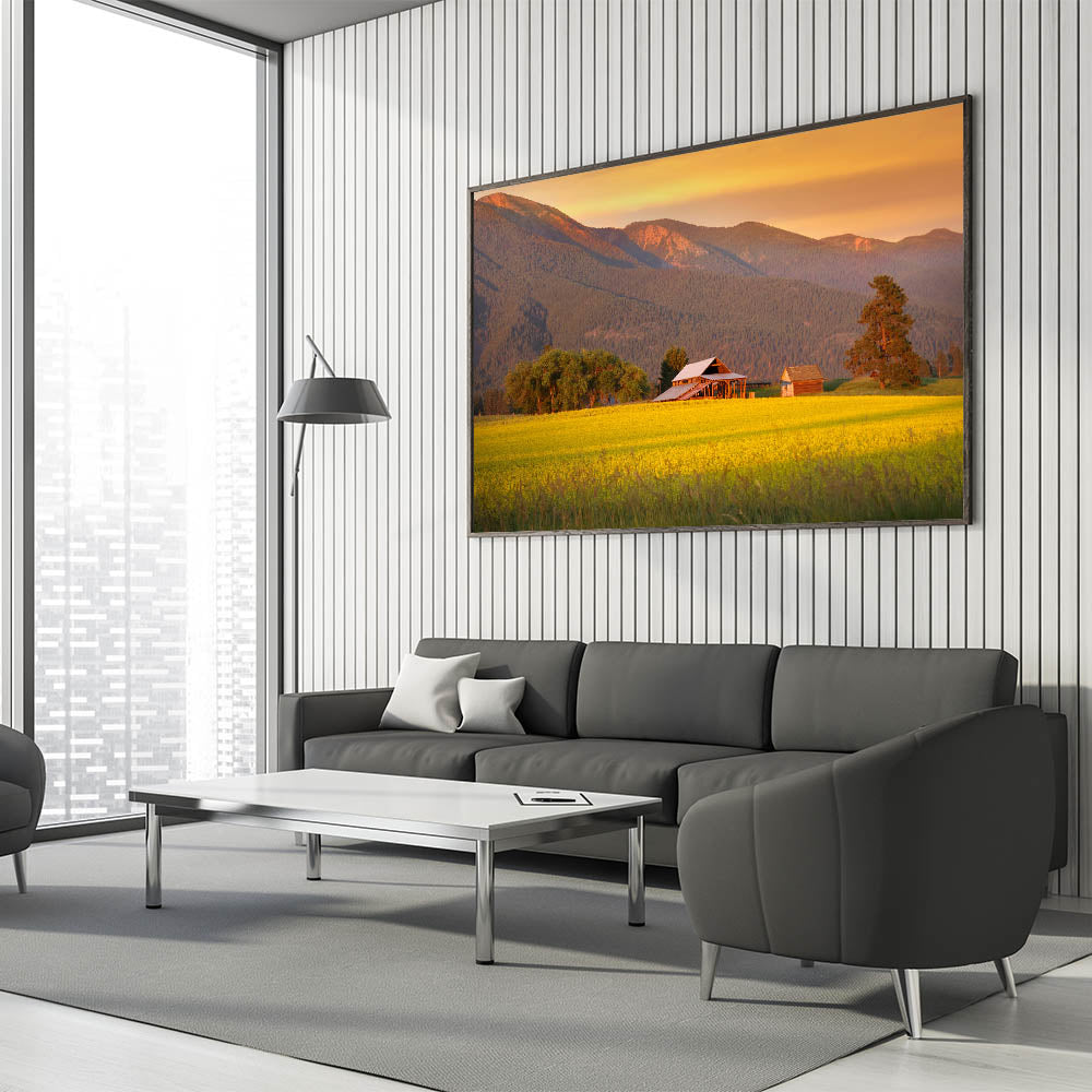 Capture the essence of Montana’s natural beauty with this stunning Montana wall art featuring rustic barns against a backdrop of golden fields and towering mountains. This scene perfectly blends the tranquility of rural life with the majesty of Montana’s wilderness. Our high-quality Montana wall art is available in a range of formats, including stretched canvas, framed canvas, acrylic glass, and more, offering you flexibility in choosing the perfect piece for your space. The fine details of this artwork highlight the warmth of the golden fields and the cool tones of the distant mountains.