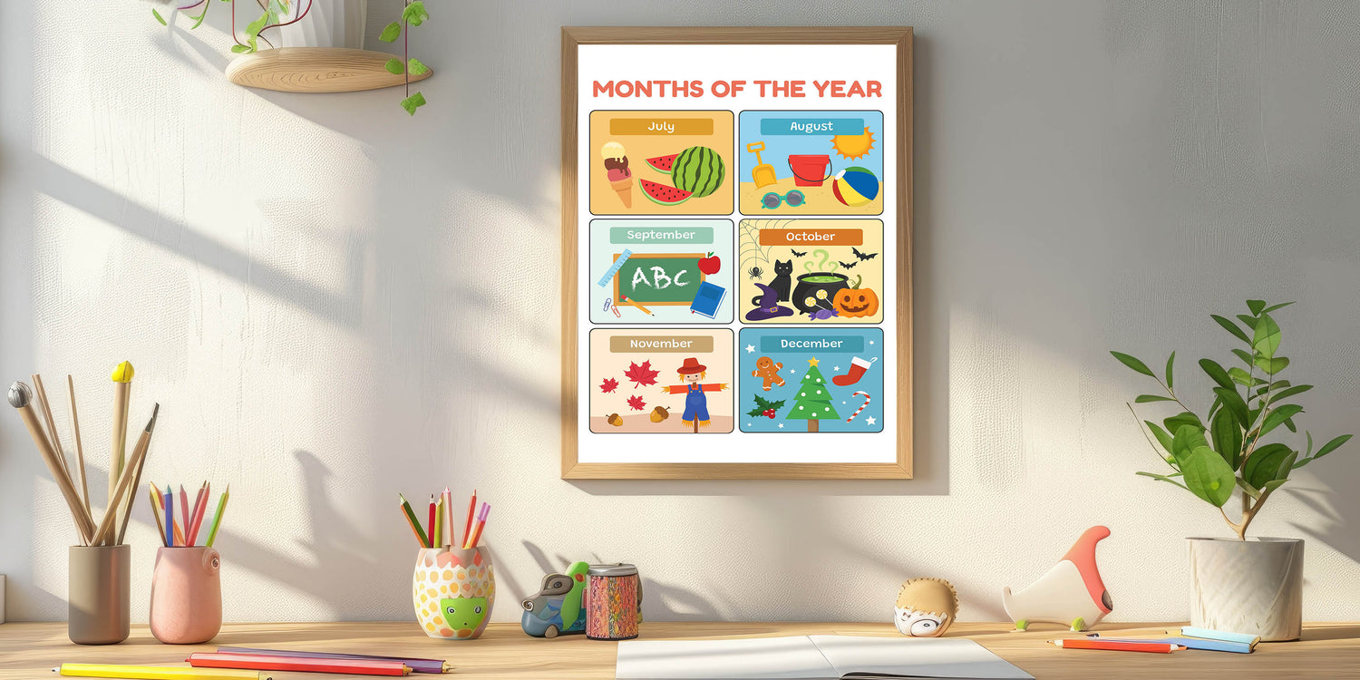 Make learning fun with this Months of the Year Learning Wall Art. Featuring bright and playful seasonal illustrations, this Kids Educational Wall Art helps children associate months with different holidays and activities. From beach days in August to Halloween in October and Christmas in December, this Children’s Learning Art Print brings each month to life in a visually engaging way.
