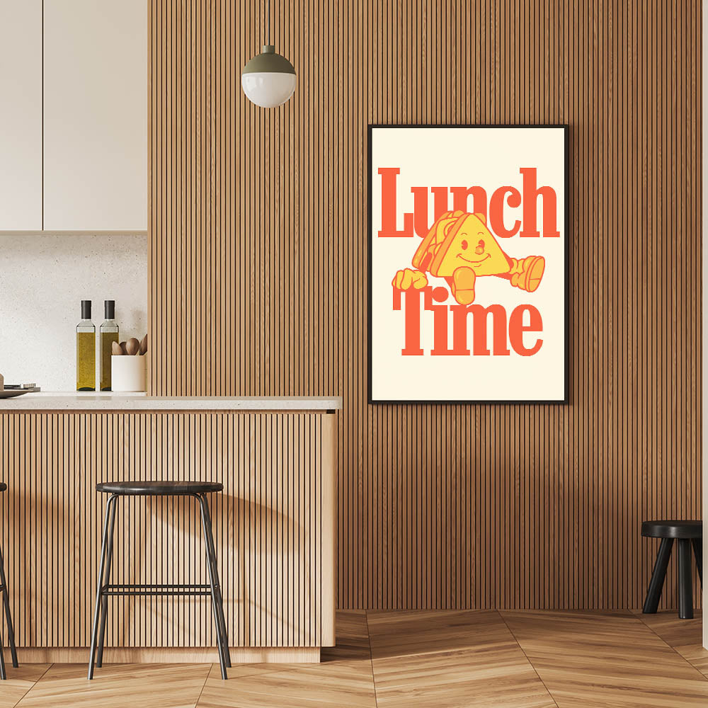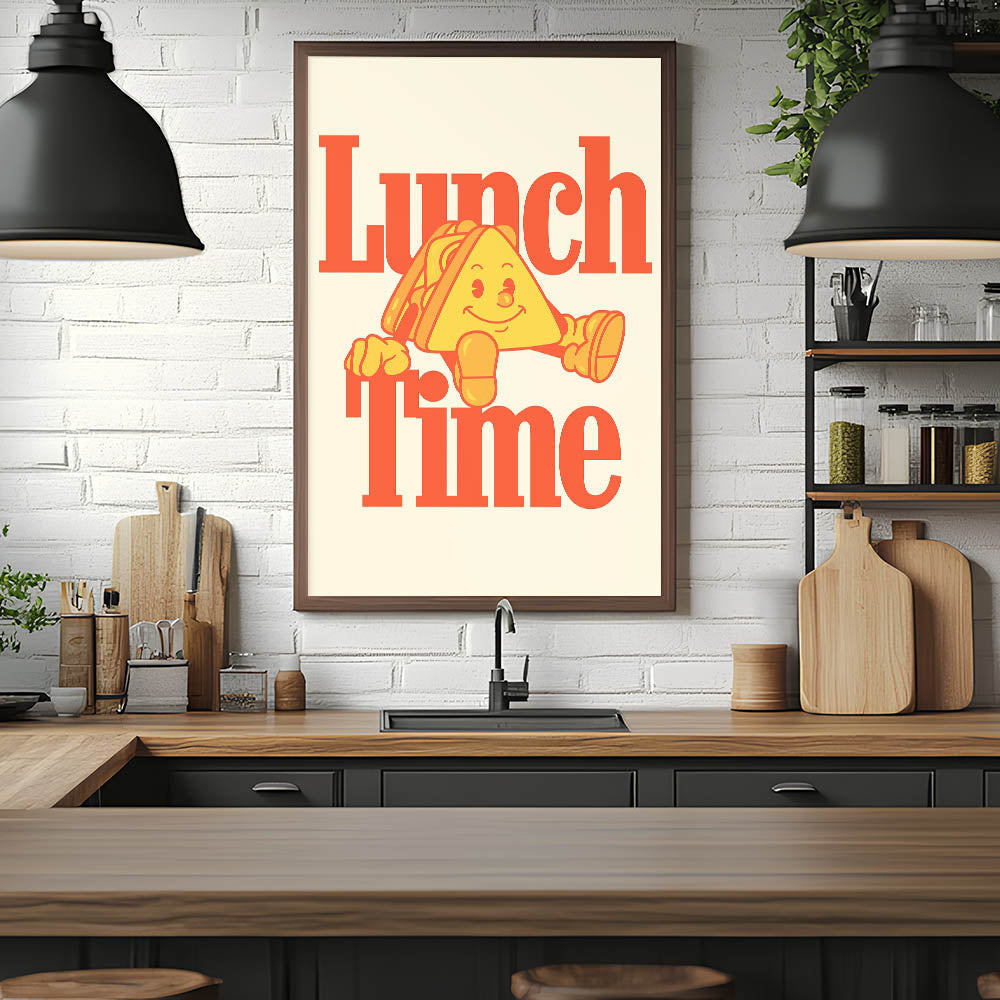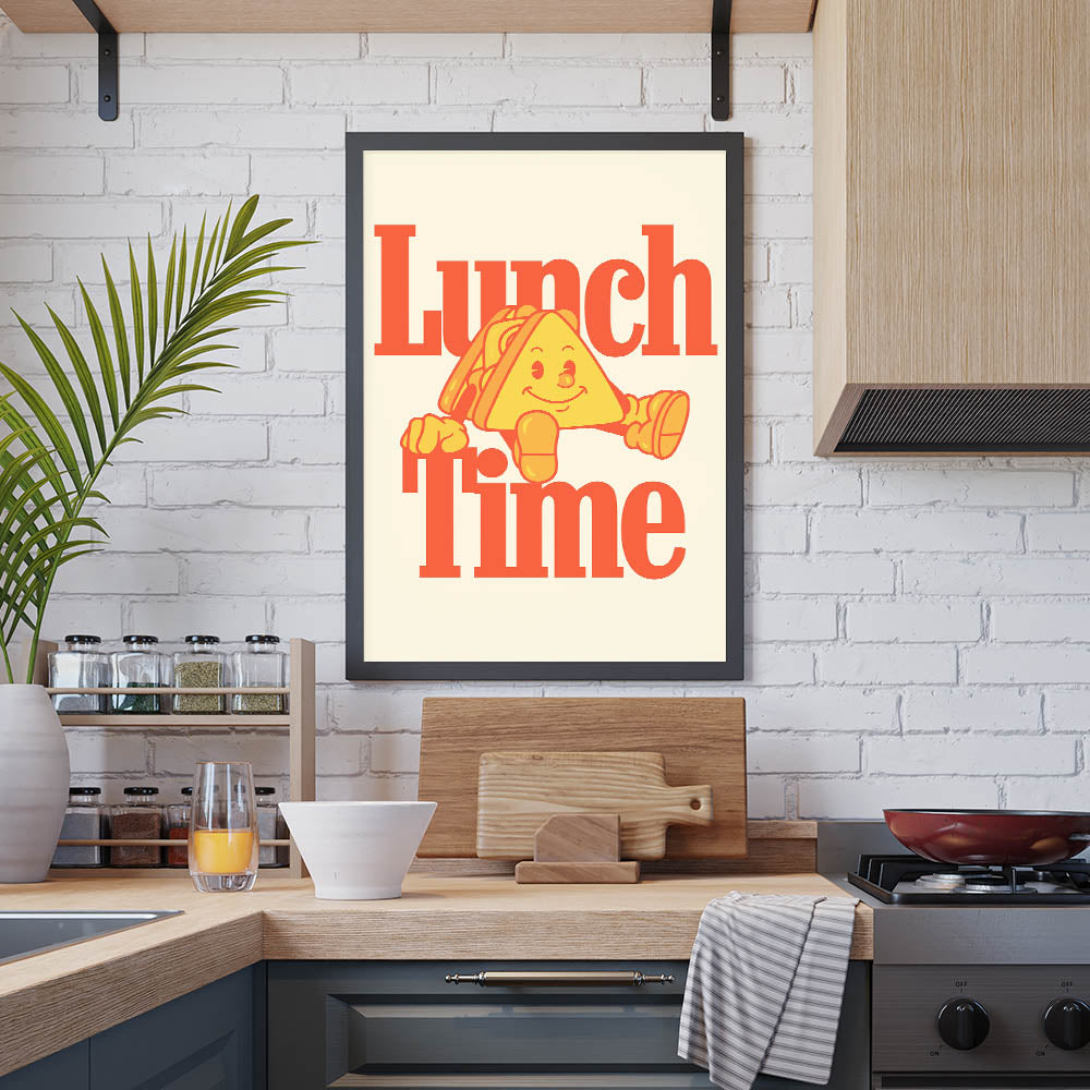 Brighten up your kitchen or dining space with this Motivational Kitchen Art Prints design featuring a fun and retro-inspired "Lunch Time" quote. The bold typography and cheerful sandwich character make this Inspirational Kitchen Wall Art a lively addition to any home, café, or restaurant. The warm color palette of oranges and yellows creates an inviting and nostalgic feel, perfect for those who love food and positive vibes.