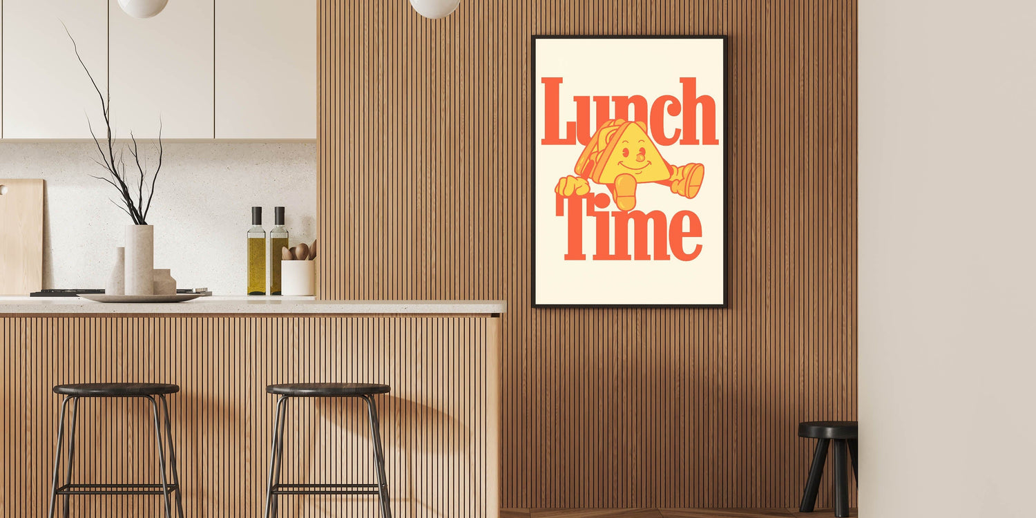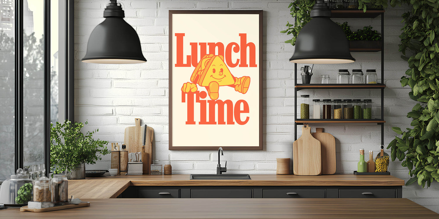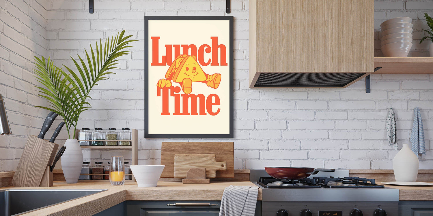 Brighten up your kitchen or dining space with this Motivational Kitchen Art Prints design featuring a fun and retro-inspired "Lunch Time" quote. The bold typography and cheerful sandwich character make this Inspirational Kitchen Wall Art a lively addition to any home, café, or restaurant. The warm color palette of oranges and yellows creates an inviting and nostalgic feel, perfect for those who love food and positive vibes.