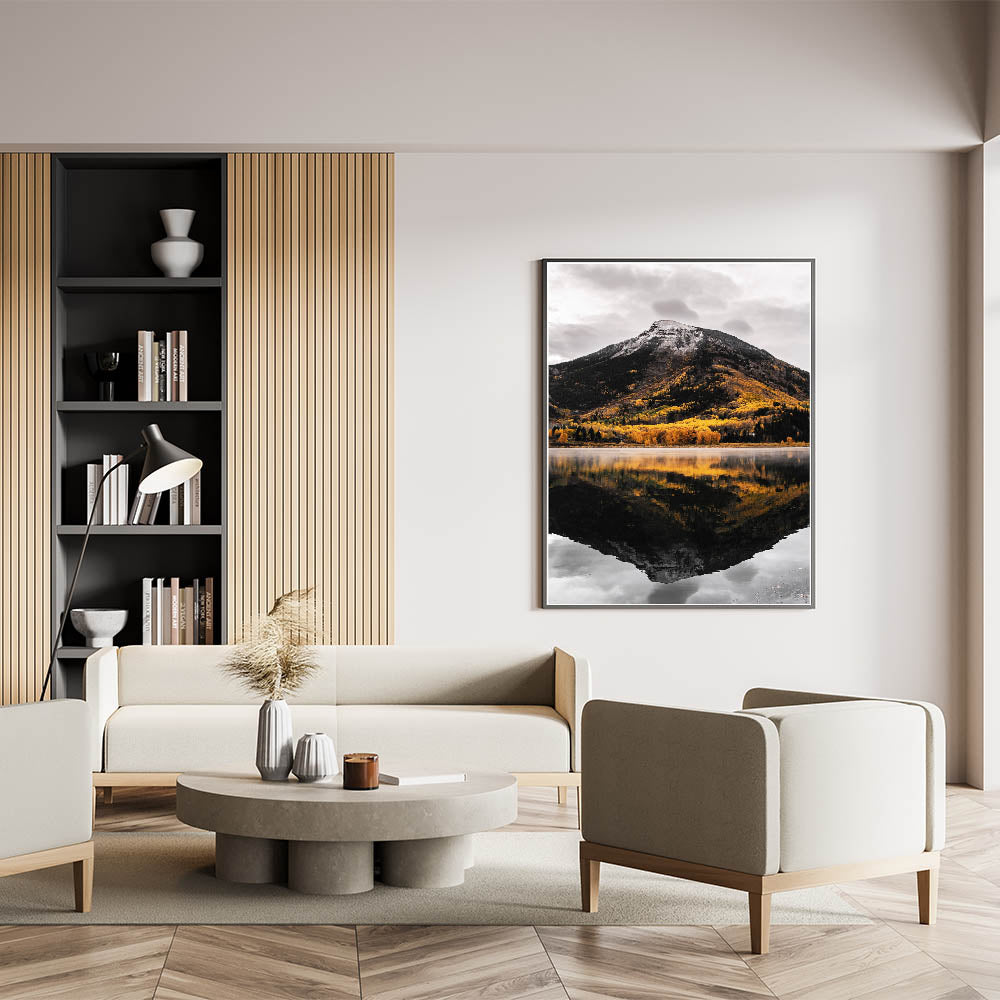 Mountain Reflection" offers a mesmerizing view of a majestic mountain mirrored in the calm waters of a lake, surrounded by the vibrant colors of autumn. This stunning piece captures the essence of tranquility and the breathtaking beauty of nature in fall, making it a perfect addition to any rustic or nature-inspired decor.