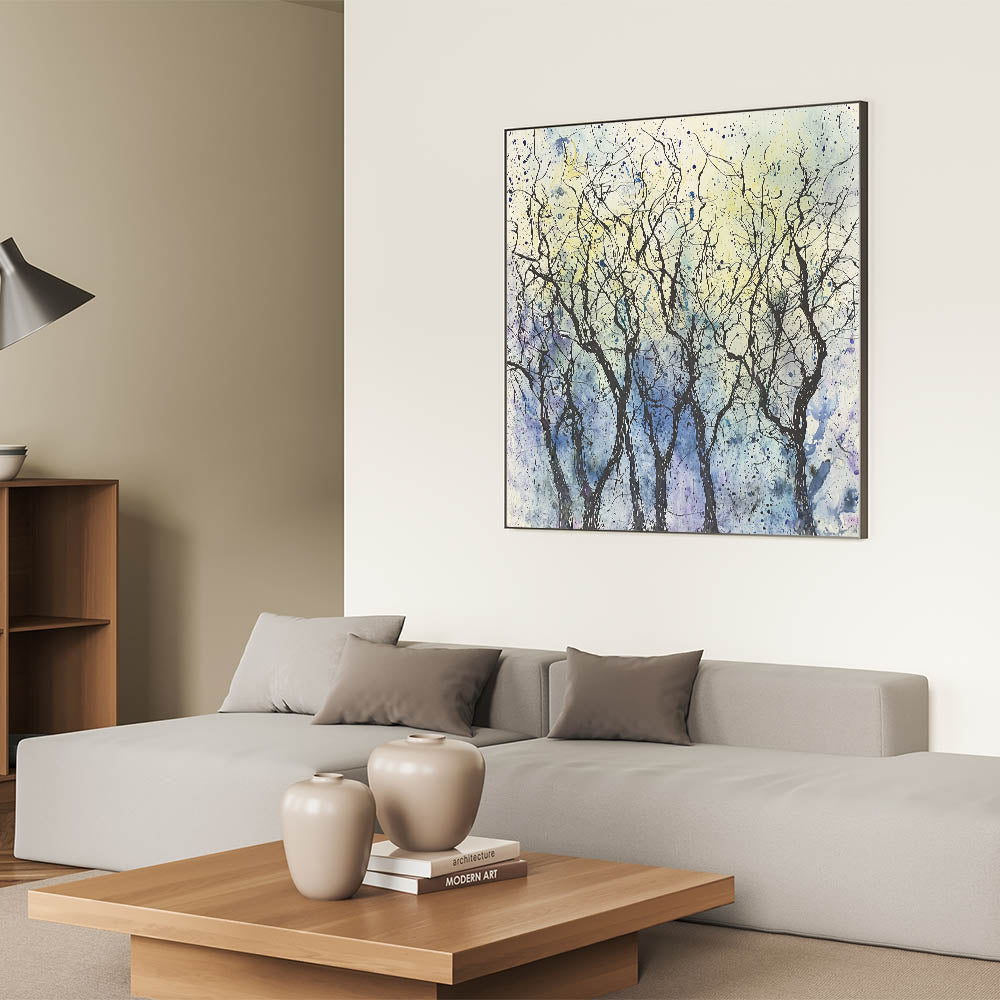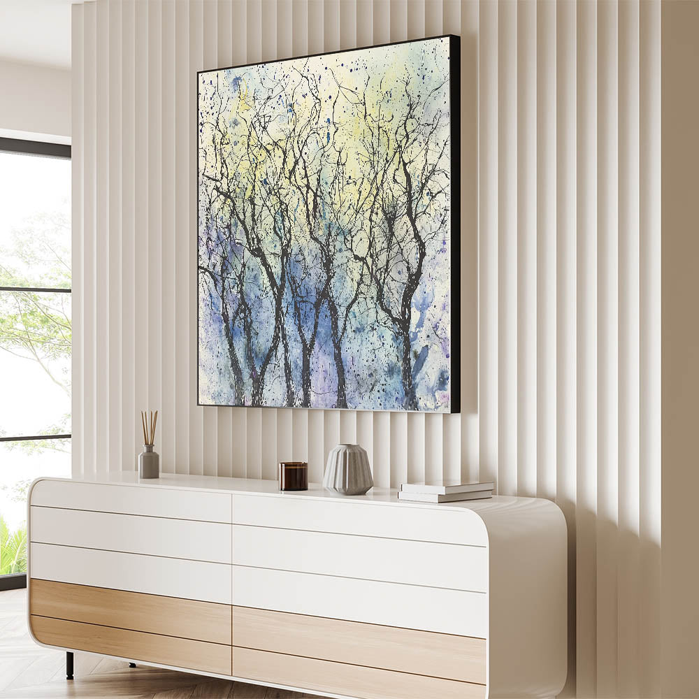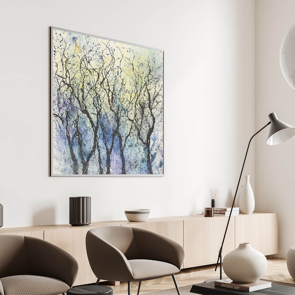 Immerse yourself in the serene beauty of this abstract floral artwork, featuring an enchanting depiction of bare trees against a dreamy background. The delicate black branches stretch gracefully across a misty palette of soft blues, yellows, and subtle splashes of white, evoking a sense of calm and wonder. Perfect for contemporary or minimalist interiors, this piece is a stunning blend of artistry and nature.