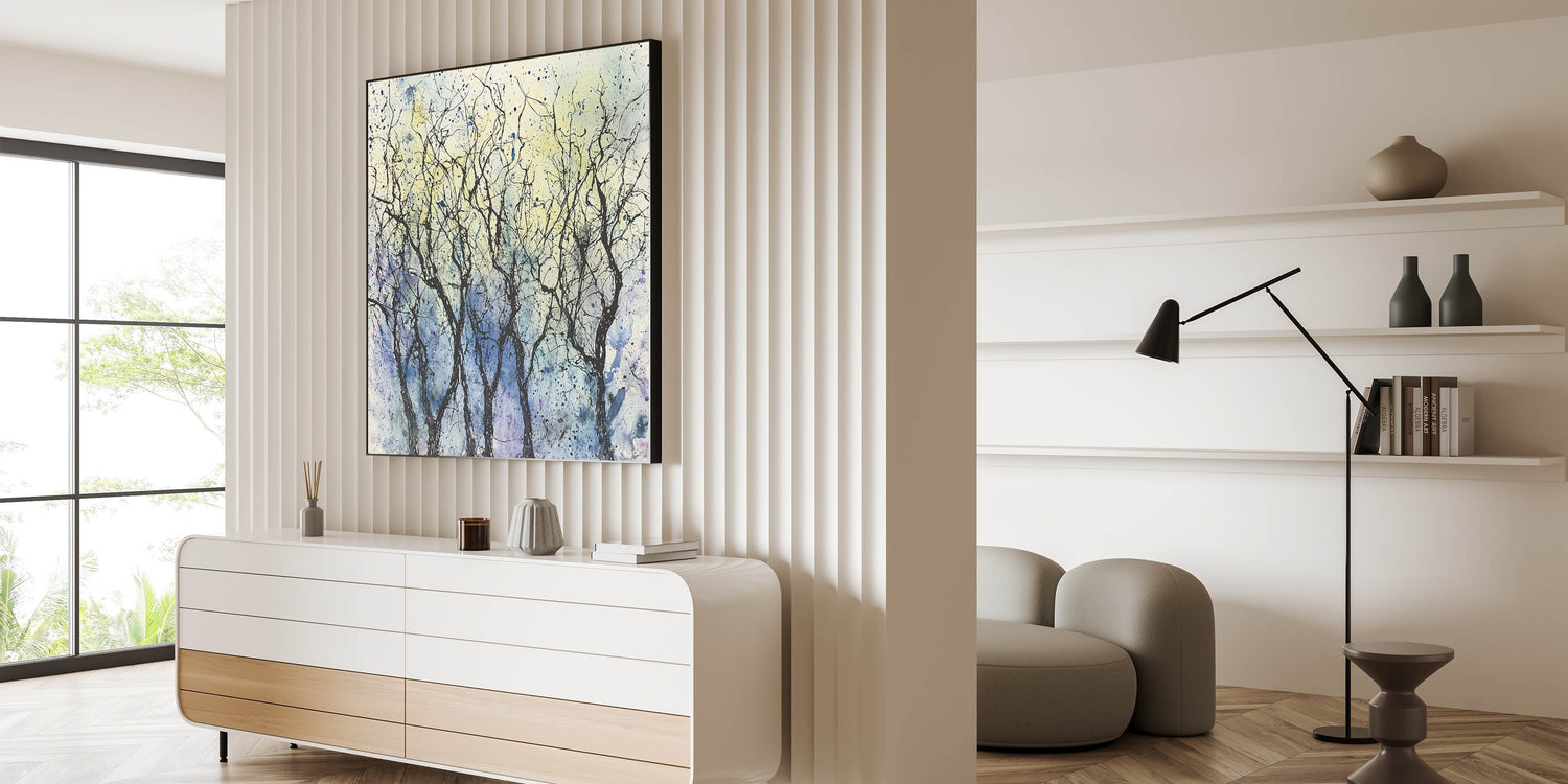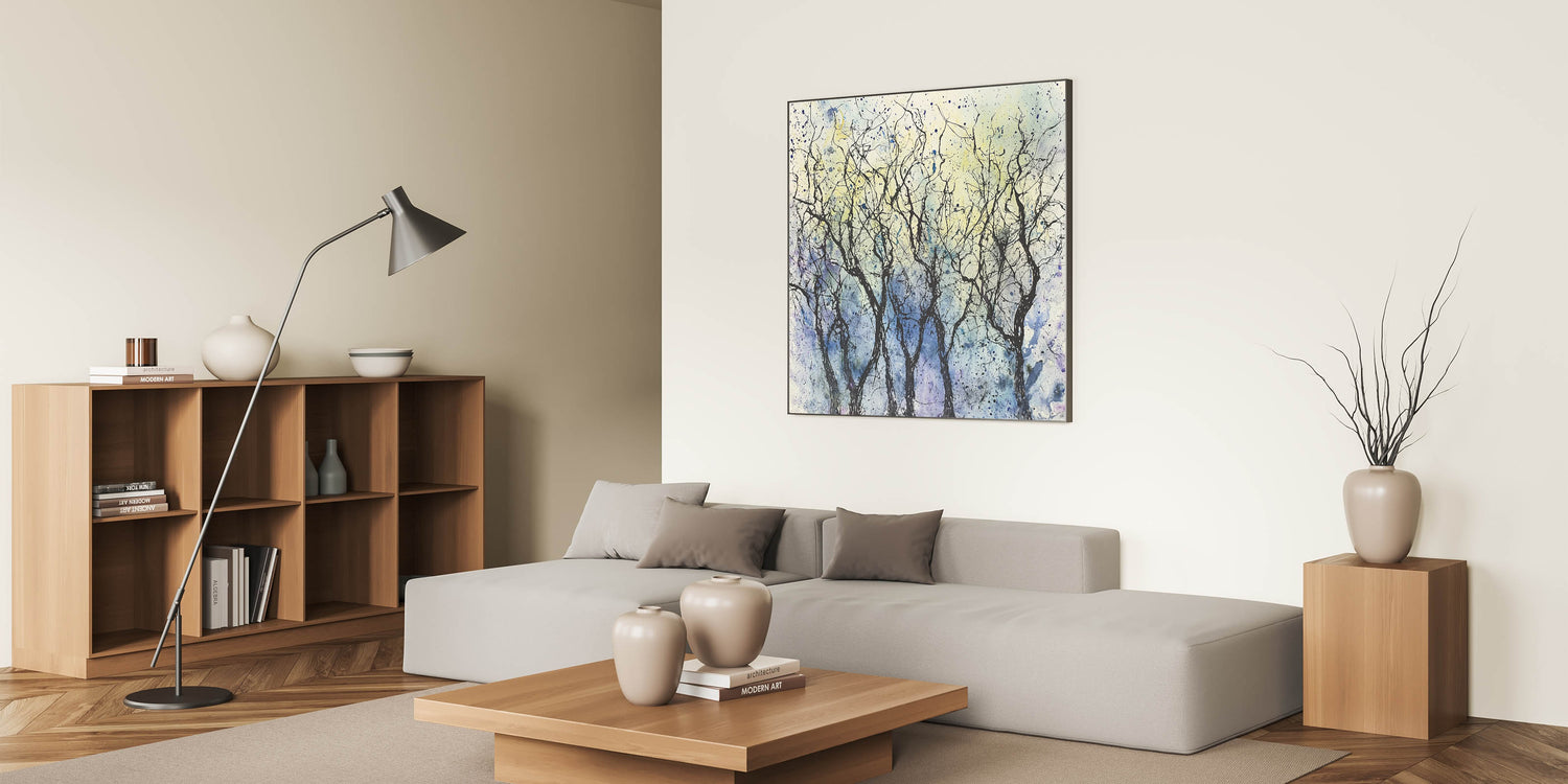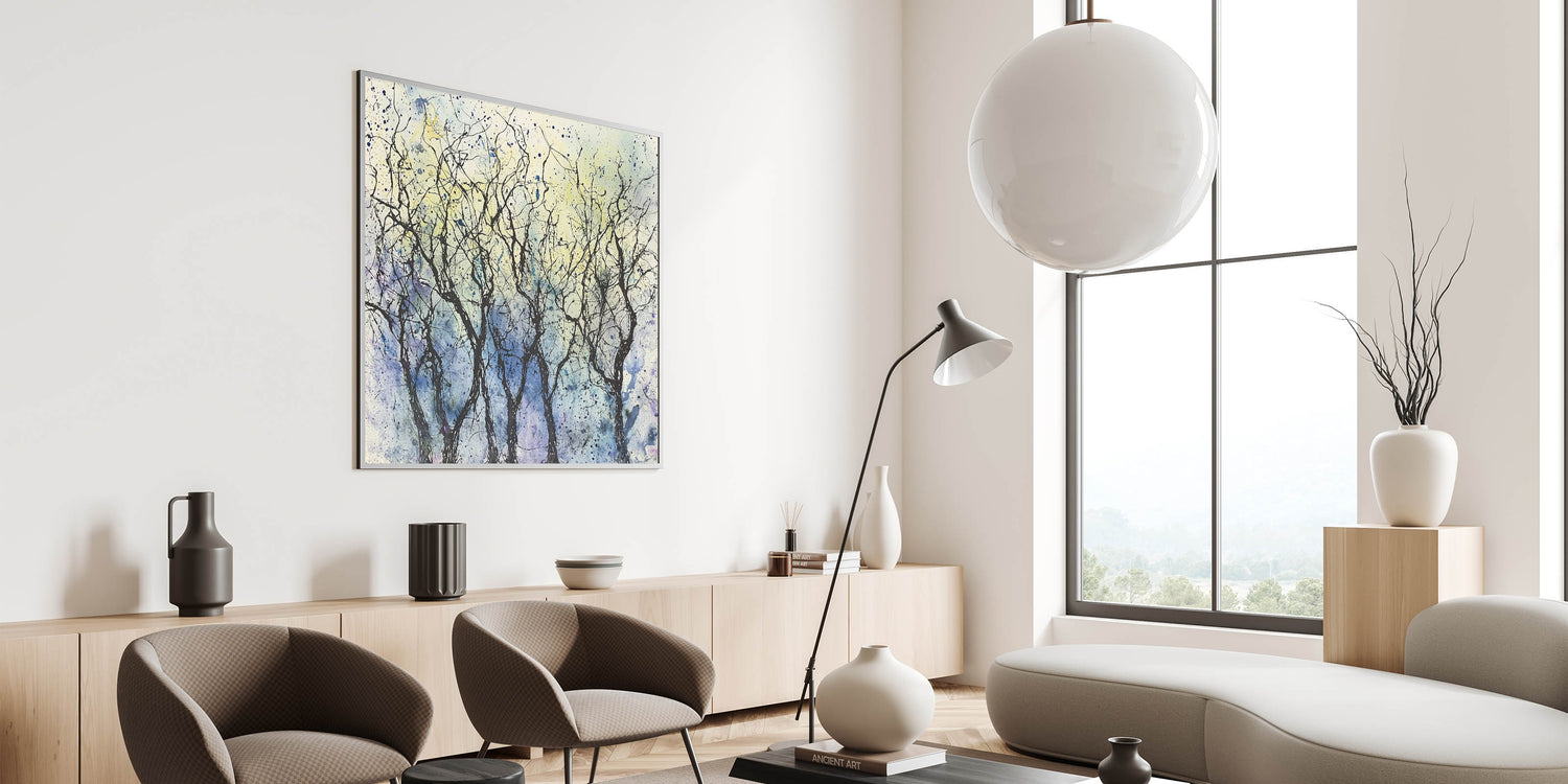 Immerse yourself in the serene beauty of this abstract floral artwork, featuring an enchanting depiction of bare trees against a dreamy background. The delicate black branches stretch gracefully across a misty palette of soft blues, yellows, and subtle splashes of white, evoking a sense of calm and wonder. Perfect for contemporary or minimalist interiors, this piece is a stunning blend of artistry and nature.