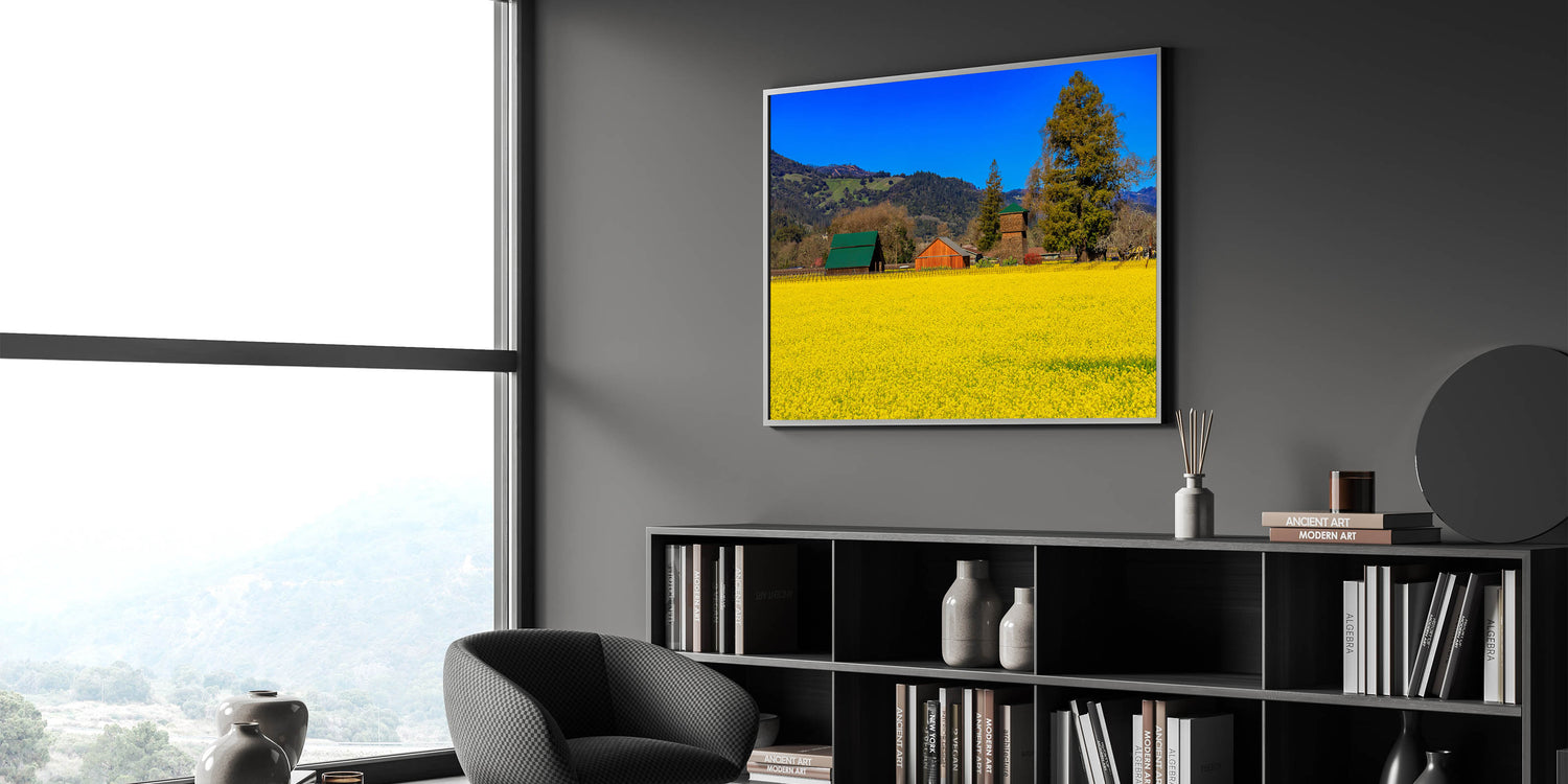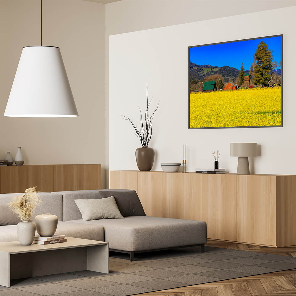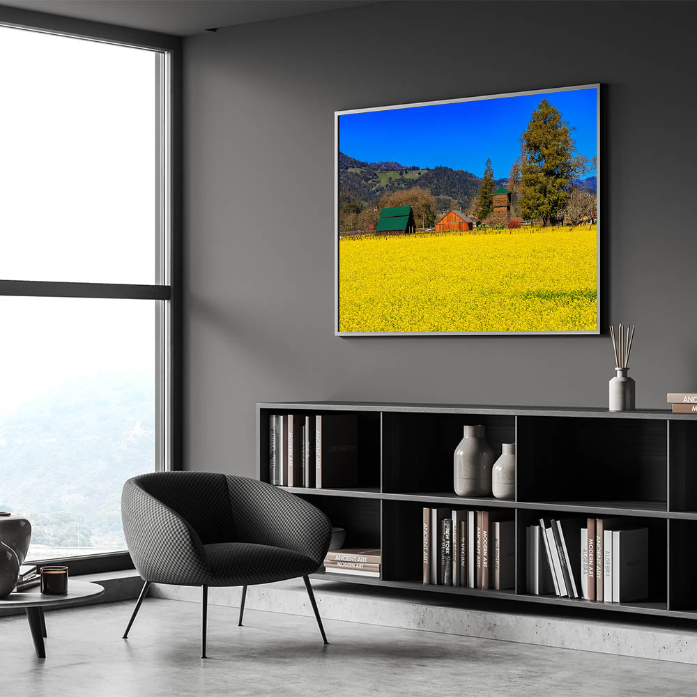 Bring the charm of Napa Valley's countryside into your home with this stunning wall art. This vibrant piece captures the golden yellow fields of Napa Valley set against a backdrop of rustic barns and lush green hills. The deep blue sky contrasts beautifully with the rich colors of the landscape, creating a serene and picturesque scene that embodies the peaceful countryside of California’s premier wine region. Perfect for adding a touch of rural elegance to your space, this artwork celebrates the beauty and simplicity of wine country life.
