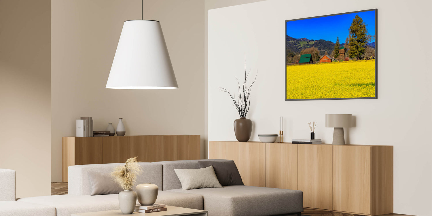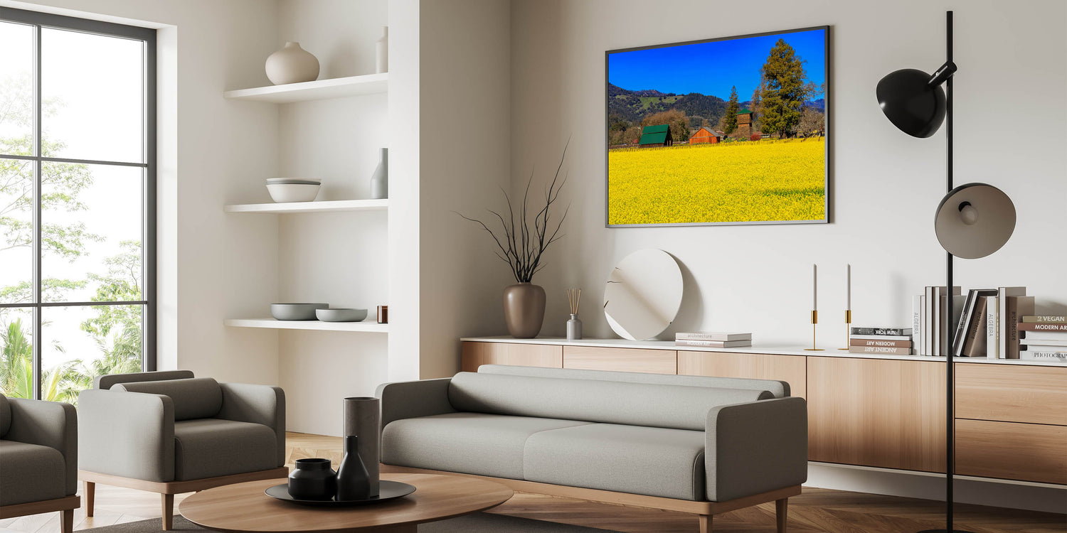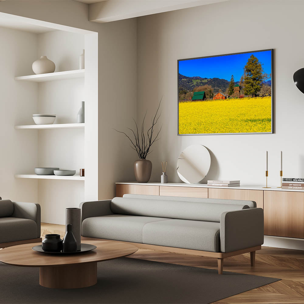 Bring the charm of Napa Valley's countryside into your home with this stunning wall art. This vibrant piece captures the golden yellow fields of Napa Valley set against a backdrop of rustic barns and lush green hills. The deep blue sky contrasts beautifully with the rich colors of the landscape, creating a serene and picturesque scene that embodies the peaceful countryside of California’s premier wine region. Perfect for adding a touch of rural elegance to your space, this artwork celebrates the beauty and simplicity of wine country life.