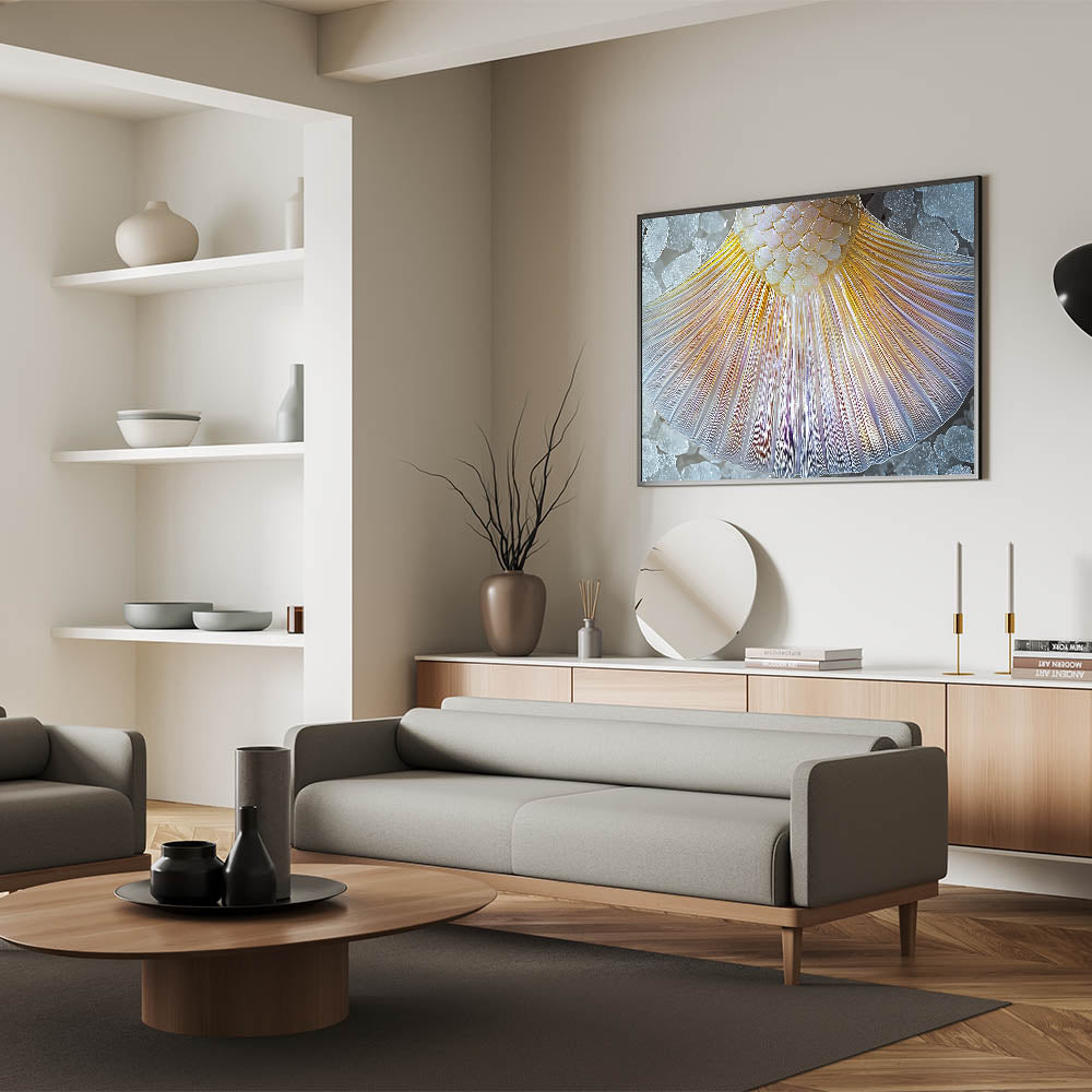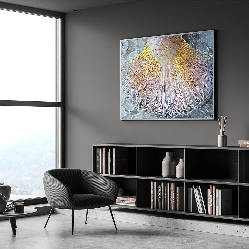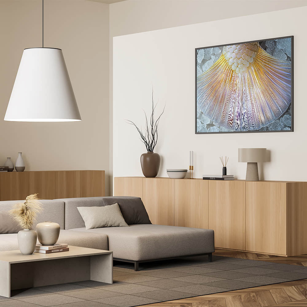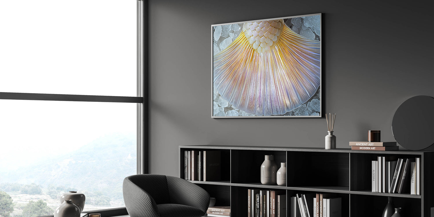 Enhance your space with this captivating close-up of a mermaid tail. This nature-inspired artwork showcases stunning iridescent hues that radiate elegance and charm. The delicate scales and flowing textures create a mesmerizing design, perfect for ocean lovers and modern decor enthusiasts alike.