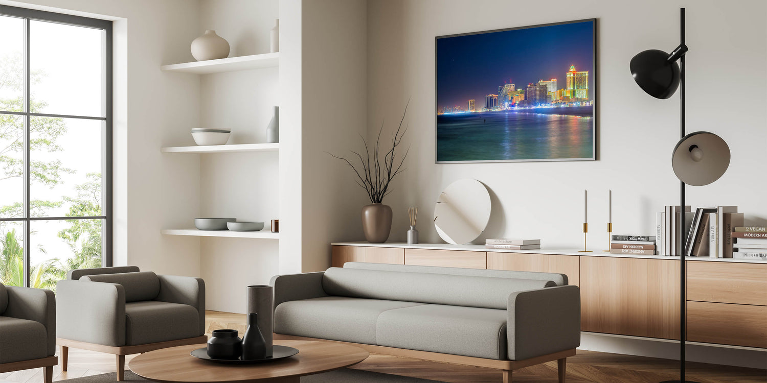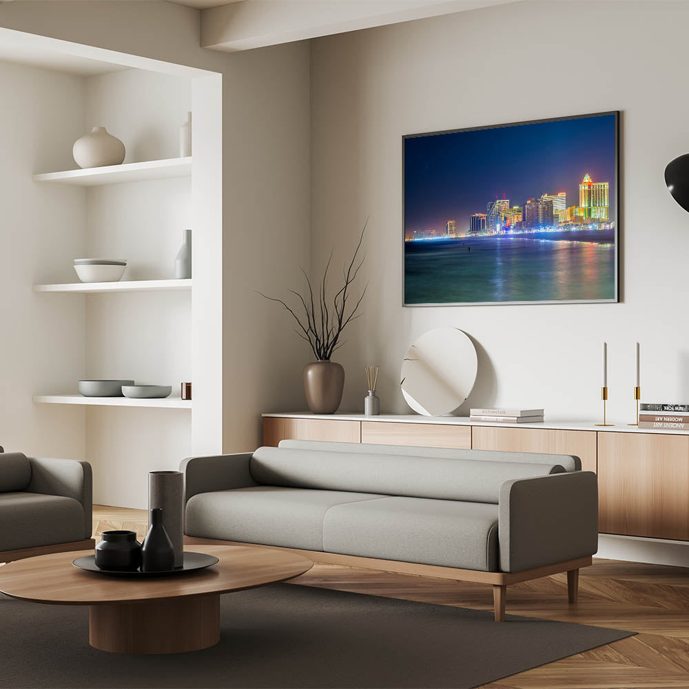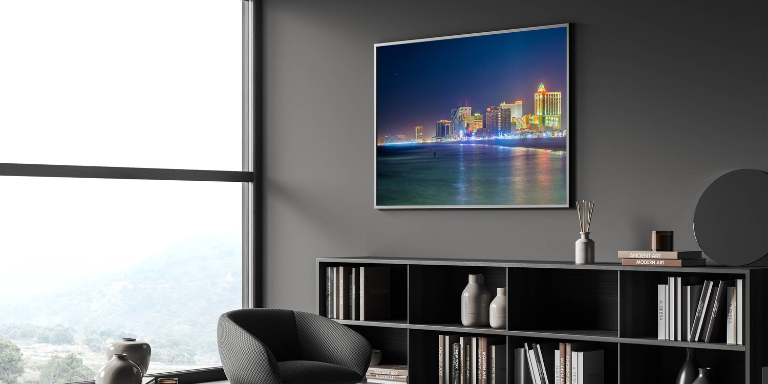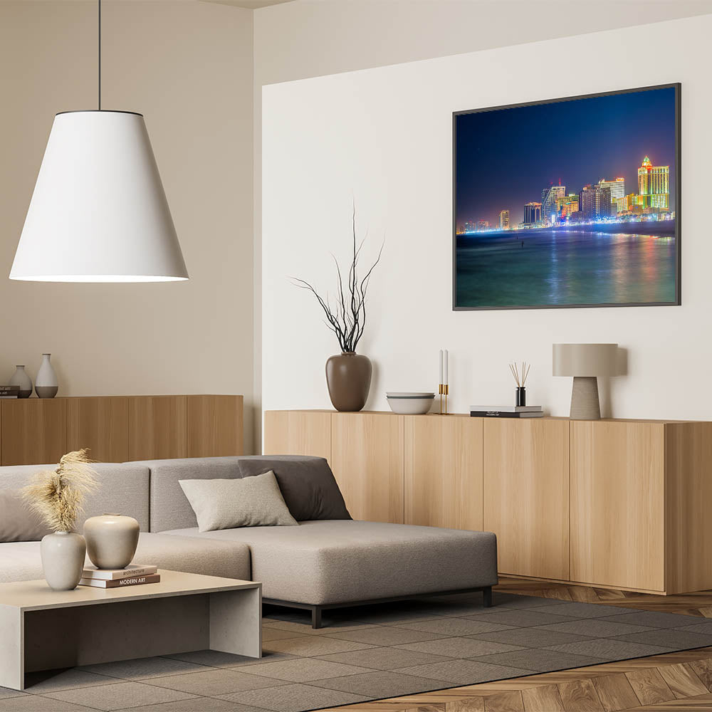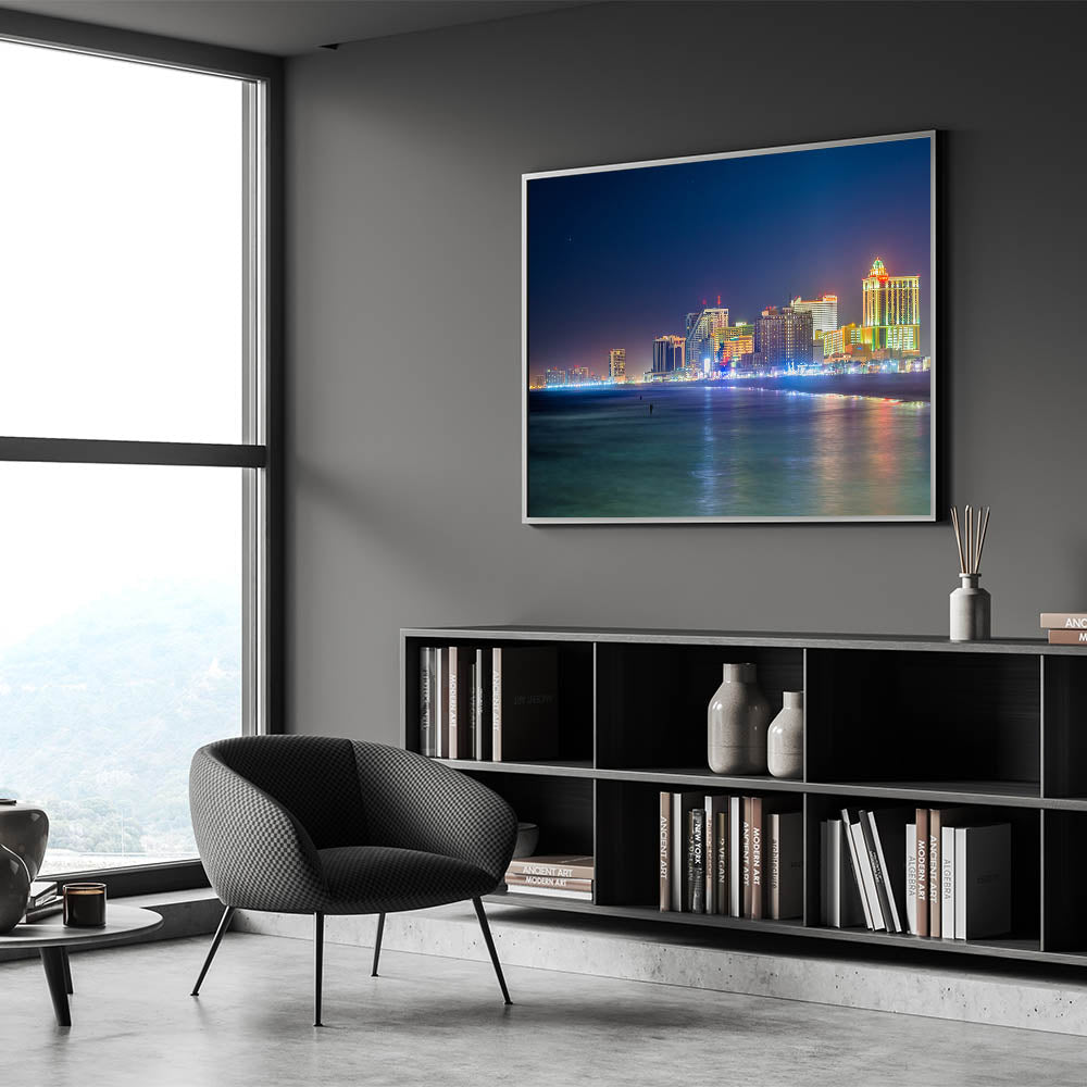 Capture the vibrant nightlife of Atlantic City with this stunning nighttime image of the skyline and glowing reflections on the water. This high-quality New Jersey wall art offers a striking view of the famous New Jersey beach city, making it perfect for modern home or office decor. Available as beautiful New Jersey canvas prints or framed art pieces, this vibrant New Jersey beach art brings the energy and excitement of Atlantic City into your space.