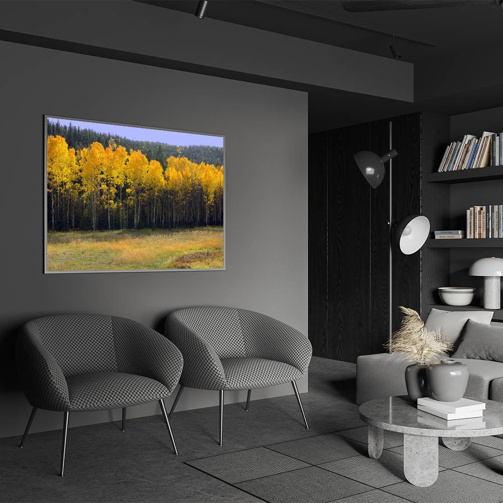 Enhance your home decor with this stunning depiction of vibrant aspen trees during the peak of fall in New Mexico. This high-quality New Mexico scenic art captures the beauty of autumn's golden hues against the backdrop of lush green forests, making it a perfect addition to any living space or office.