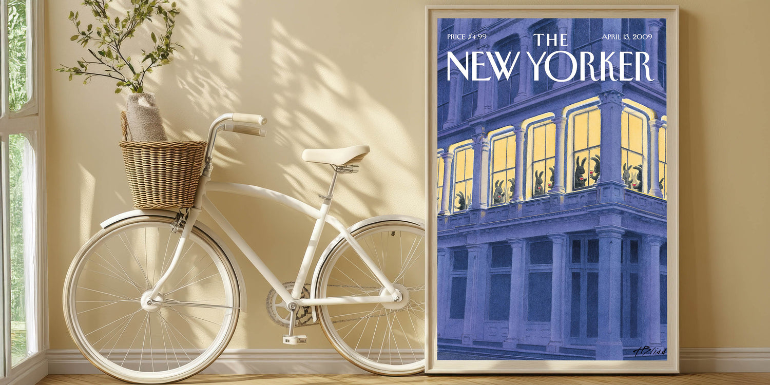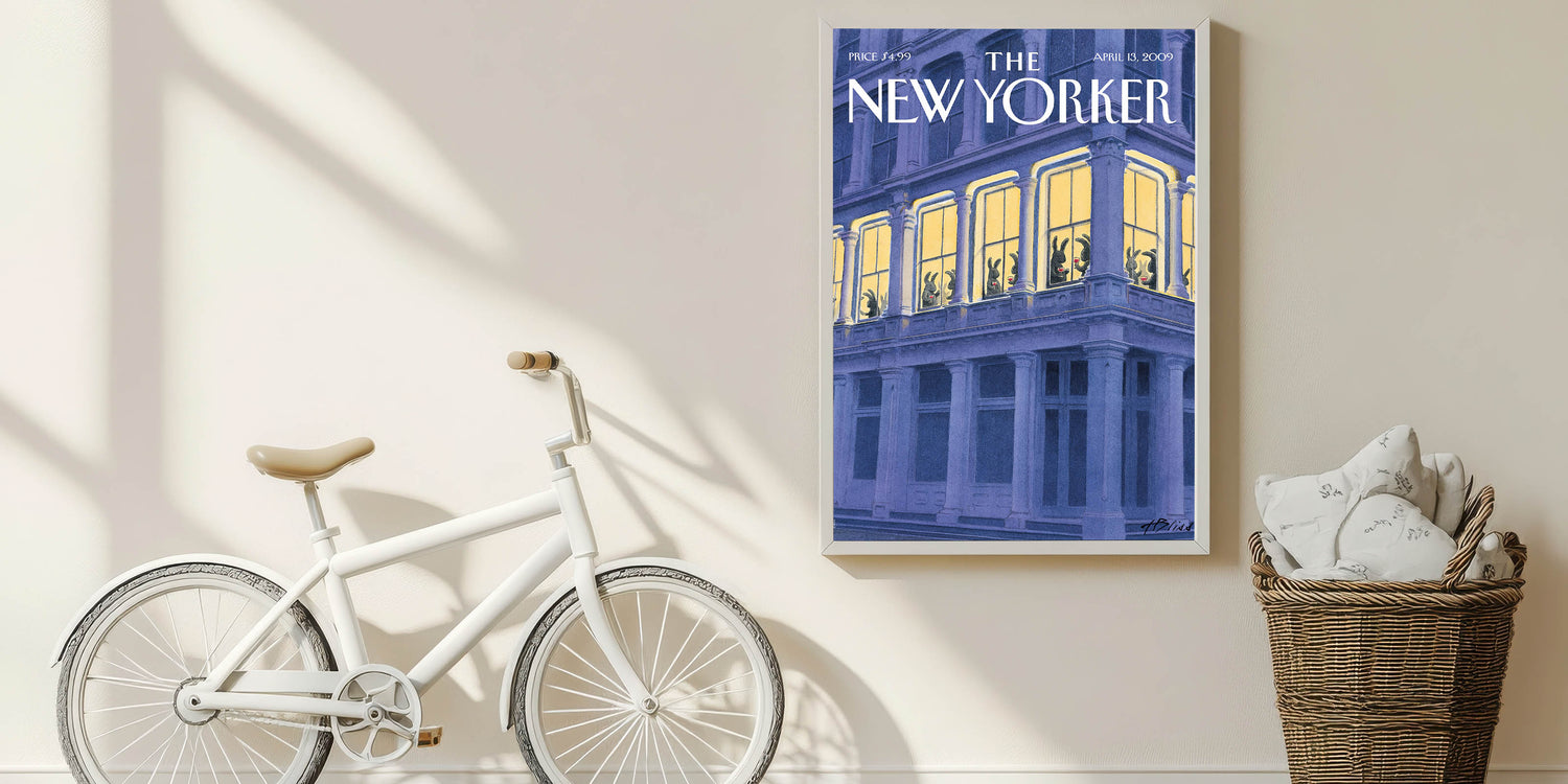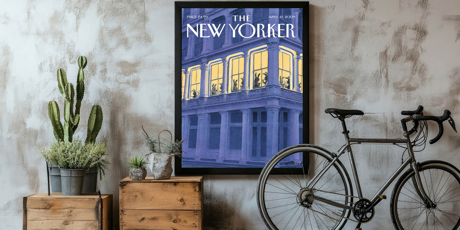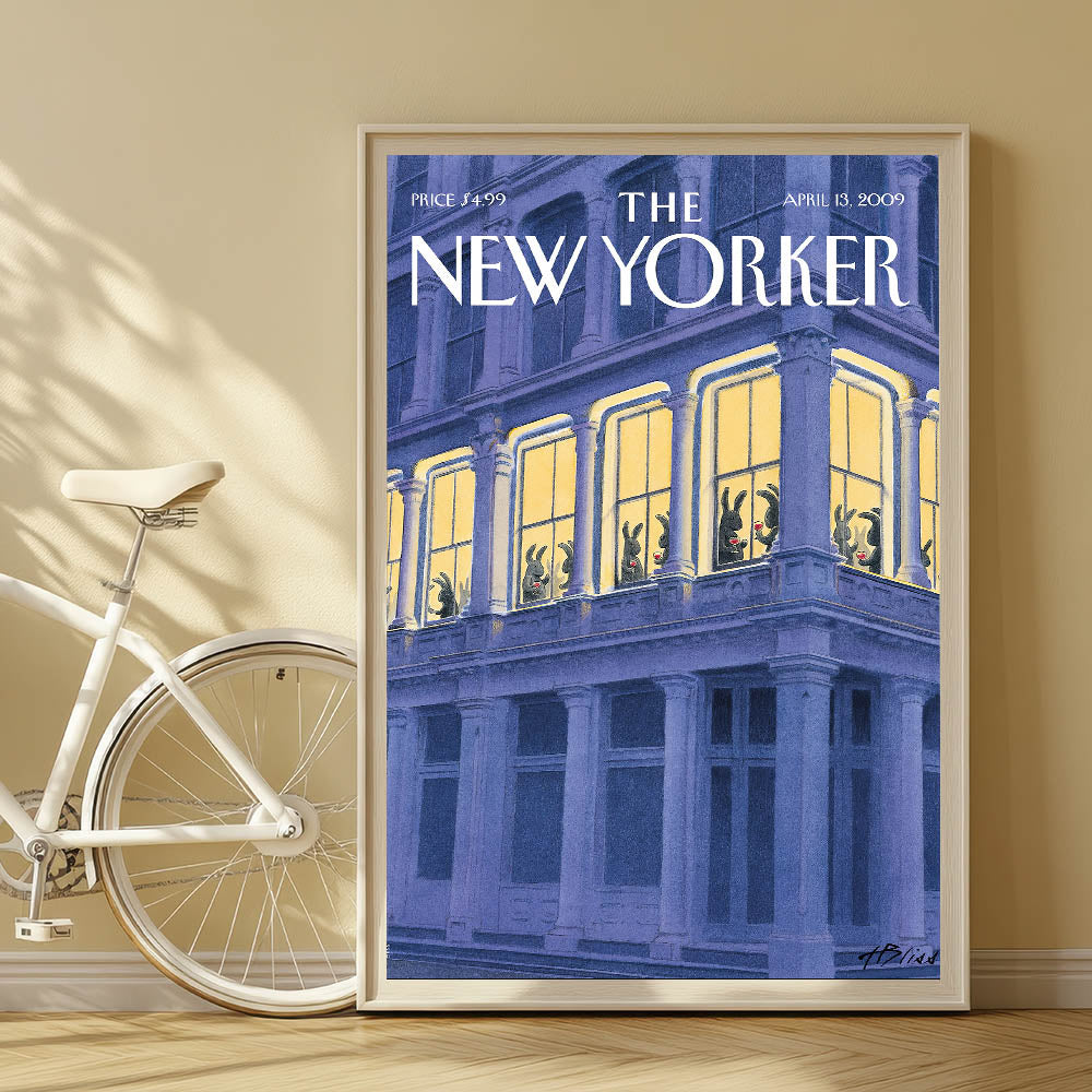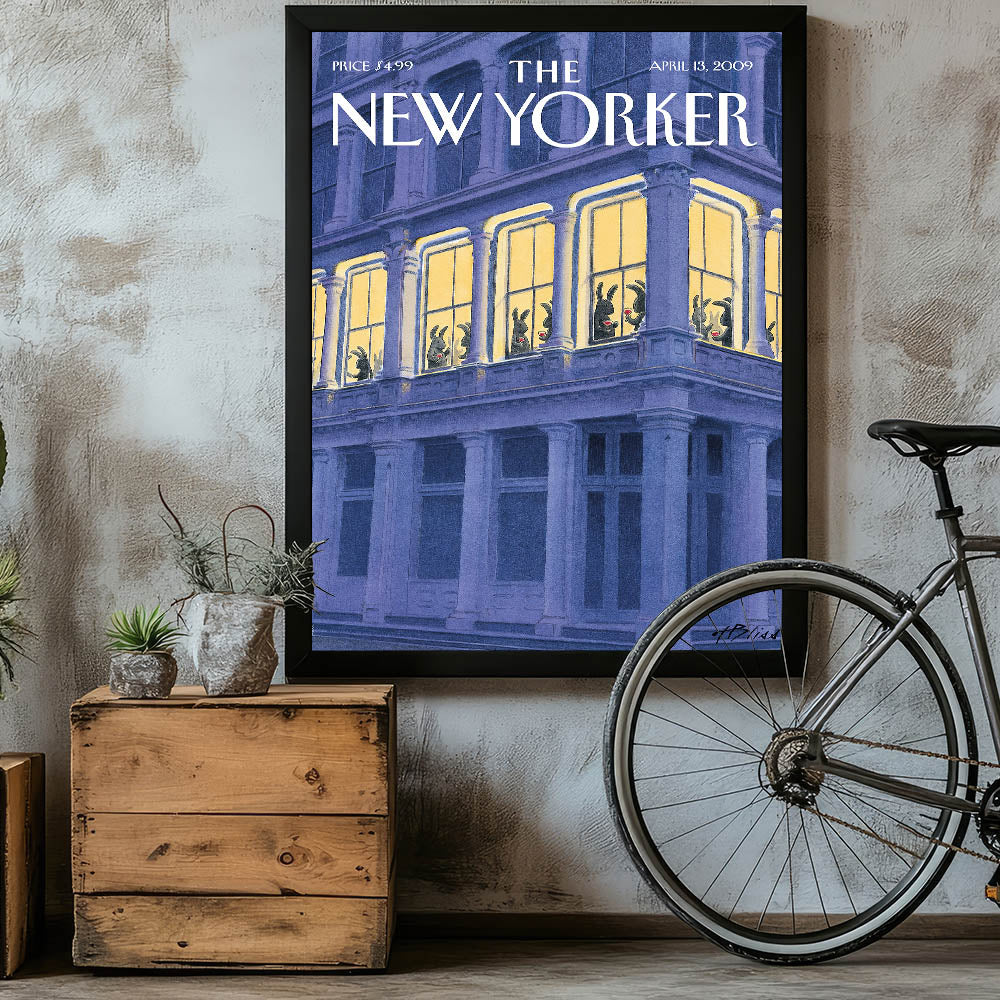 This whimsical New Yorker magazine cover art depicts a group of rabbits enjoying a glass of wine while relaxing inside a brightly lit apartment window. The striking contrast between the dark exterior and the warm glow of the interior creates a cozy yet humorous scene. Perfect for anyone who enjoys quirky New Yorker illustrations, this design combines a playful narrative with sophisticated artistry. The bunnies’ charming poses make this poster a unique and fun addition to any room.