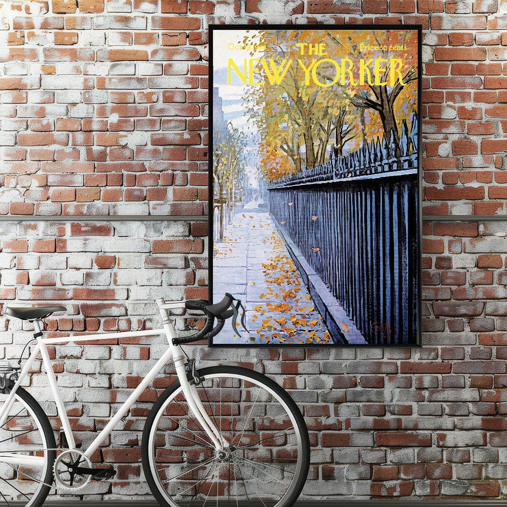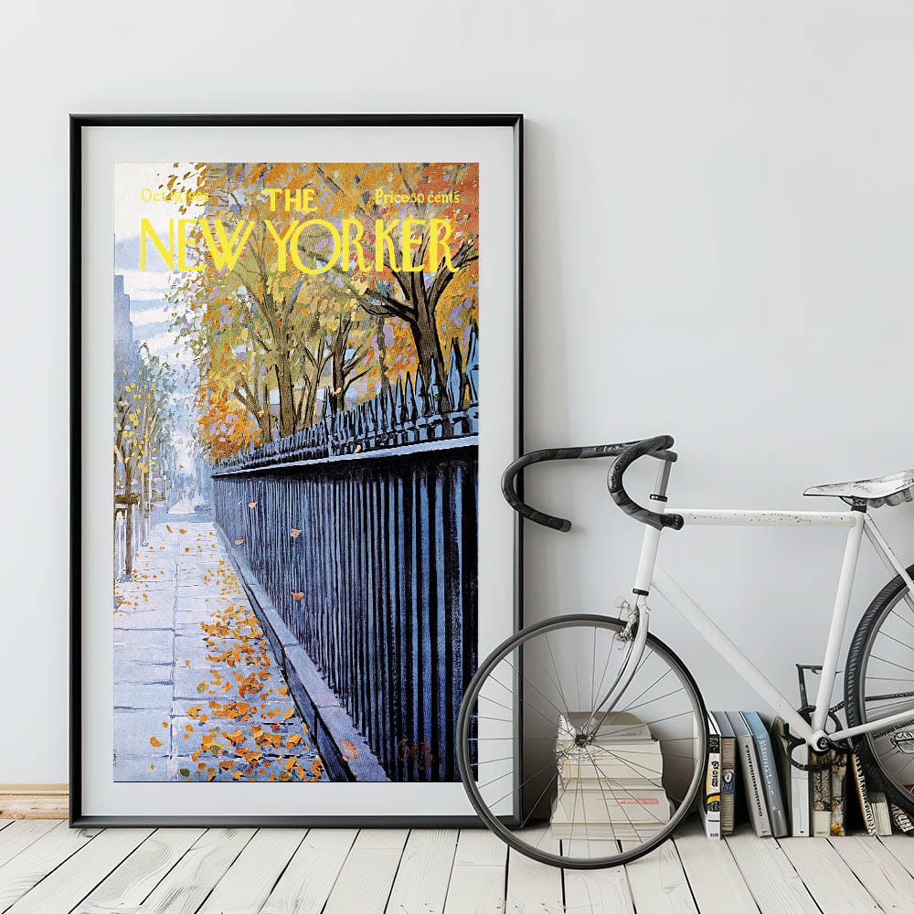 Add a touch of classic New York charm with this New Yorker Magazine Cover Art from October 19, 1968. The artwork beautifully captures a serene autumn scene of fallen leaves on a city sidewalk, bordered by a striking iron fence. The warm yellows and oranges of the fall foliage contrast perfectly with the cool tones of the fence and sidewalk, making this piece a timeless addition to any space.