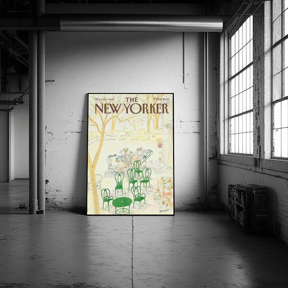 This New Yorker Magazine Cover Art from May 20, 1985, features a humorous and light-hearted illustration by Jean-Jacques Sempé. The image captures an elderly couple painting green chairs in their garden, with a charming and tranquil atmosphere. The playful scene evokes a sense of nostalgia and simplicity, making it a delightful piece for anyone who enjoys quirky and thoughtful art.