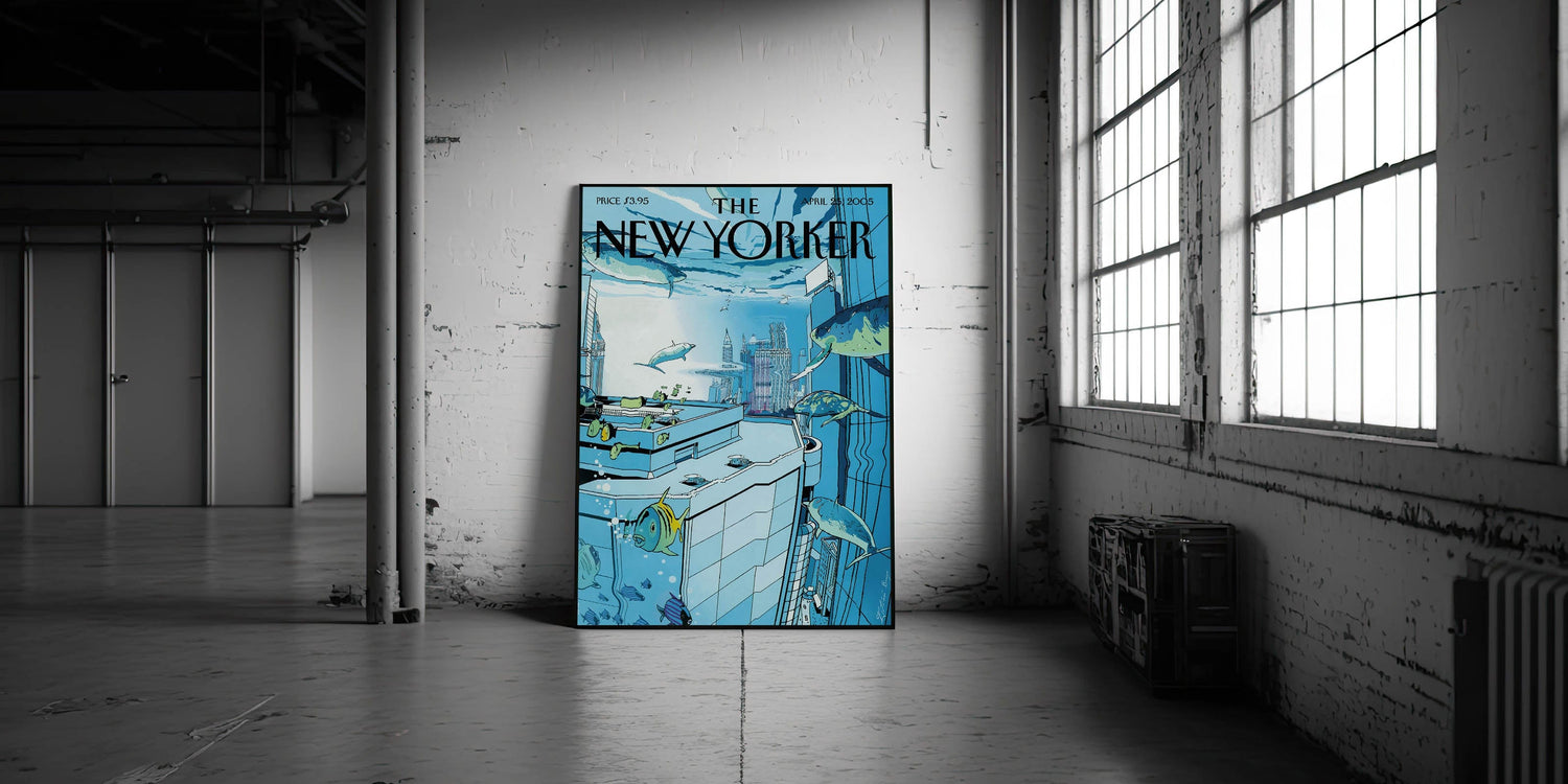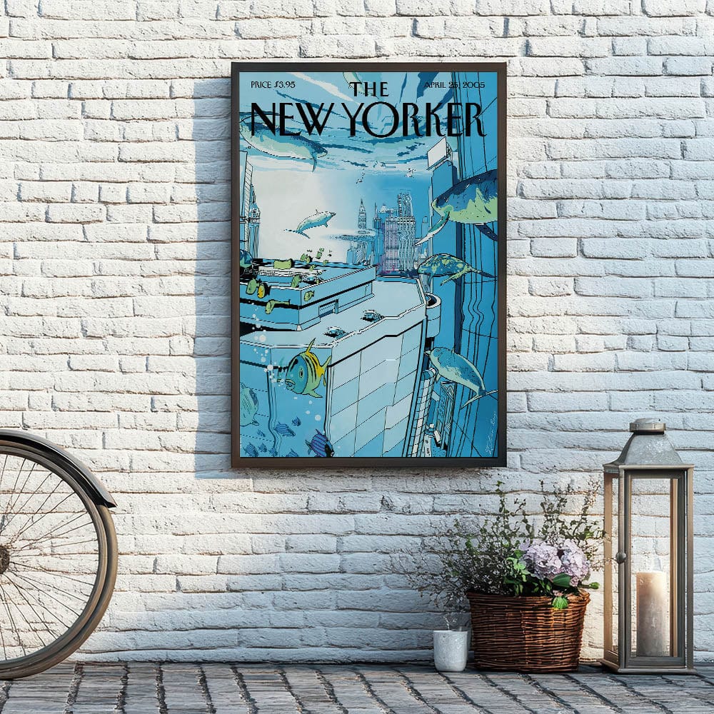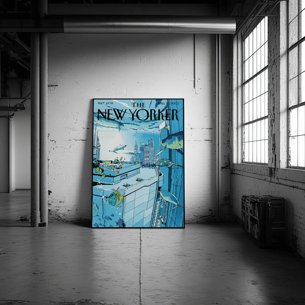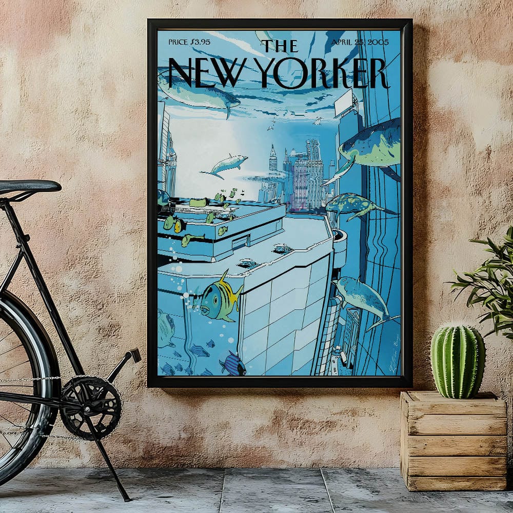This New Yorker Magazine Cover Art from April 25, 2005, presents a striking and surreal underwater cityscape. Fish, dolphins, and other sea creatures swim around towering skyscrapers, creating a unique blend of urban and marine life. The vibrant blue hues and bold graphic lines make this artwork stand out, offering a fresh, playful interpretation of city life. This cover illustration sparks imagination and adds a quirky touch to any space.