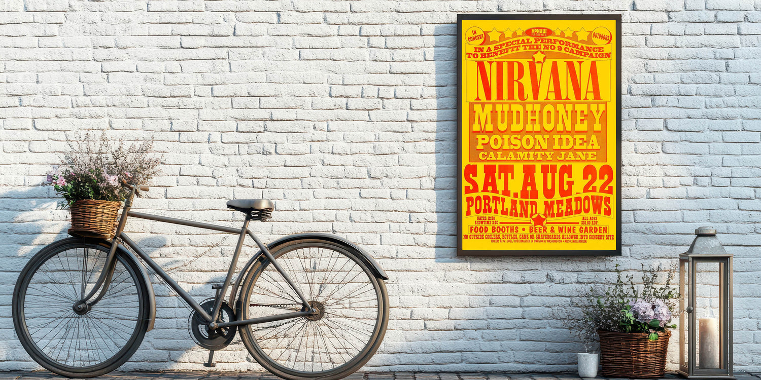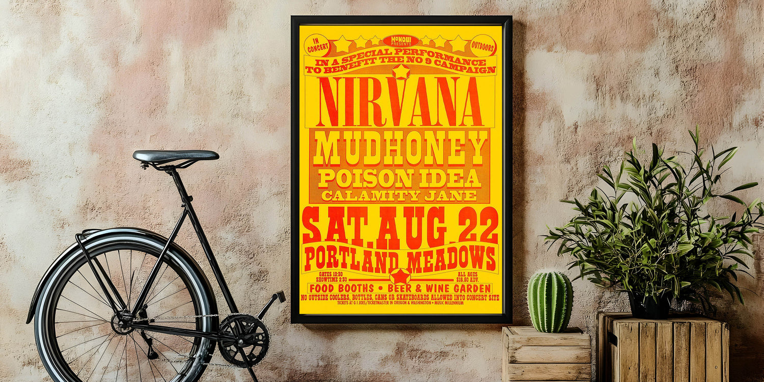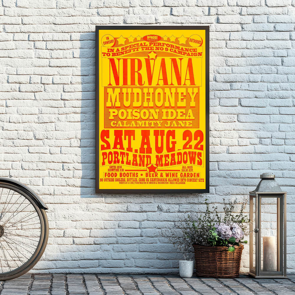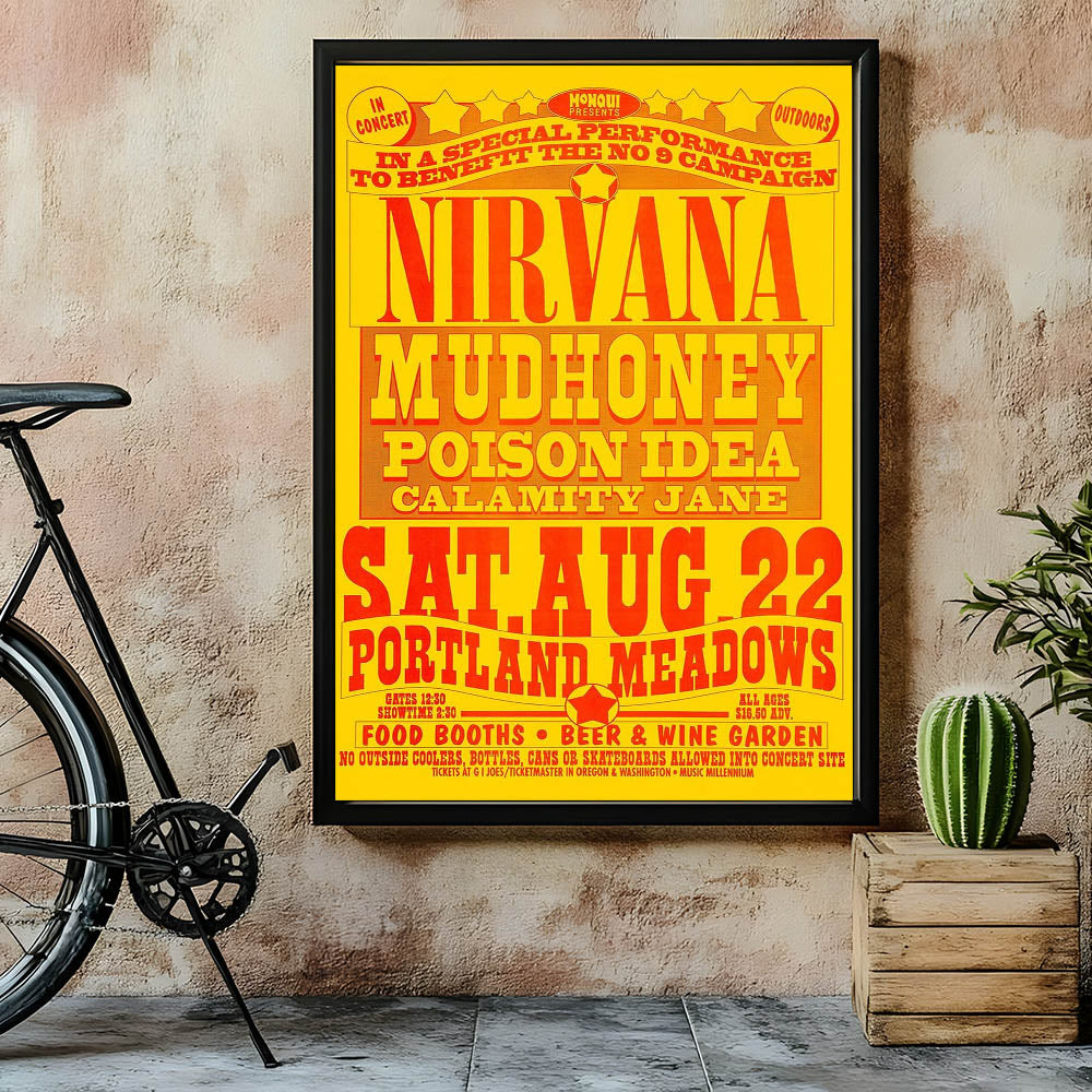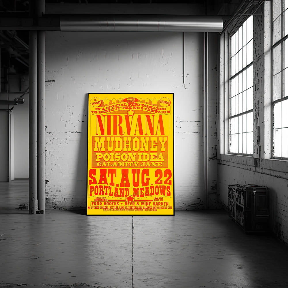 Celebrate the vibrant energy of the 90s with this iconic Nirvana 1990 concert poster. Featuring bold typography and vibrant colors, this vintage-style print highlights Nirvana’s special performance at the Portland Meadows. The yellow and red hues bring a burst of retro charm, capturing the essence of the grunge movement and the powerful presence of the band.