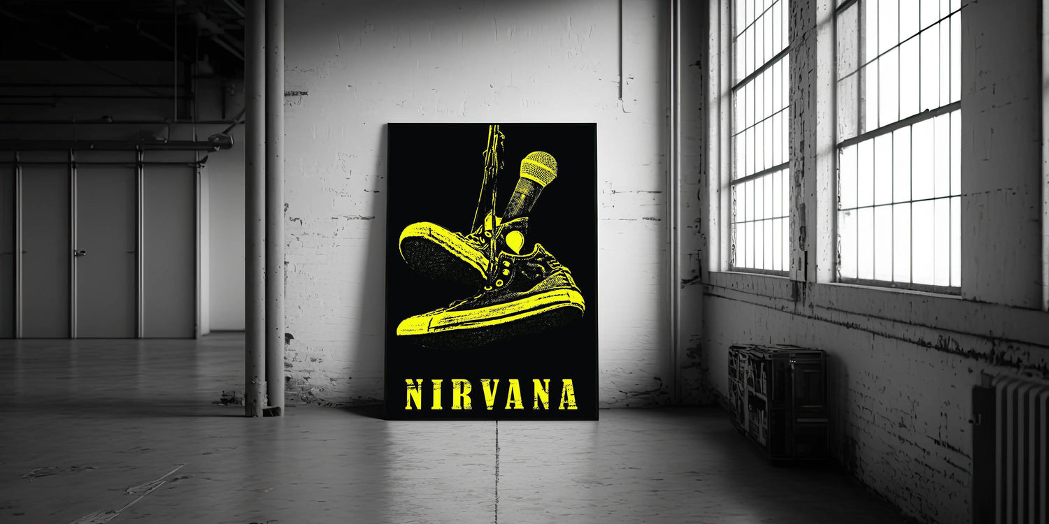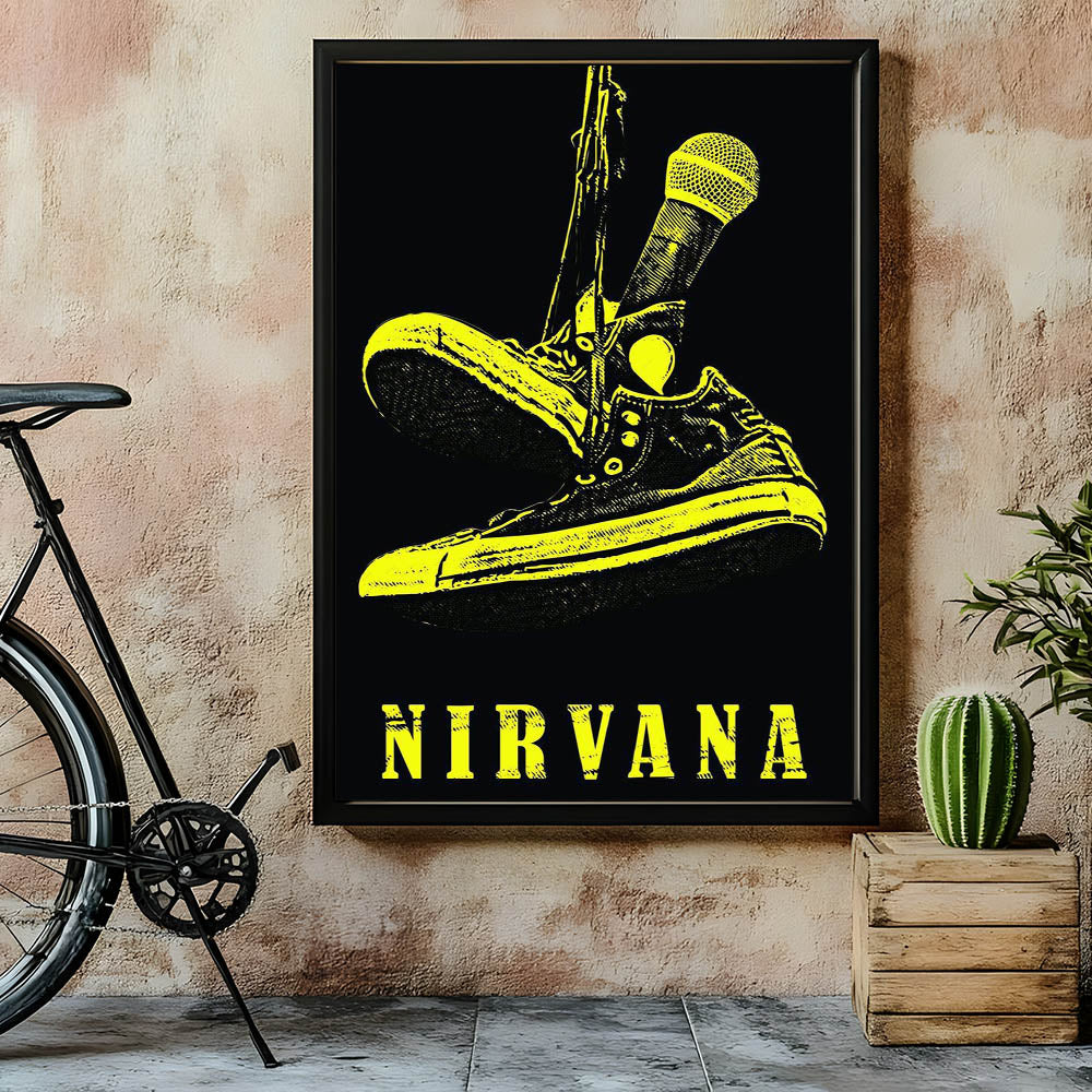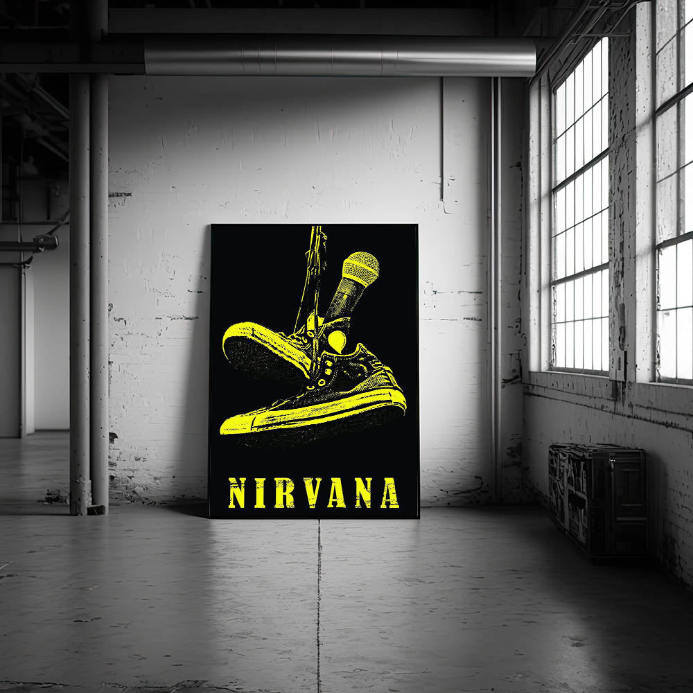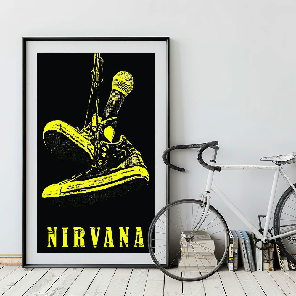 Add a bold, punk-inspired touch to your home with this Nirvana poster, featuring a striking yellow illustration of sneakers and a microphone against a black backdrop. This design perfectly captures the essence of the grunge movement, making it a must-have for fans of the band and vintage rock art. The contrast of yellow and black gives the poster an edgy, high-energy look that will make any space stand out.