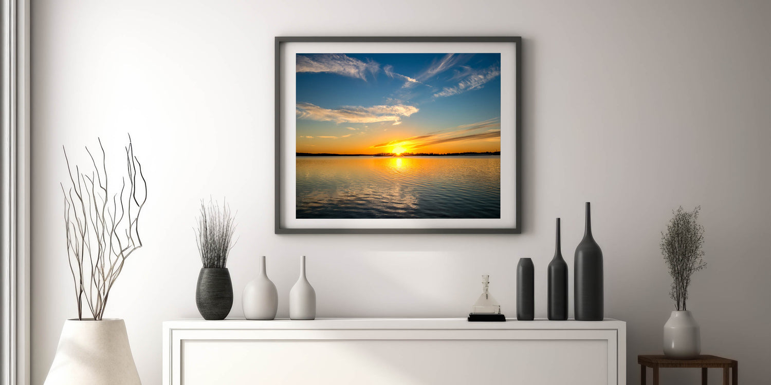 - High-quality Oklahoma scenic prints showcasing a vibrant sunset over a serene lake