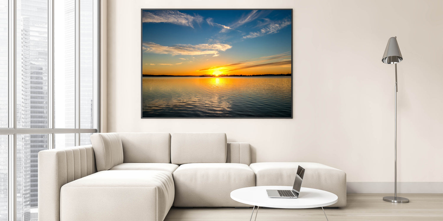Capture the radiant beauty of an Oklahoma sunset with this stunning wall art featuring the vibrant colors of the sun dipping below the horizon over a peaceful lake. The rich golden hues and soft blues in the sky reflect off the calm waters, creating a mesmerizing and tranquil scene. This beautiful piece of Oklahoma scenic art is available in various formats, including stretched canvas, framed prints, and acrylic glass, making it the perfect addition to any living room, bedroom, or office.