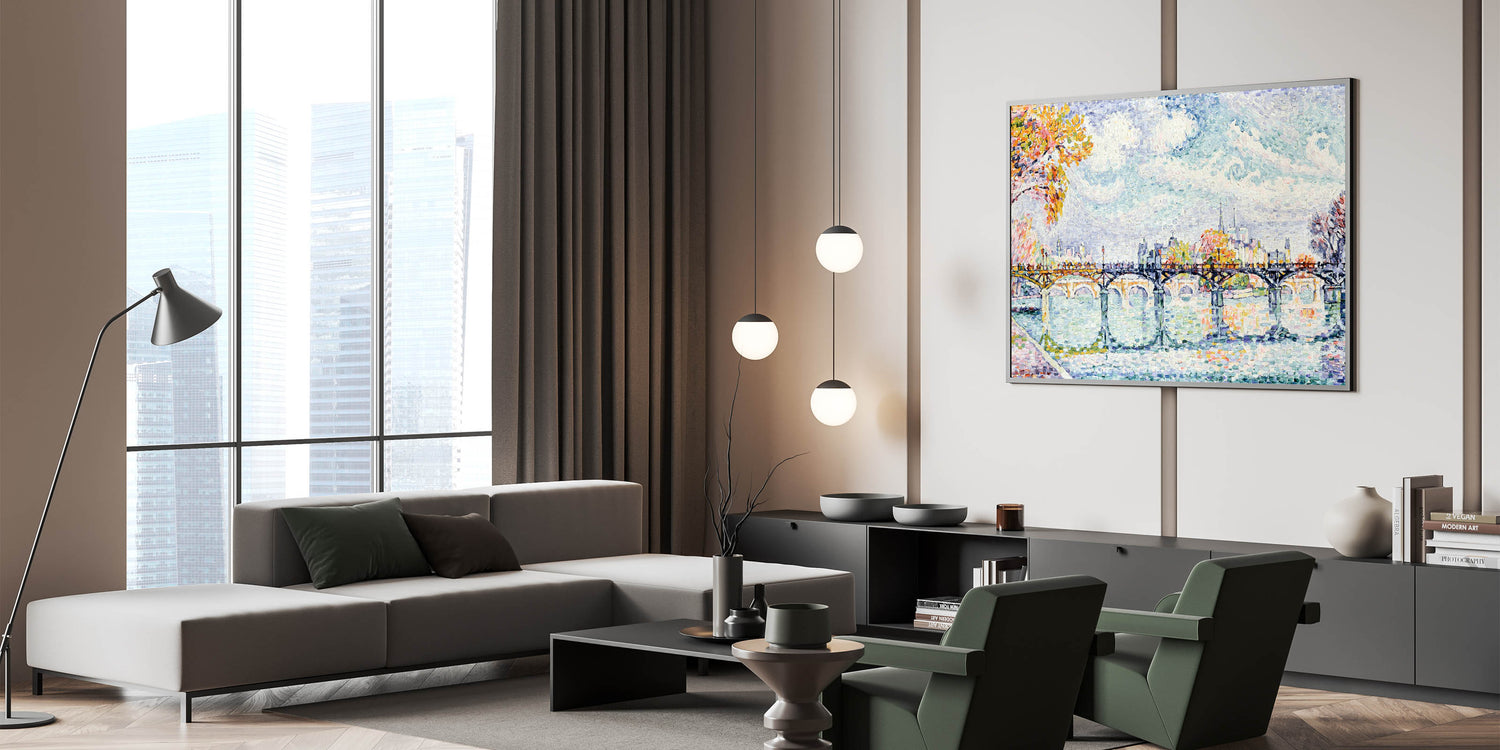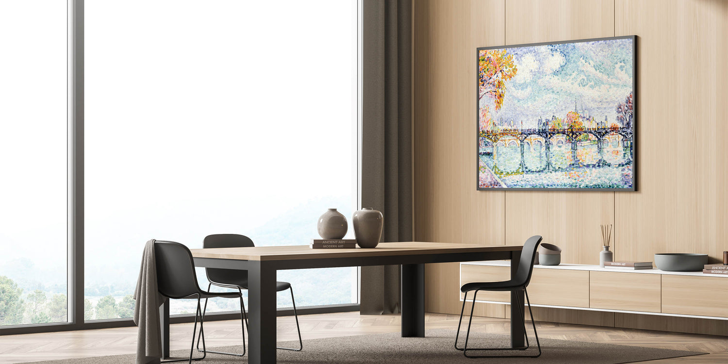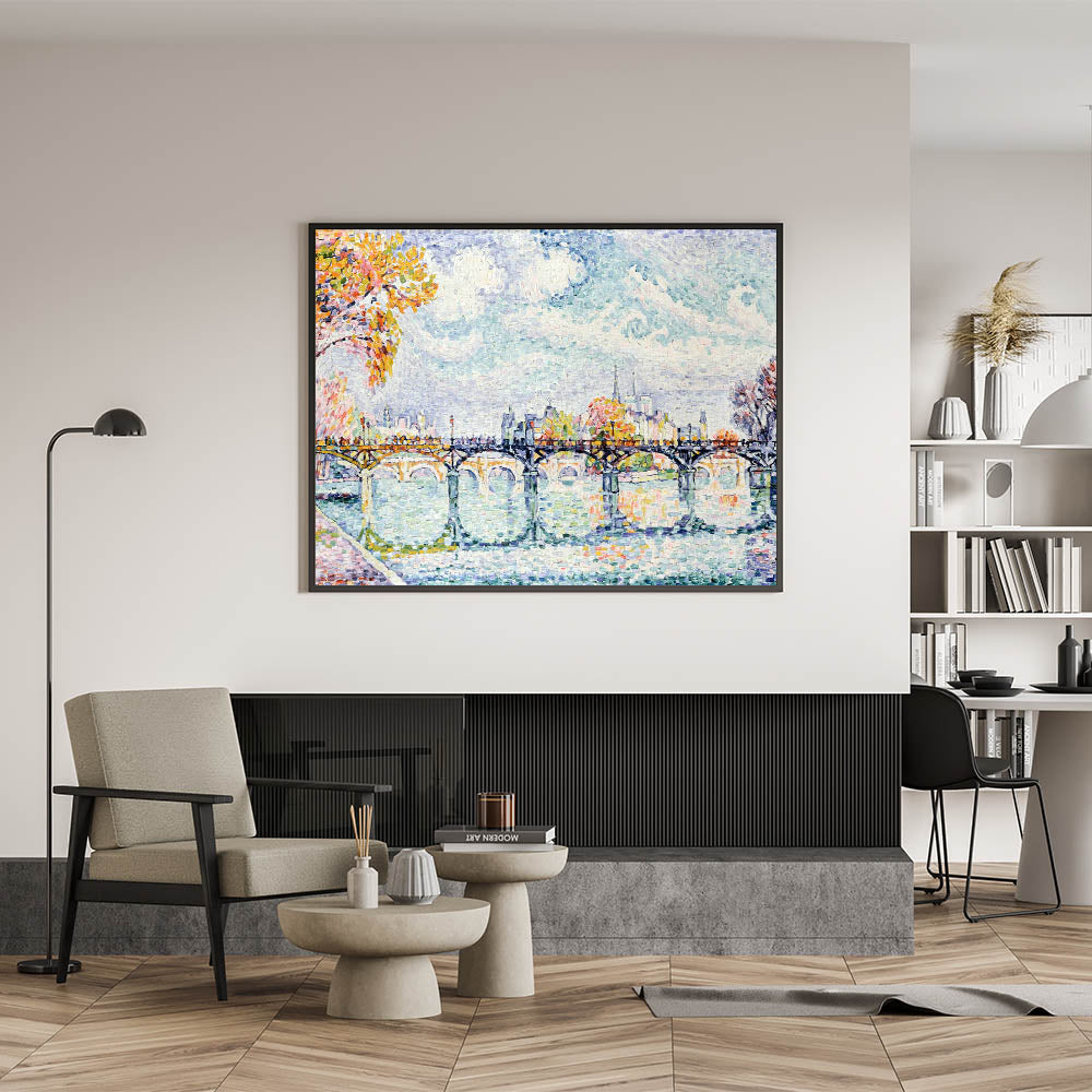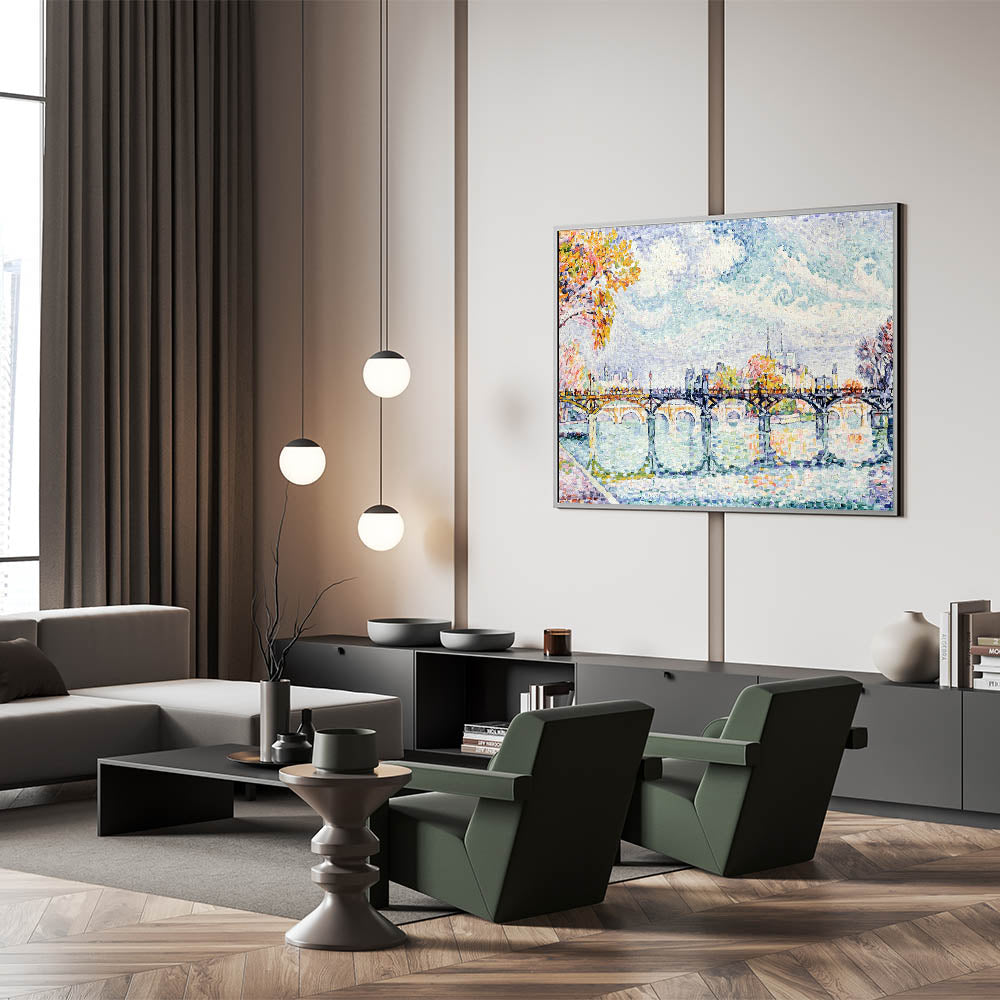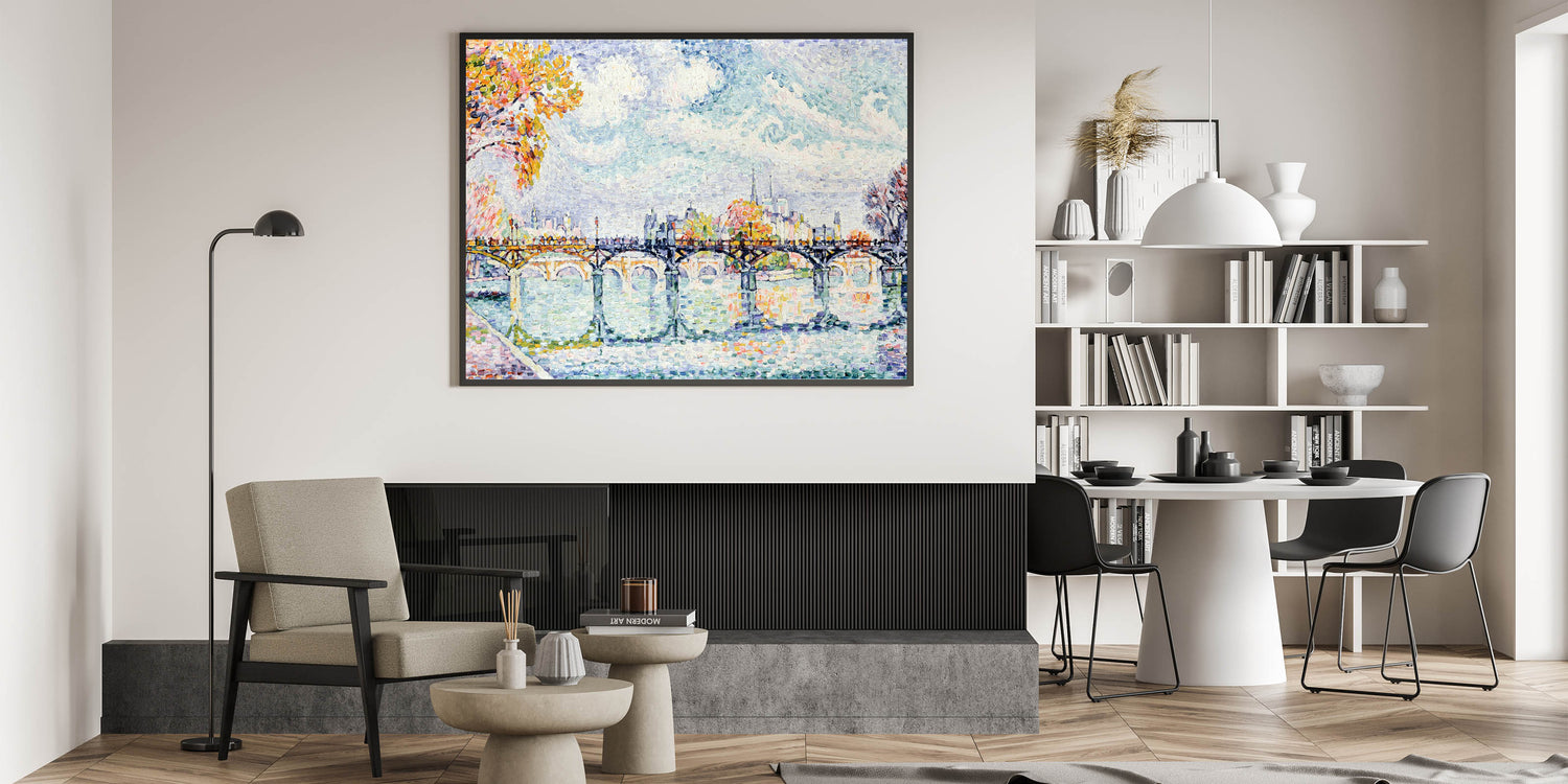 Bring the charm of Paris into your home with this modern wall art, featuring a stunning pointillist depiction of a bridge over the Seine. Painted in vibrant hues of blue, yellow, pink, and green, this artwork captures the beauty and elegance of a Parisian autumn, with trees lining the riverbank and a clear sky above. Perfect for trendy home decor, this unique modern art piece adds sophistication and a touch of classic French style to any room.