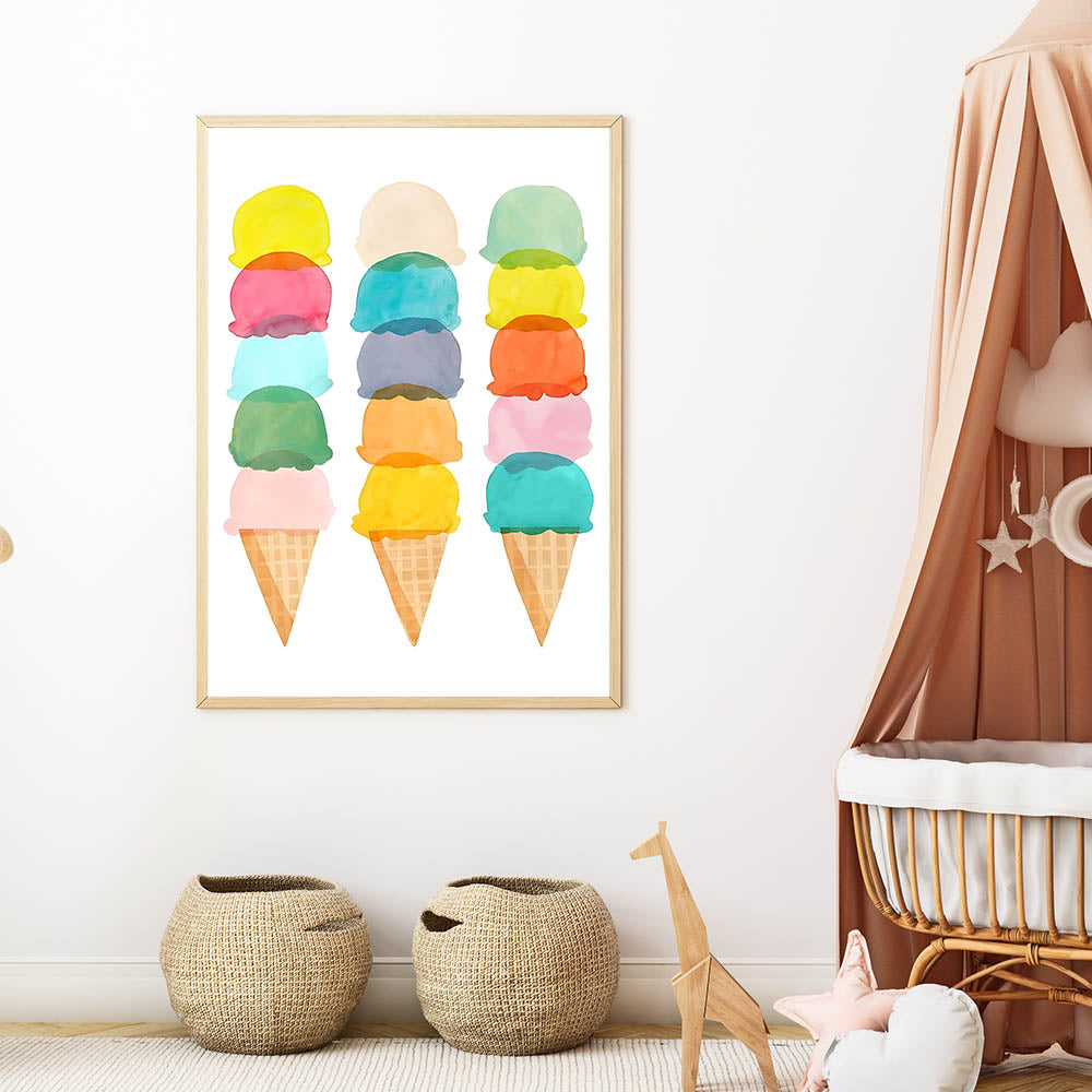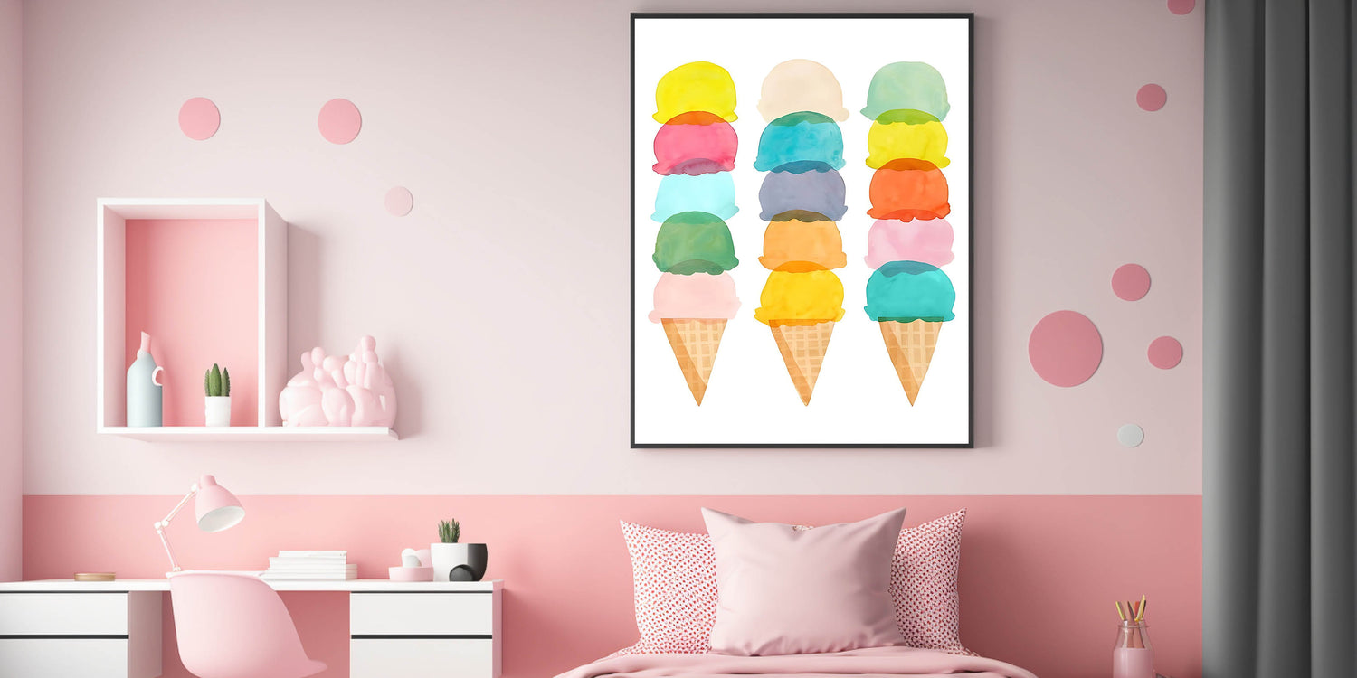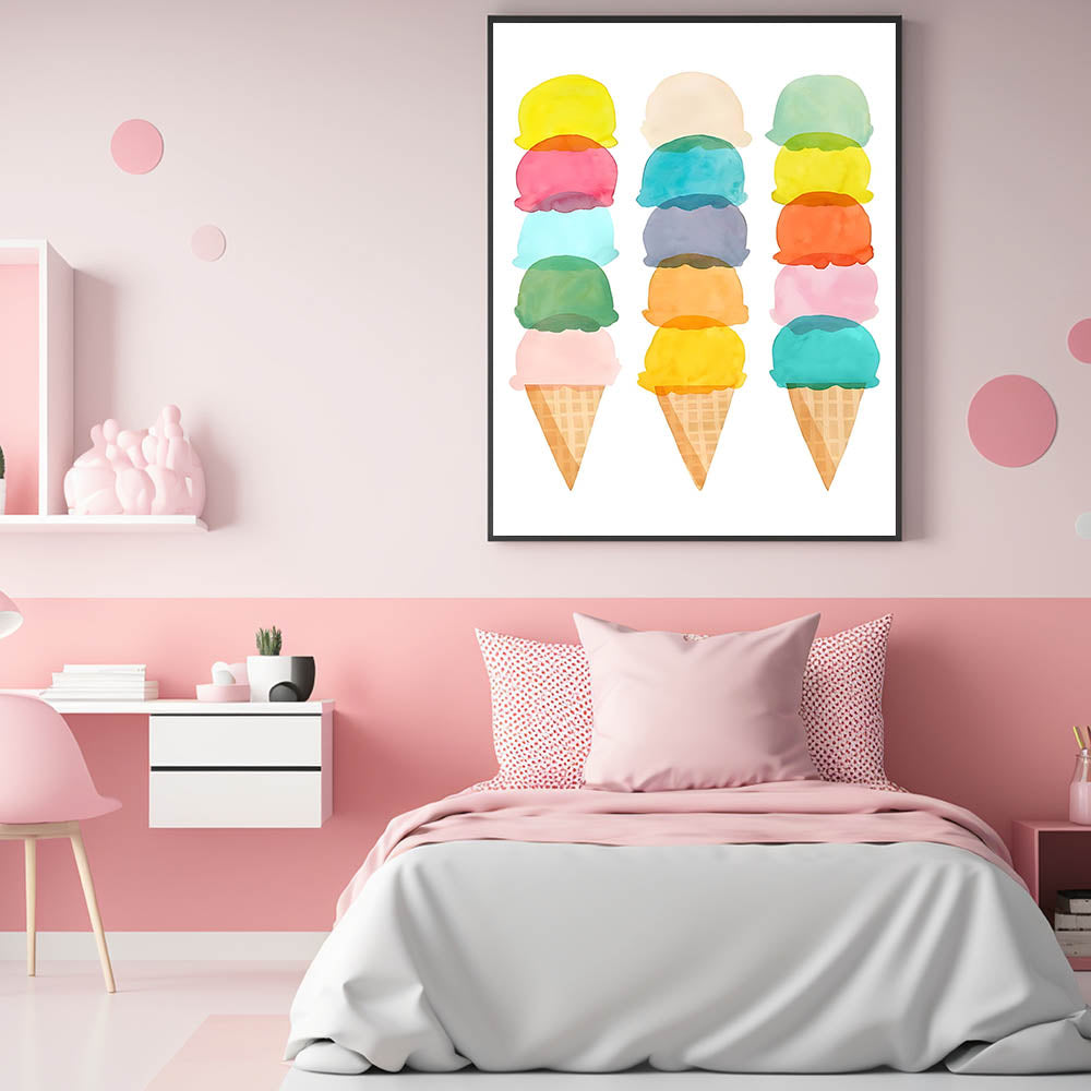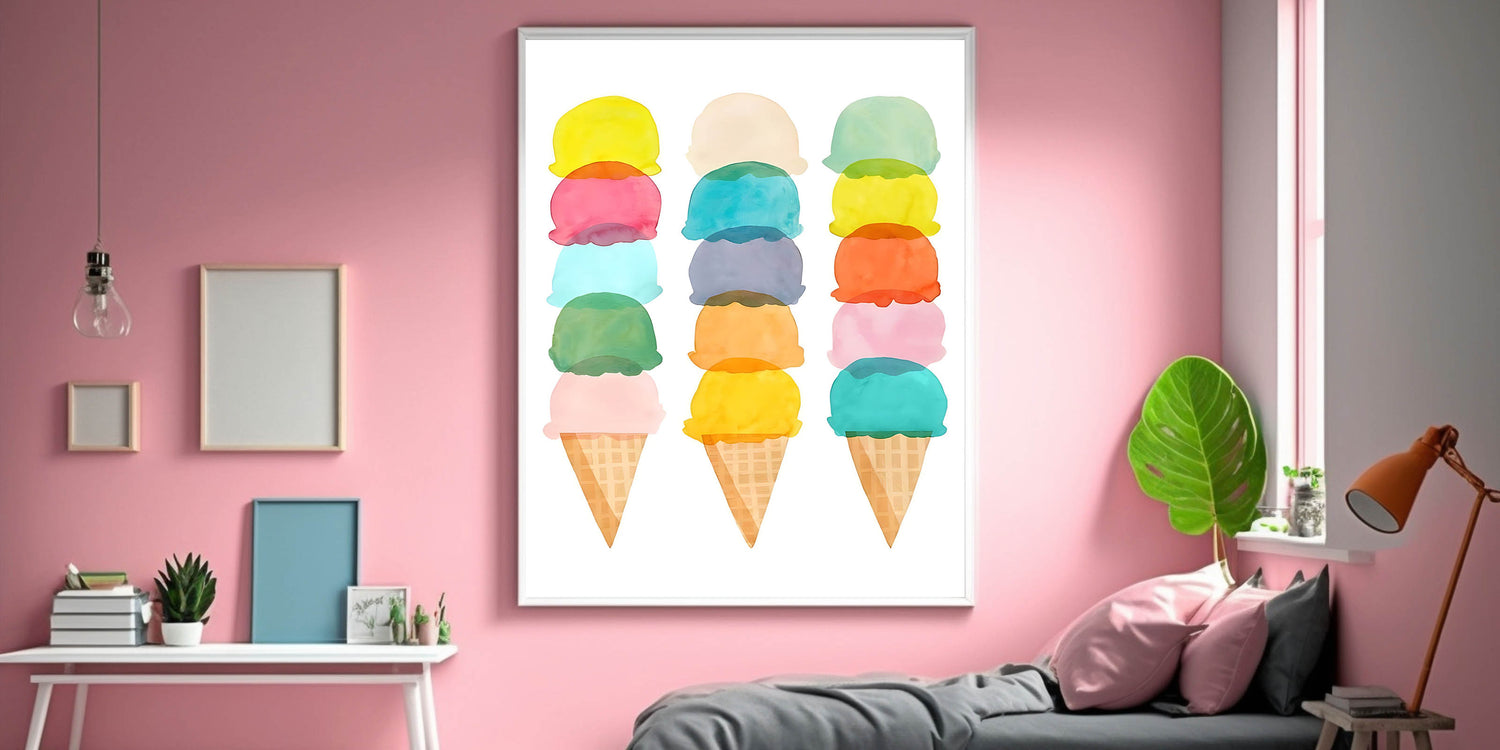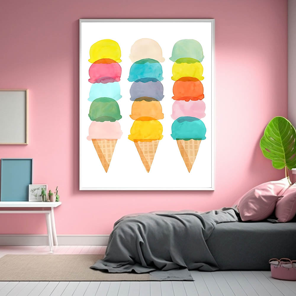 Add a sweet and whimsical touch to your child's room with this pastel ice cream wall art. Featuring stacked watercolor ice cream cones, this delightful artwork is perfect for a girls' bedroom, nursery, or playroom. The soft pastel hues create a cheerful and lighthearted atmosphere, making it an ideal choice for children’s wall decor.