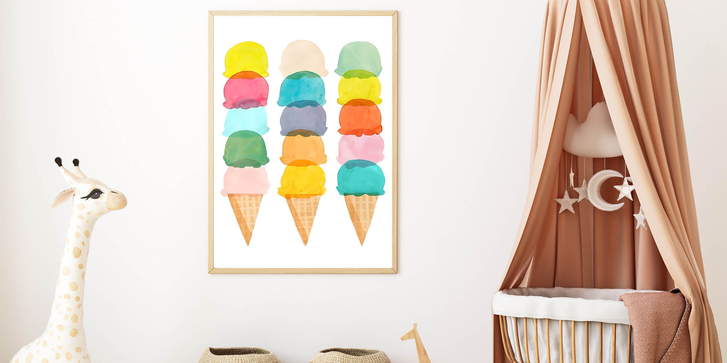 Perfect for ice cream lovers and playful spaces, this nursery wall art makes a fun and colorful statement. Choose your preferred print style and bring a sprinkle of joy to your child’s space today!