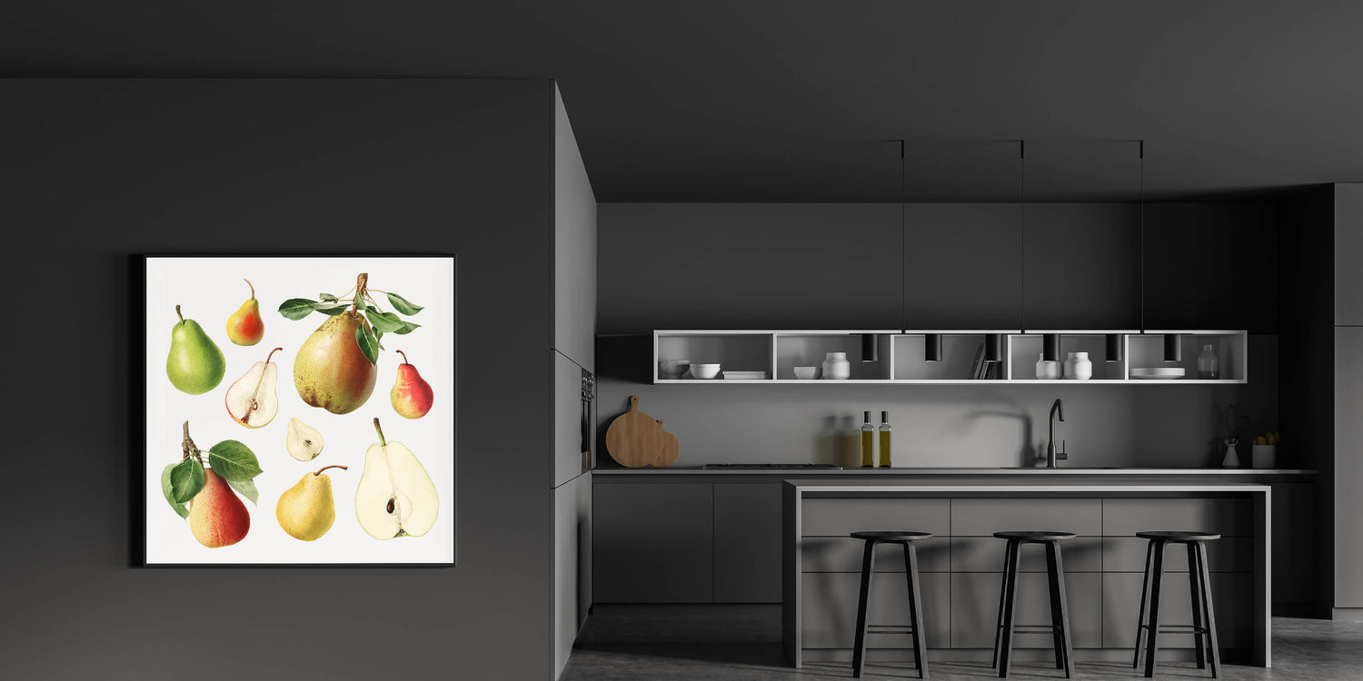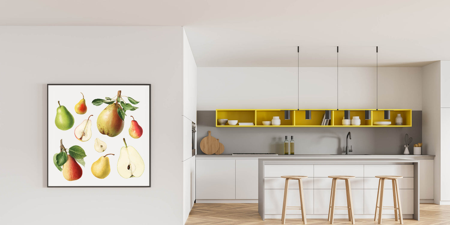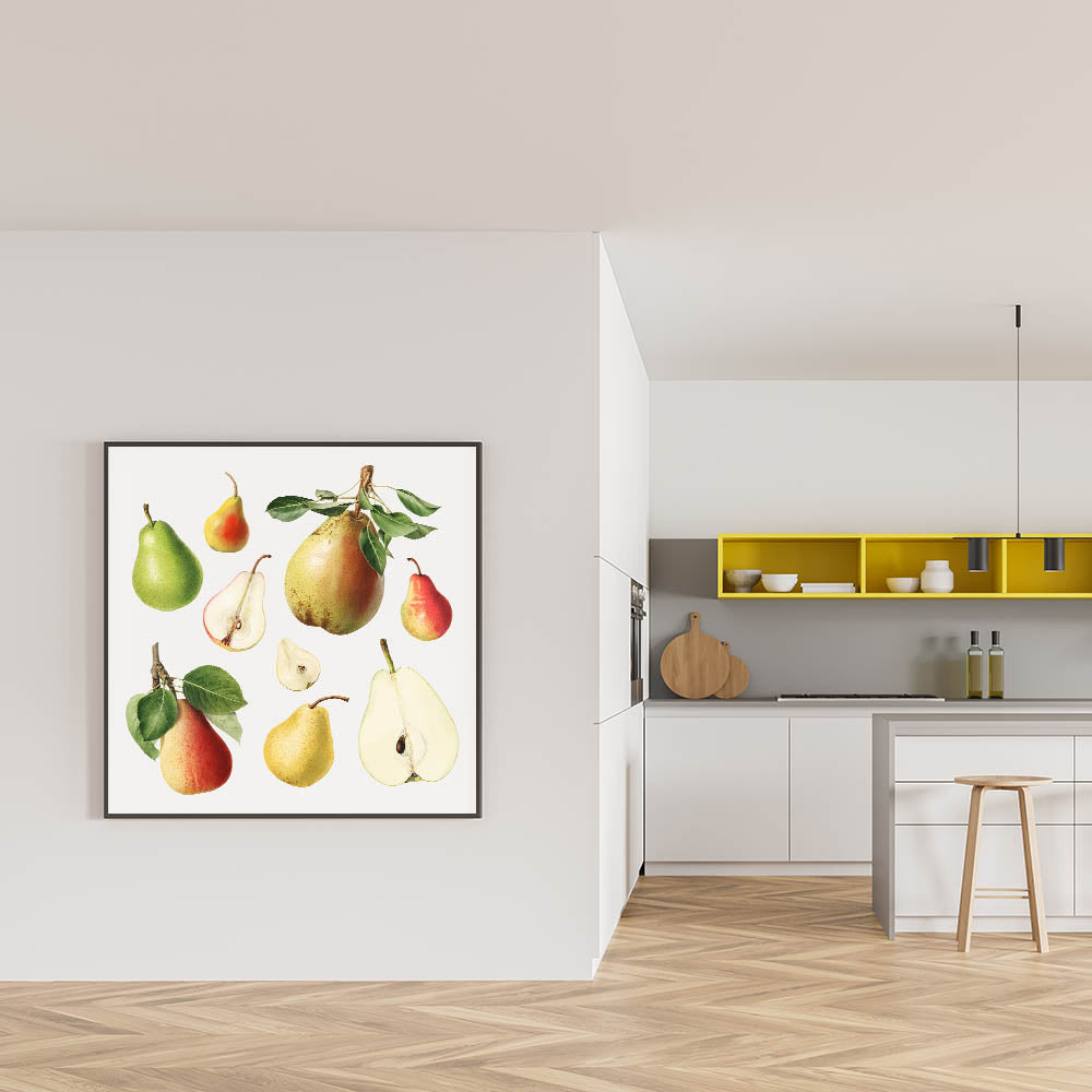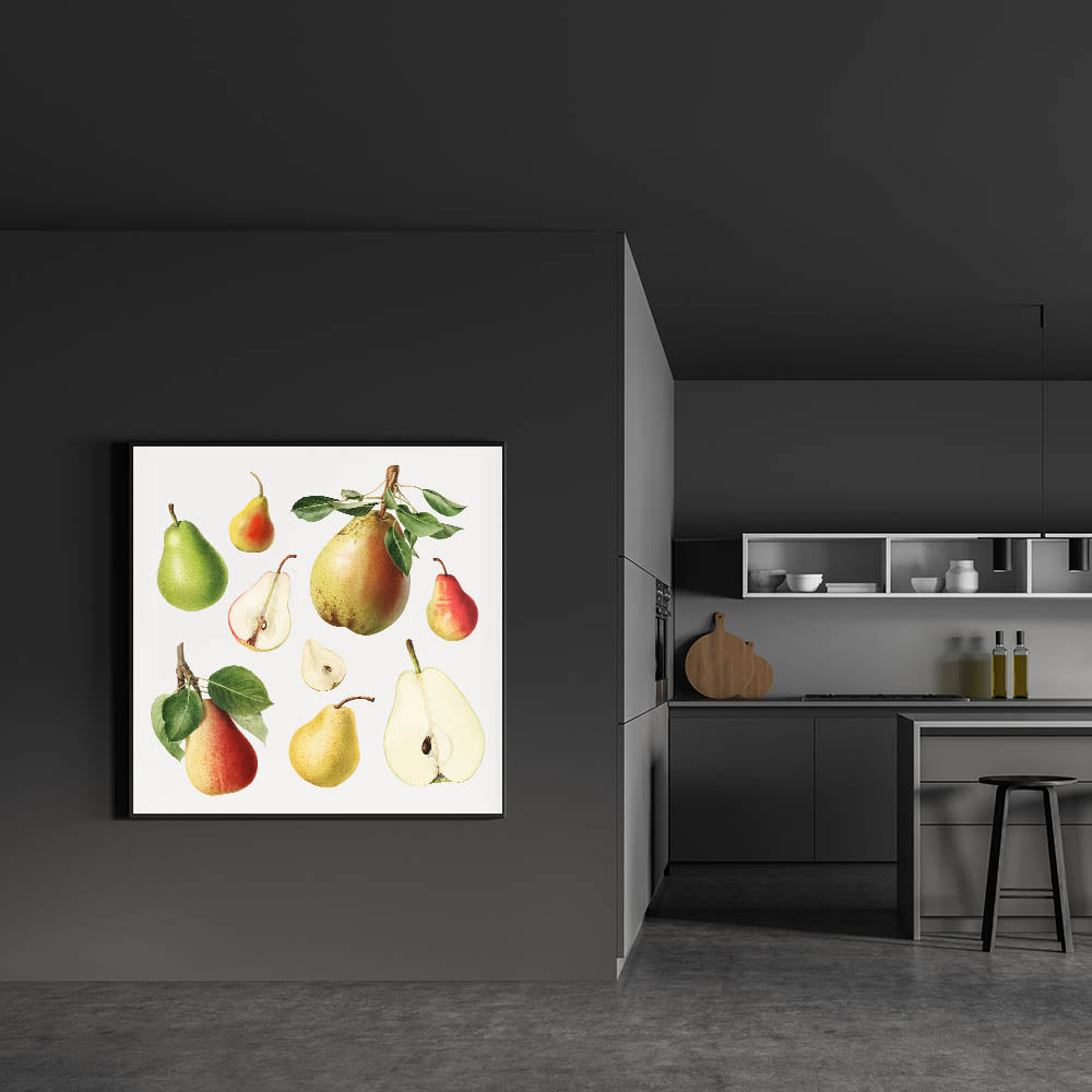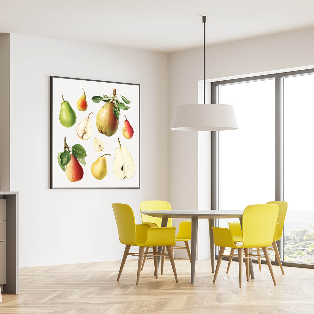 Enhance your space with this fruit-themed wall art featuring a stunning collection of pears in various colors and forms. This fruit illustration print captures the rich textures and organic beauty of whole and sliced pears, making it a perfect decorative piece for fruit kitchen art lovers. The combination of green, yellow, and red hues creates a warm and inviting ambiance, ideal for kitchens, dining rooms, and cafes.