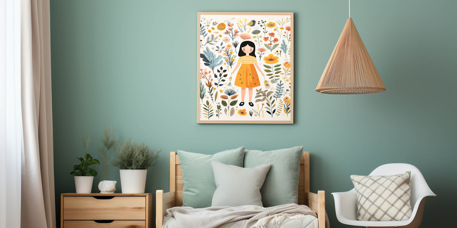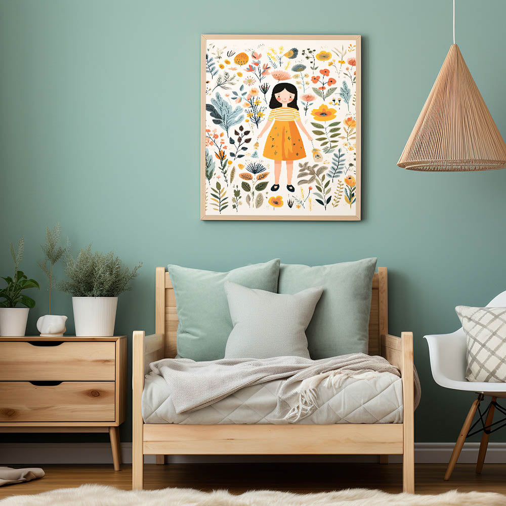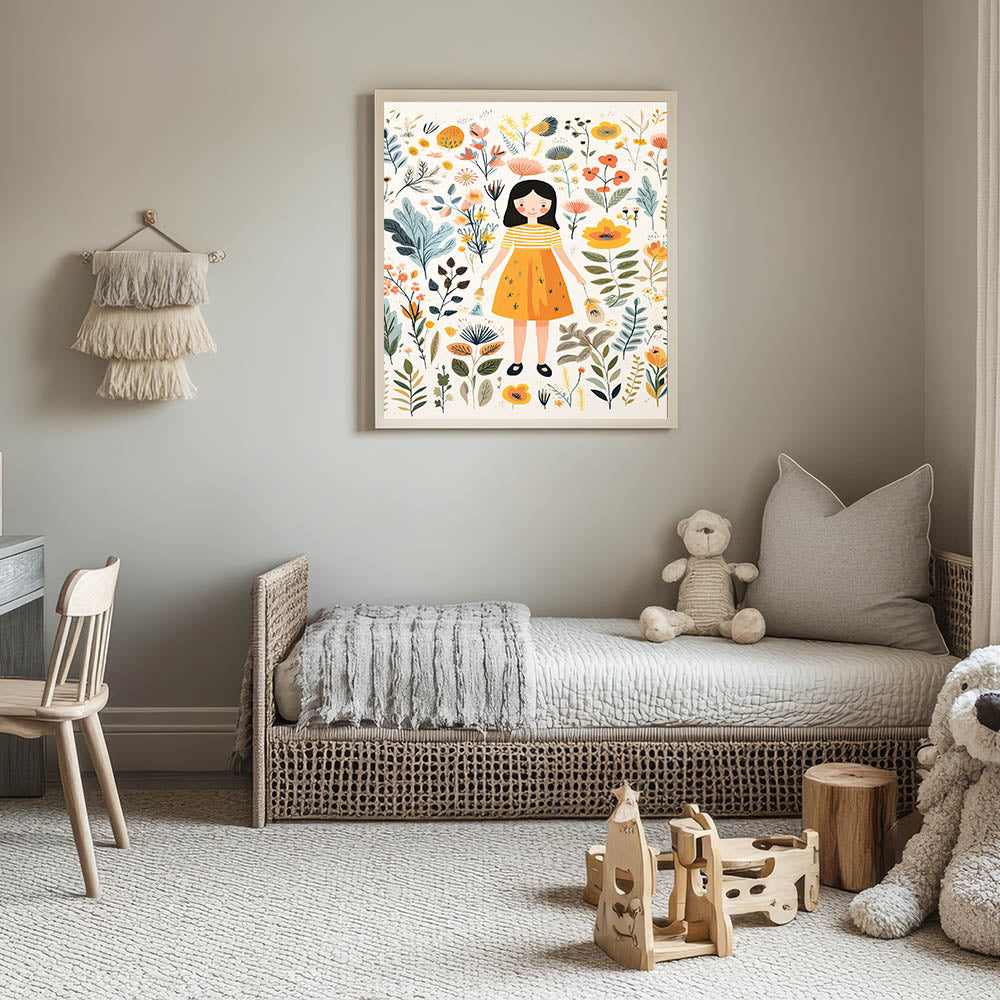 Create a magical and serene atmosphere in your child’s space with this Personalized Children's Art Print, featuring a sweet girl surrounded by delicate botanical elements. The warm yellow, beige, orange, and green hues create a soft and inviting design, perfect for nurseries, playrooms, and bedrooms.