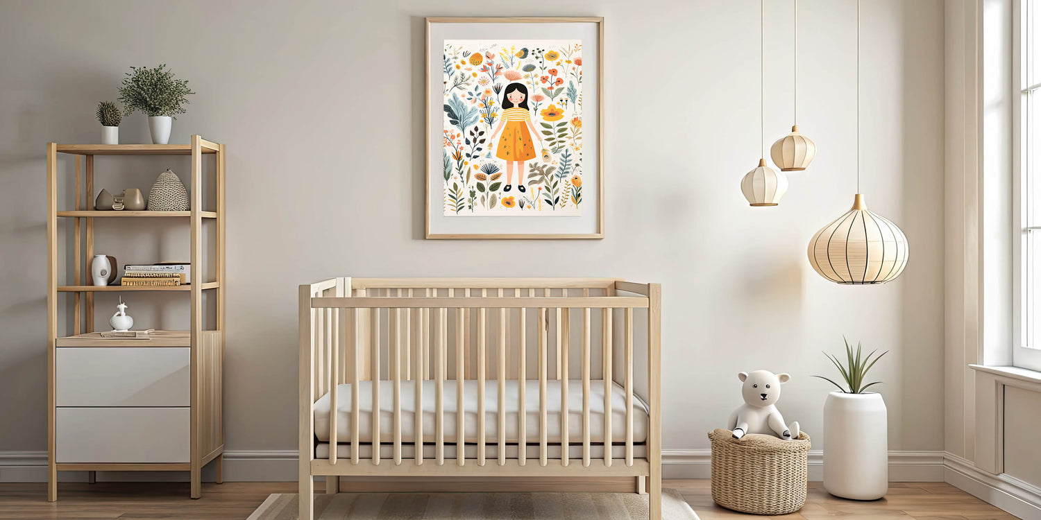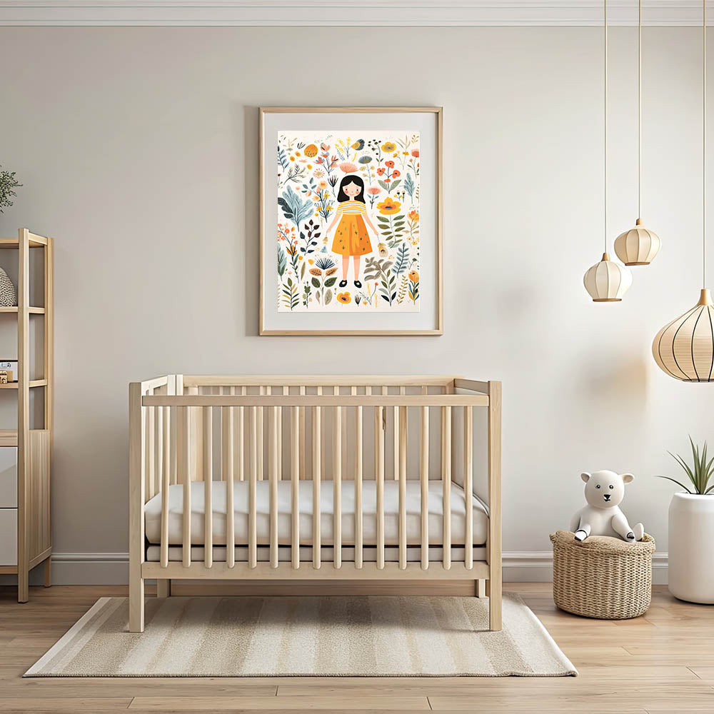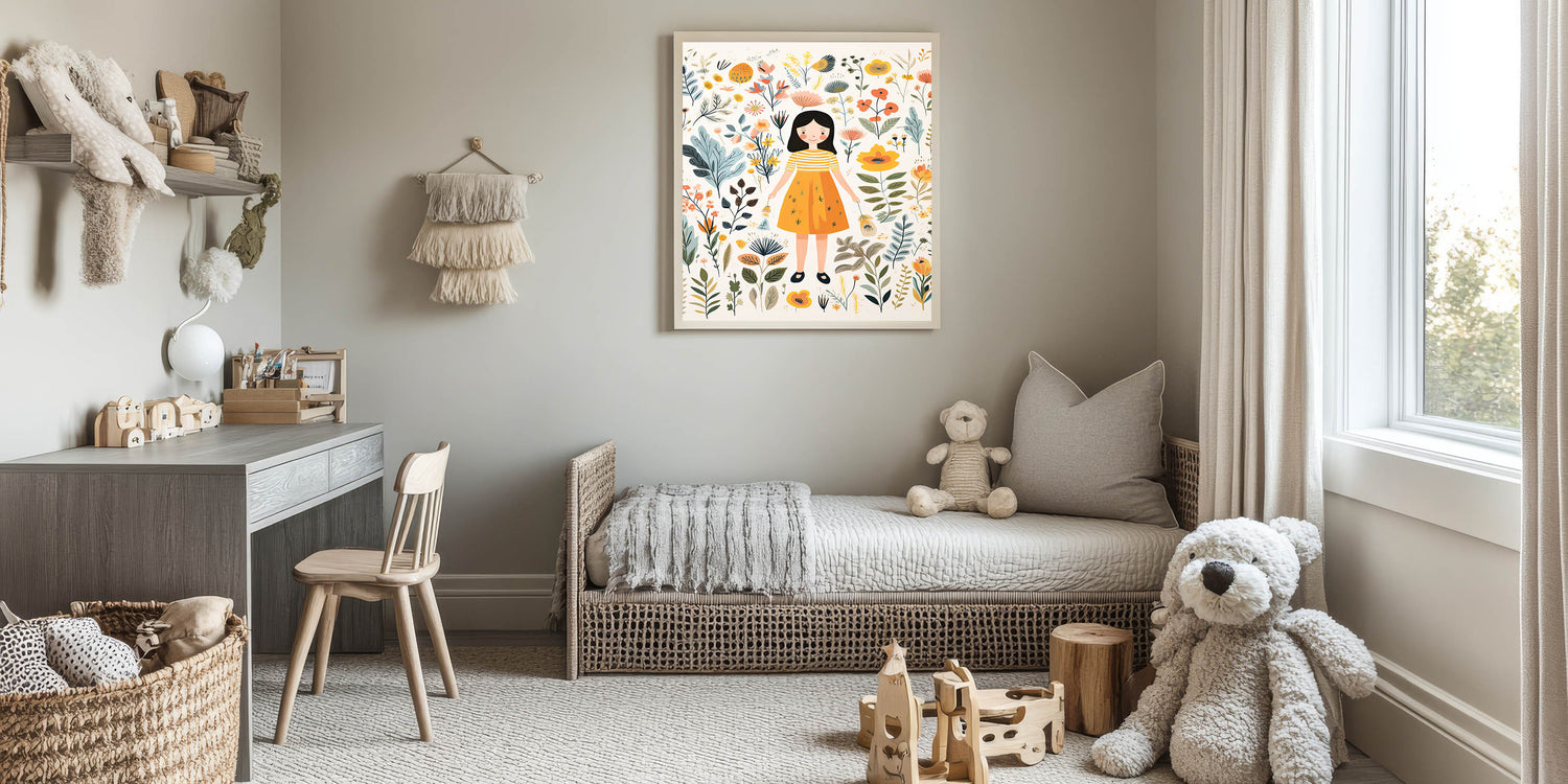 Create a magical and serene atmosphere in your child’s space with this Personalized Children's Art Print, featuring a sweet girl surrounded by delicate botanical elements. The warm yellow, beige, orange, and green hues create a soft and inviting design, perfect for nurseries, playrooms, and bedrooms.