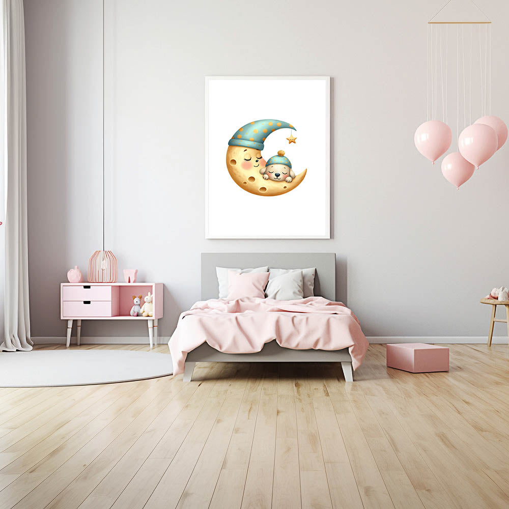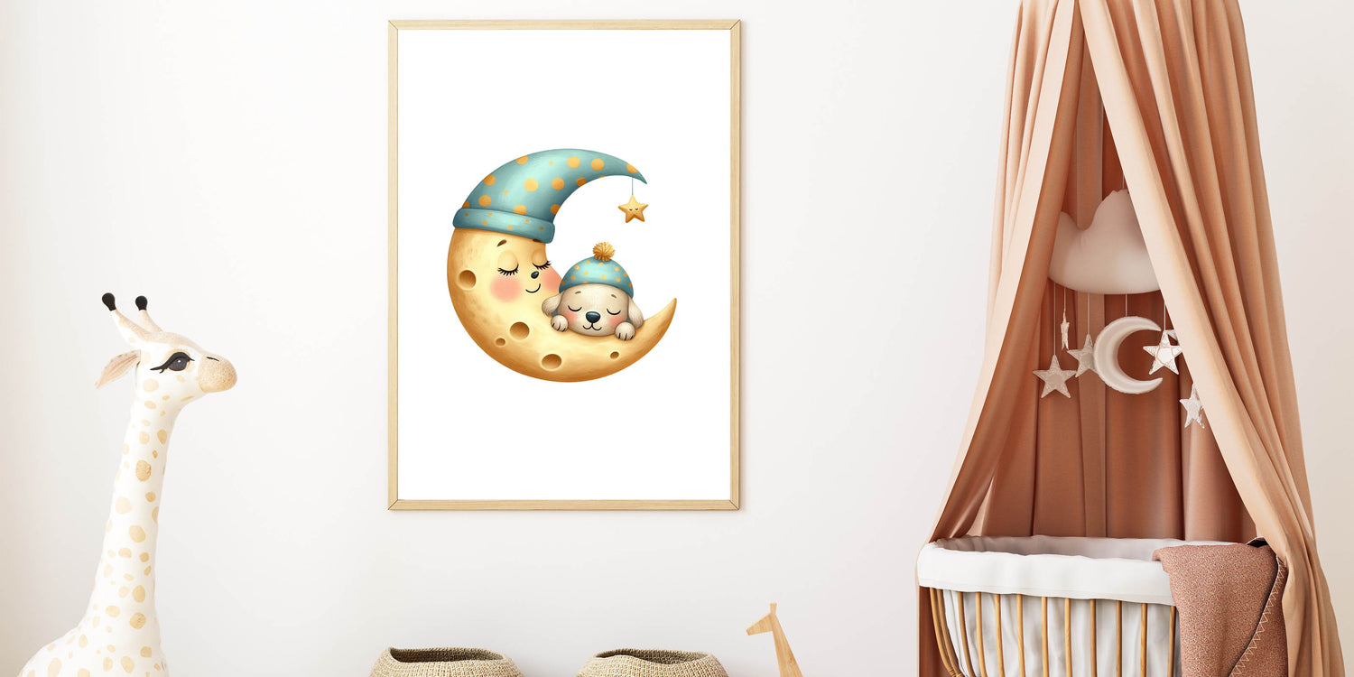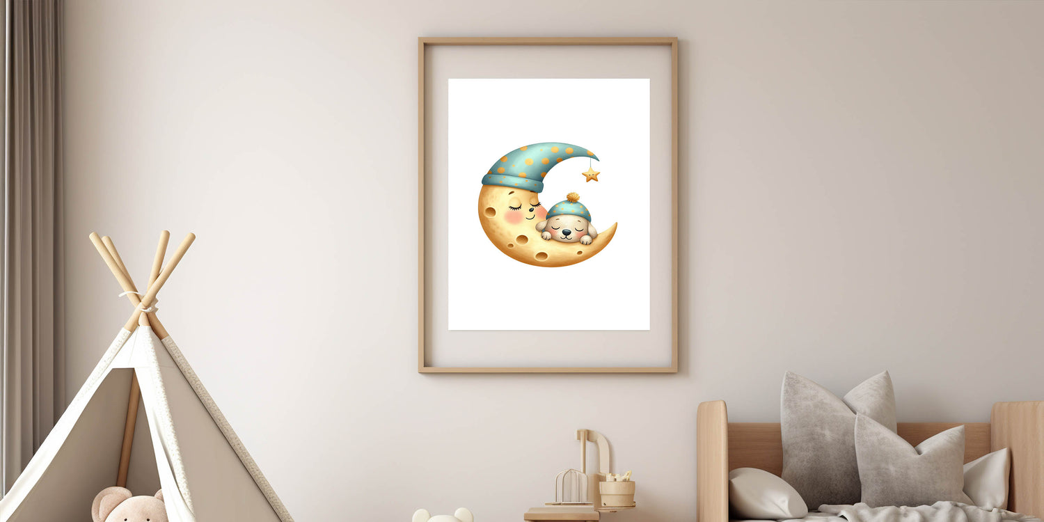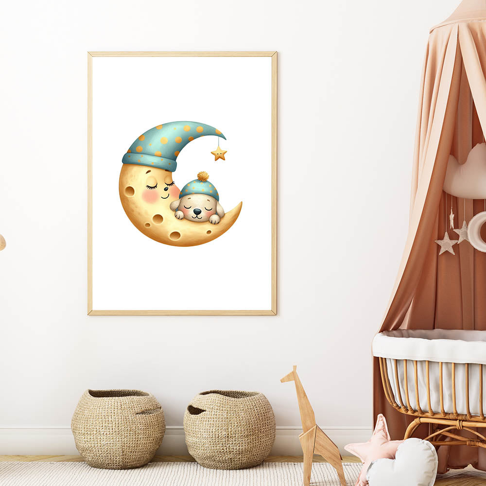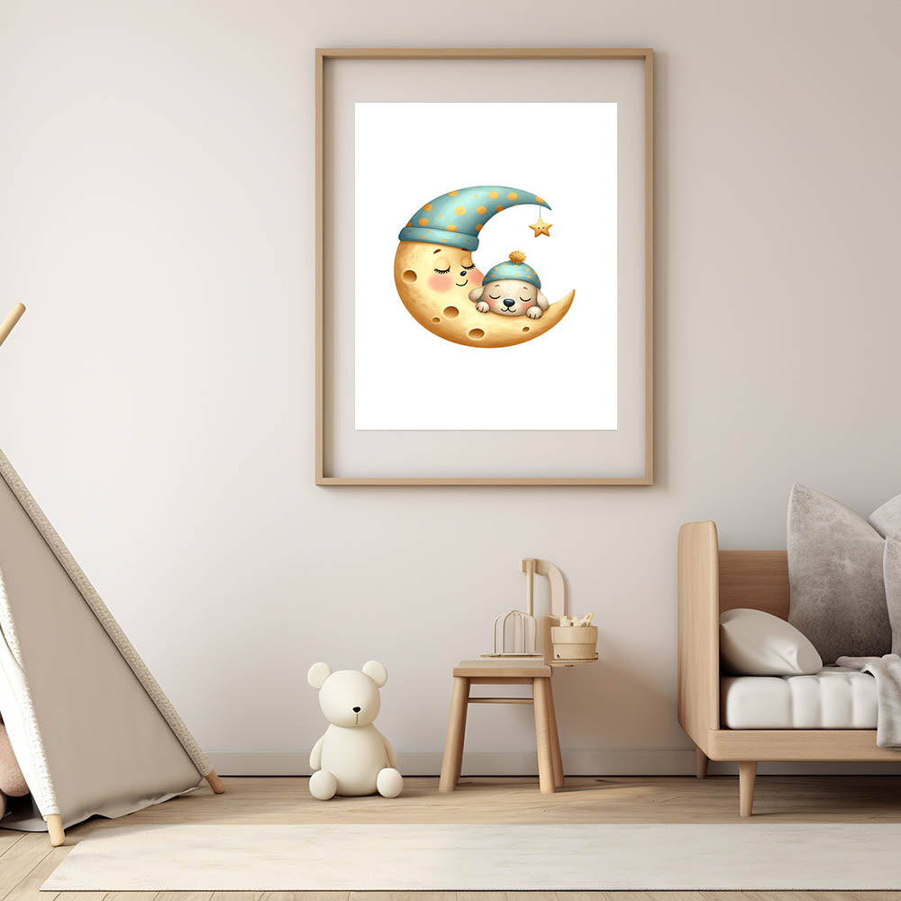Let your little one drift into dreamland with this high-quality sleeping moon & puppy art print.