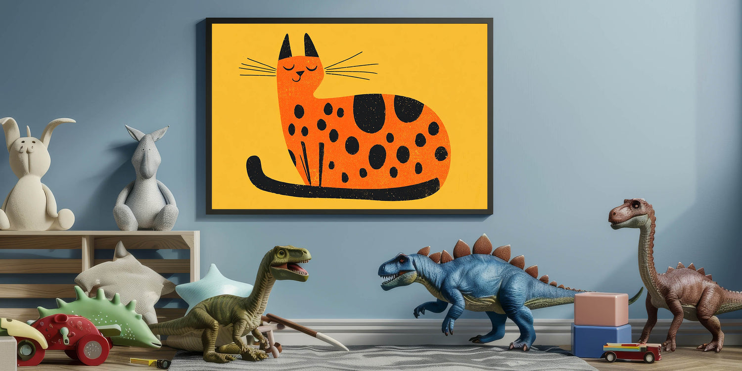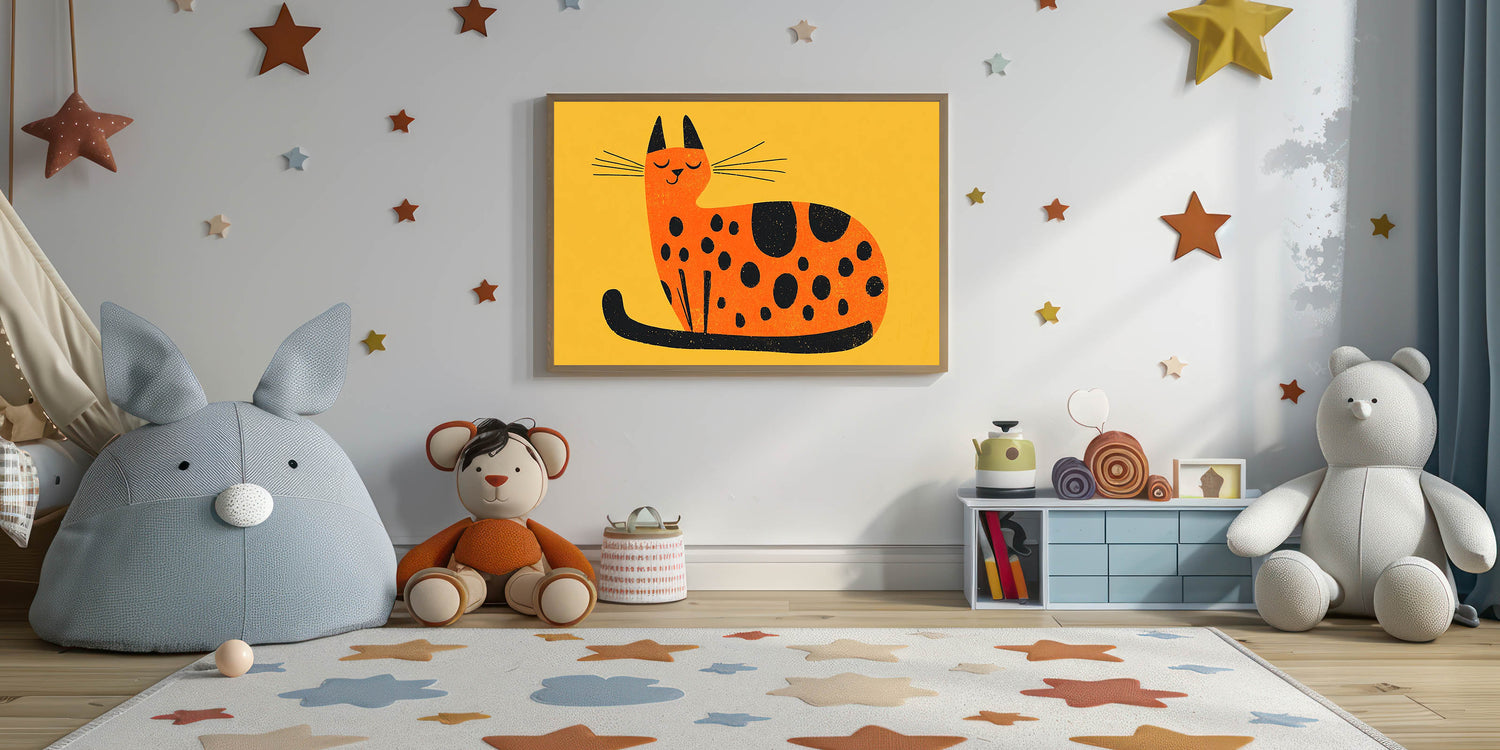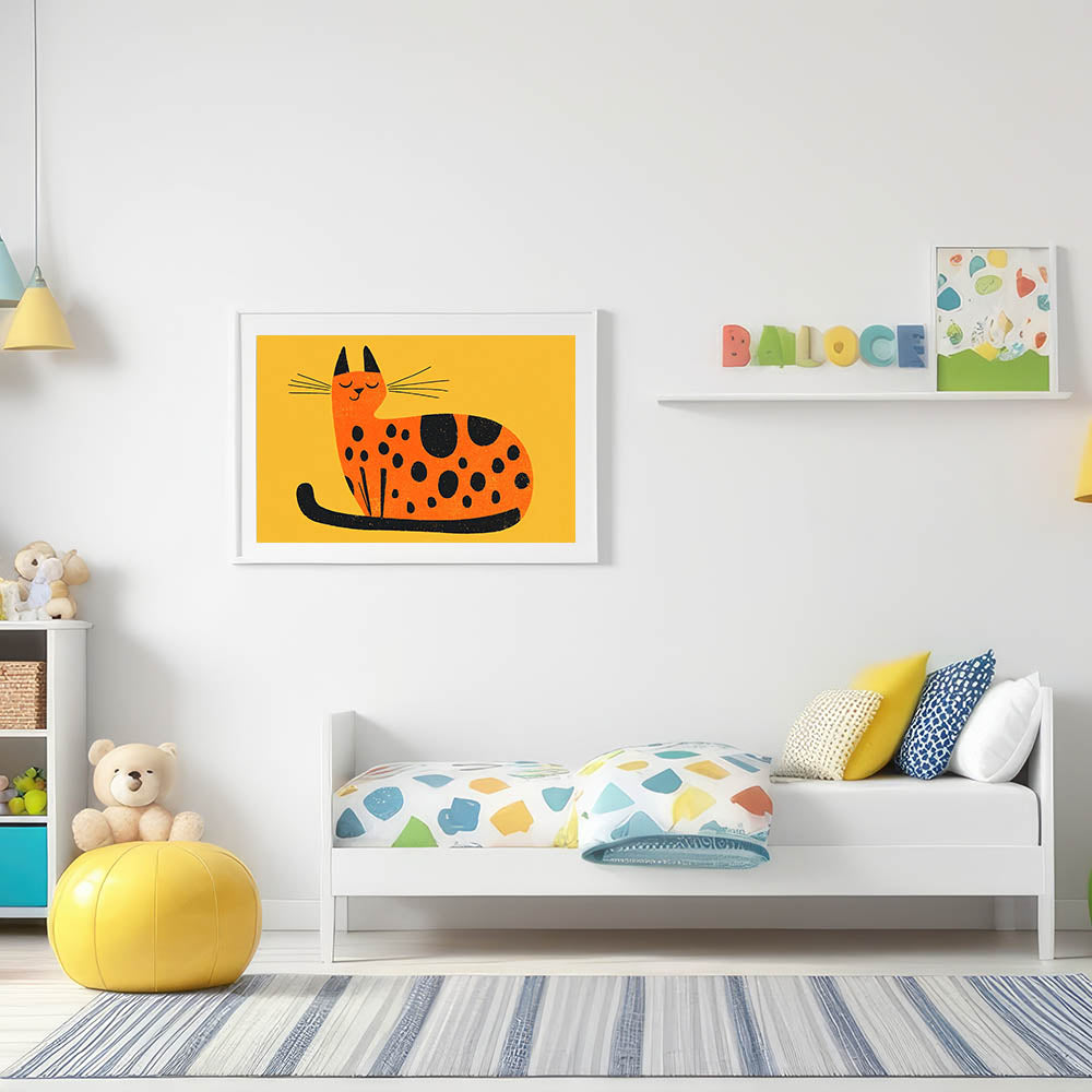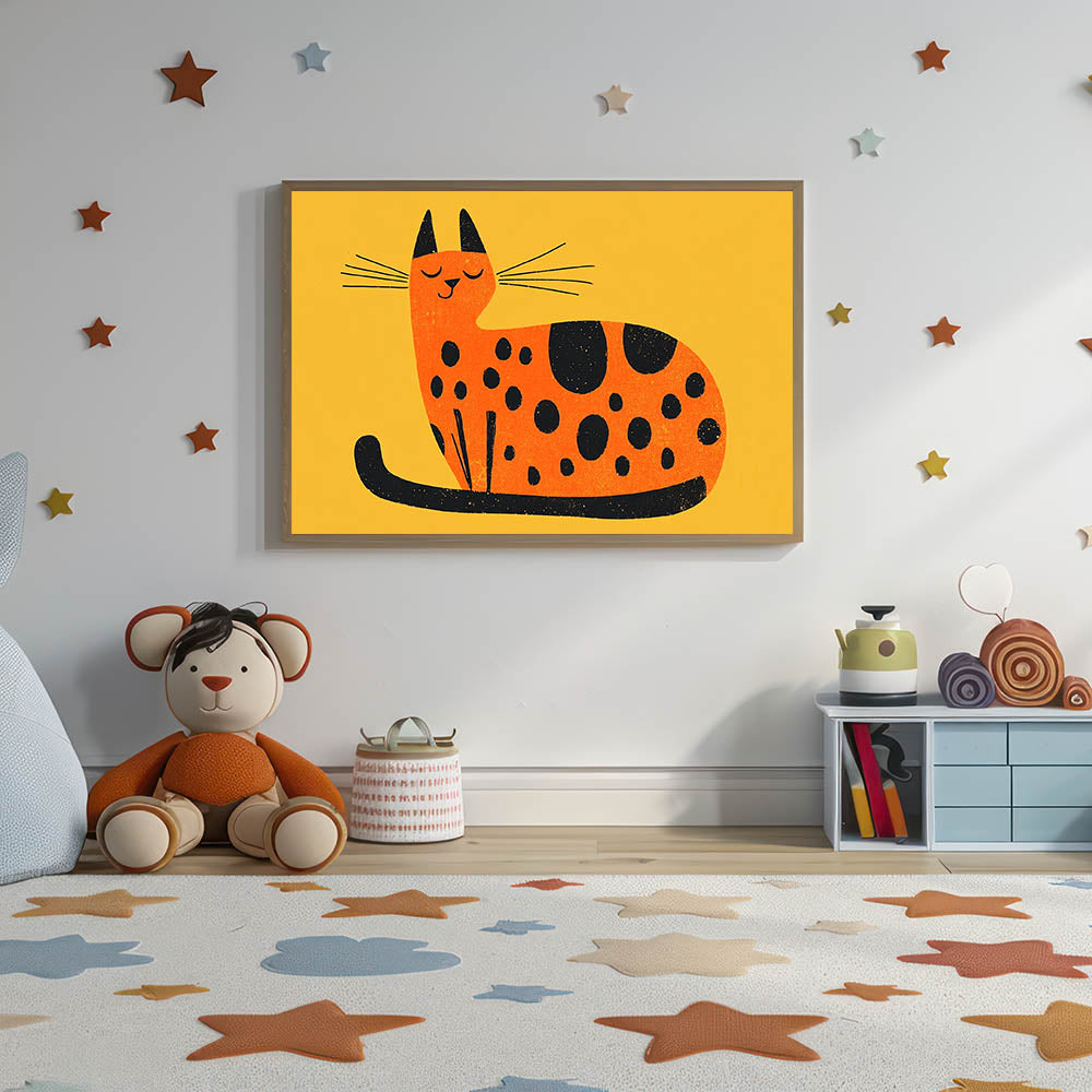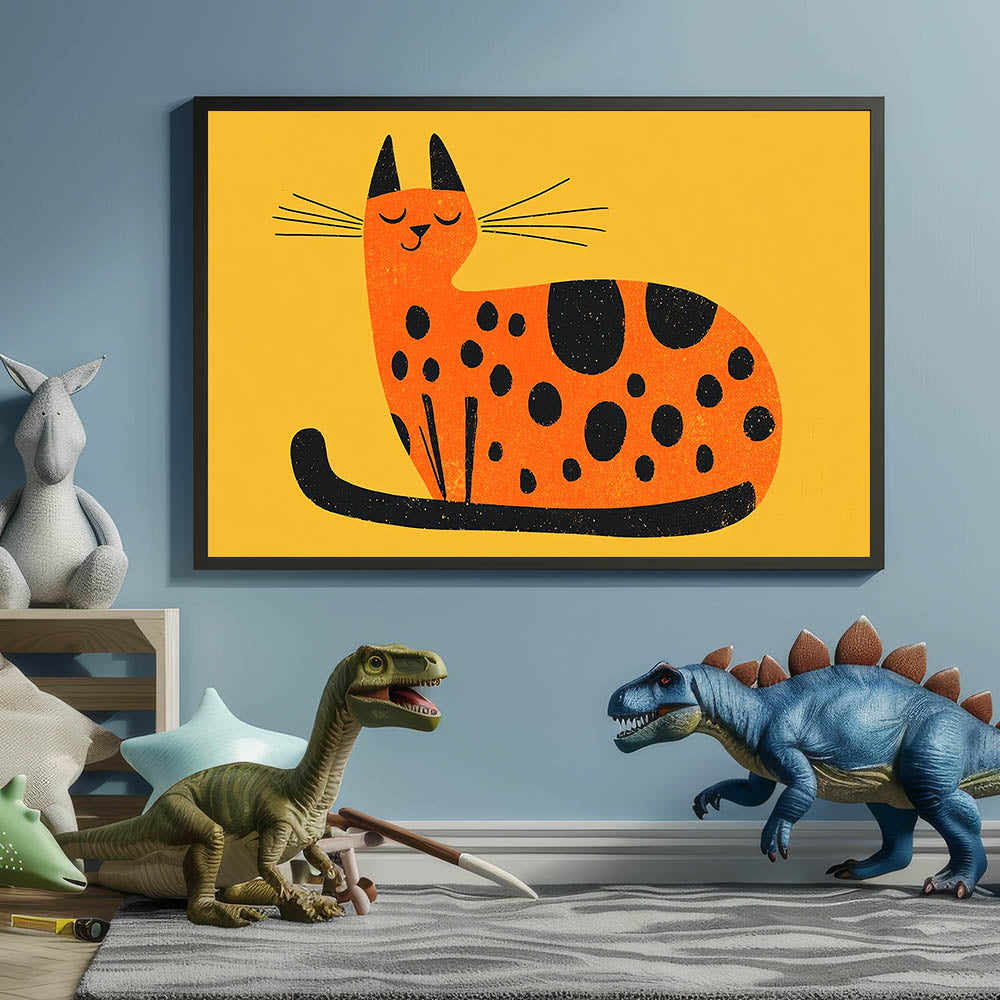 Bring a touch of whimsy to your child’s space with this Playful Orange Cat Boys Wall Art! This charming illustration features a stylized orange cat with bold black spots against a cheerful yellow background, creating a fun and modern artistic touch for any boys’ bedroom, playroom, or nursery.