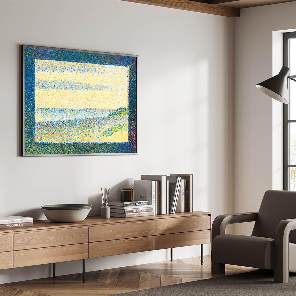 Celebrate the brilliance of Georges Seurat’s "Seascape (Gravelines)" (1890), a stunning example of Pointillism, blending Impressionist sensibilities with bold technique. This artwork captures the shimmering beauty of a coastal scene, with layers of blue, green, and yellow dots meticulously placed to evoke light, movement, and texture. The vibrant color palette and intricate design make this piece a statement for any space.