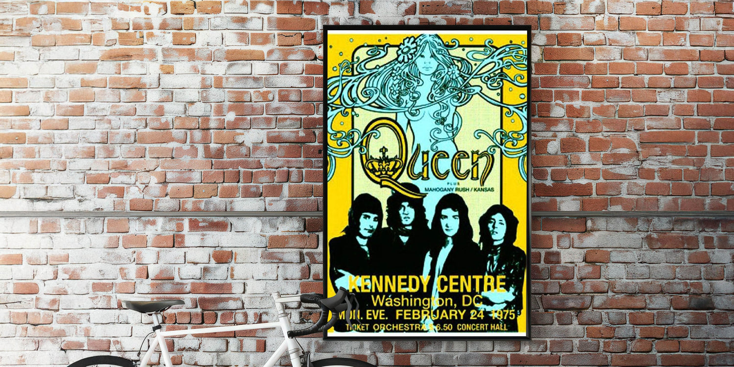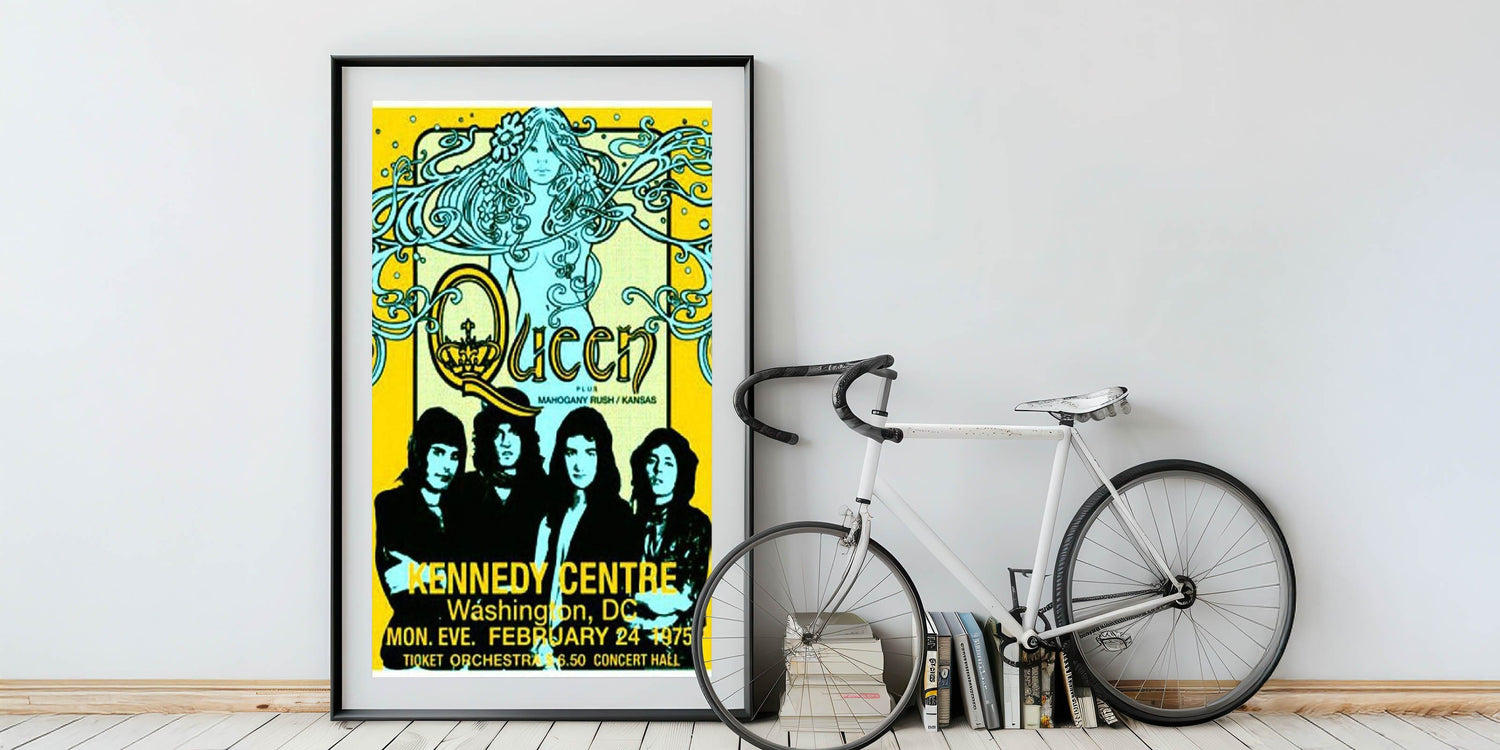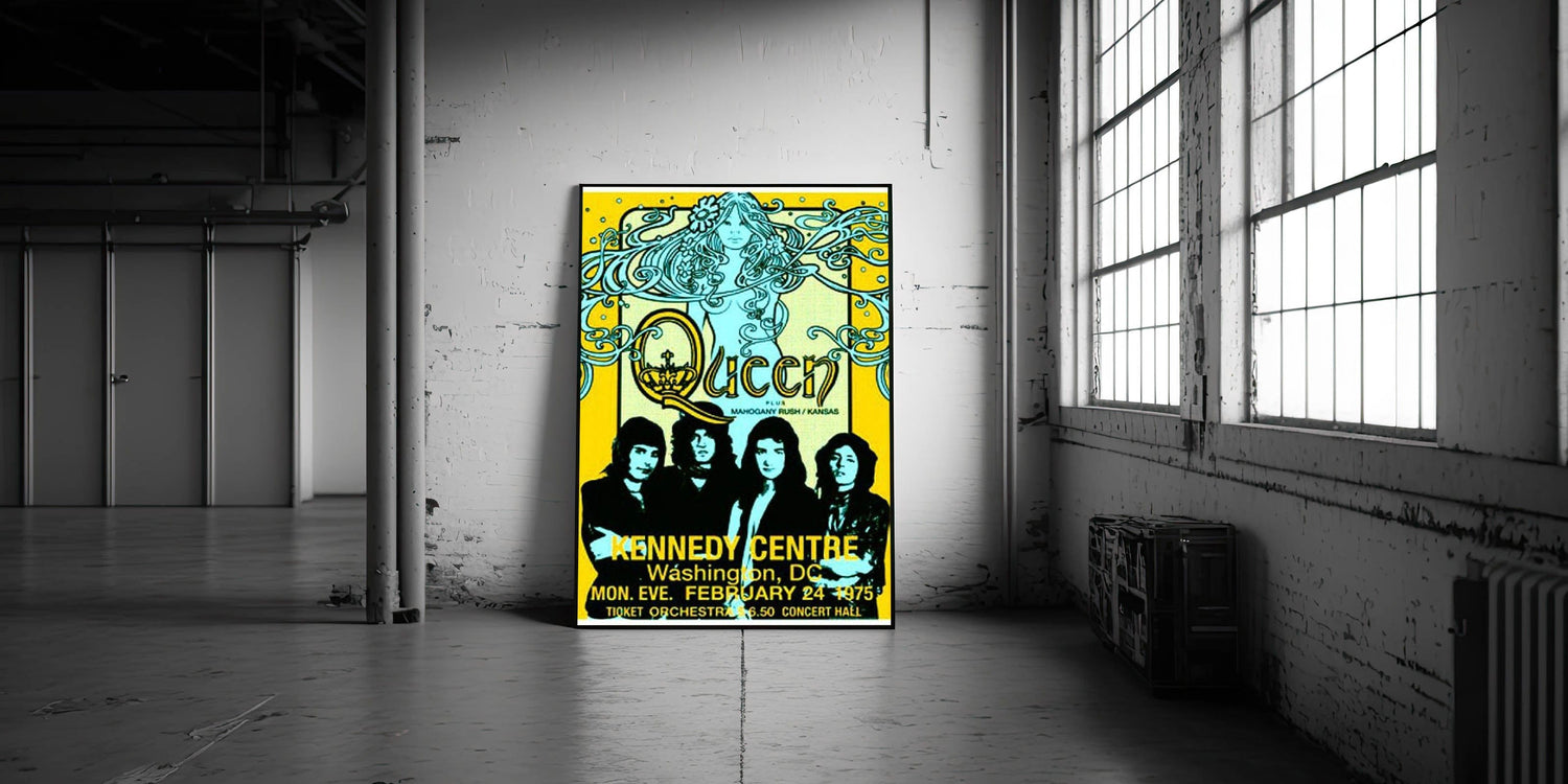 - Vintage Queen poster from the band's performance at the Kennedy Centre on February 24, 1975.
